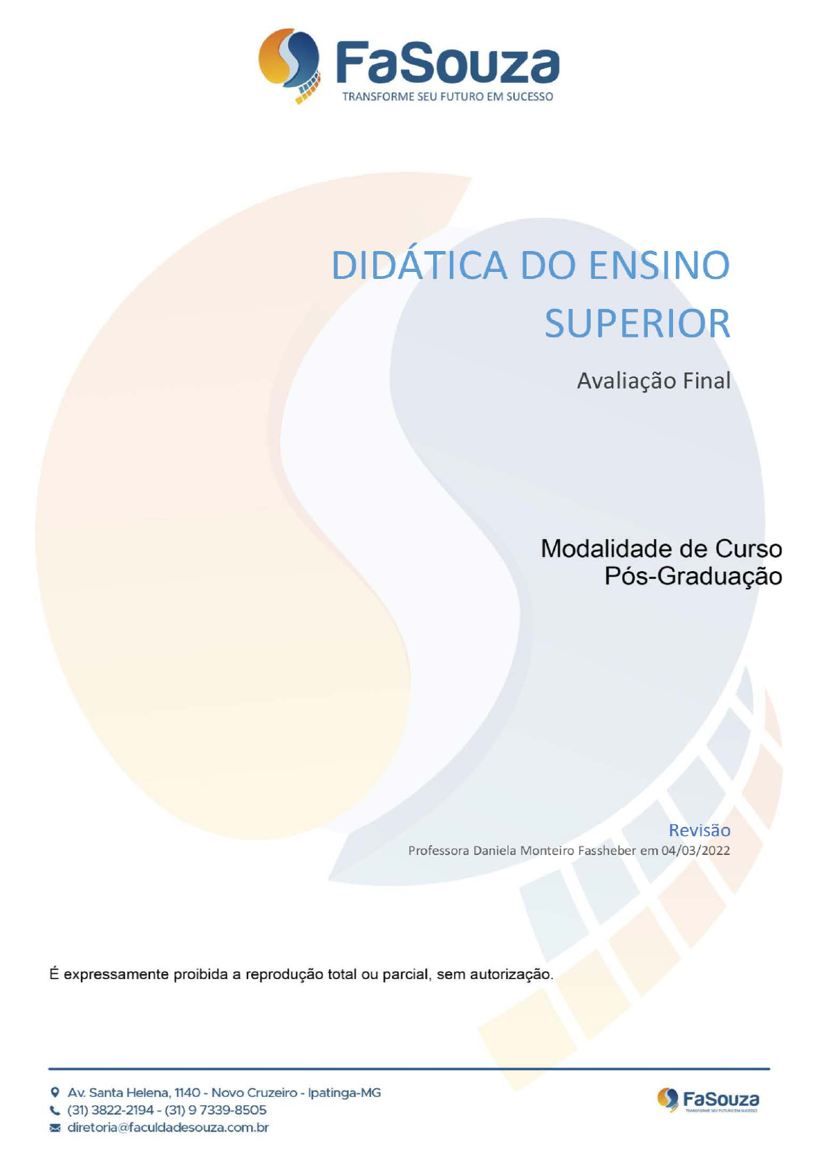 iJ FaSouza ••♦• TRANSFORME SEU FUTURO EM SUCESSO DIDÁTICA DO ENSINO SUPERIOR Avaliação Final Modalidade de Curso Pós-Graduação Revisão Professora Daniela Monteiro Fassheber em 04/03/2022 É expressamente proibida a reprodução total ou parcial, sem autorização. O Av. Santa Helena, 1140 - Novo Cruzeiro - lpatinga-MG \. (31) 3822-2194 - (31) 9 7339-8505 ~ diretoria@faculdadesouza.com .br li FaSouza ••• • TRANSFORME SEU FUTURO EM SUCESSO Página 1 de 7 Questão 01 - Sobre Didática, marque V (verdadeiro ou F ( falso) 1 - Na antiguidade Romana, representava uma ação de ensinar presente nas relações entre os mais velhos e os jovens, crianças e adultos, na família e nos demais espaços sociais e públicos. 11 - Um dos objetivos principais da didática em seu nascimento era romper com a visão hegemônica de educação presente na idade média. Ili - A Didática apresenta como um estudo e uma disciplina que propõe criar as condições de ensino como uma pratica social viva. Marque a opção correta. a) 1 e 11 são verdadeiras b) Todas são verdadeiras c) 1 e Ili são verdadeiras d) li e Ili são verdadeiras Questão 02 - De acordo com a apostila. Marque a opção que define ENSINAGEM (ação de ensinar). a) É o processo pelo qual se adquire, assimila e transforma conhecimentos, habilidades, competências, comportamentos e valores. b) modelo de ensino é incentivar que a comunidade acadêmica desenvolva a capacidade de absorção de conteúdos de maneira autônoma e participativa. c) É um termo utilizado na área educacional que caracteriza o conjunto de atividades planejadas e interligadas para o ensino de um conteúdo. É expressamente proibida a reprodução total ou parcial, sem autorização. O Av. Santa Helena, 1140 - Novo Cruzeiro - lpatinga-MG \. (31) 3822-2194 - (31) 9 7339-8505 ~ diretoria@f aculdadesouza.com.br Juliene Realce Juliene Realce Juliene Realce Juliene Realce li FaSouza ••• • TRANSFORME SEU FUTURO EM SUCESSO Página 2 de 7 d) É definida na relação com a de aprender, o que possibilita o desenvolvimento do método dialético de ensinar. O ato de ensinar compreende a necessidade de um resultado bens sucedido do ensino. Questão 03 - conforme a apostila, marque a opção INCORRETA acerca das dinâmicas de ensino. a) Mapa conceituai , seminários, painel e tempestade cerebral b) Brainwriting, divagação, ensino em grandes grupos e desenhos individuais. c) Pensamento criativo, mímica, mapa mental e fórum. d) Palestras, associação de ideias, portifólio e mapa mental Questão 04 - Devido a esses problemas, as censuras vão se avolumando. Hoje, só se fala em construção do próprio conhecimento, participação ativa do aluno, reflexão crítica, aprendizagem significativa, investigativa, como opções novas para substituir a simples aula expositiva, que chega a ser tratada como inimiga. Sim, as mudanças ocorrem inevitavelmente, mas não ocorrem com data marcada. Impõem-se lentamente, conforme vão sendo acolhidas pelas pessoas e, depois de instaladas, permanecem. Alguns se opõem, mas a pressão dos 36017 novos tempos e o peso da aceitação geral os fazem ceder. https://educere.bruc.com.br/arquivo/pdf2015/21752_ 10083.pdf De acordo com a apostila, o professor ao usar a aula expositiva, deve dispor de diferentes habilidades de comunicação e exposição. Marque a opção CORRETA, a qual aponta a habilidade. a) Desestimular a emoção para que o aluno possa de forma racional , aprender o conteúdo; É expressamente proibida a reprodução total ou parcial, sem autorização. O Av. Santa Helena, 1140 - Novo Cruzeiro - lpatinga-MG \. (31) 3822-2194 - (31) 9 7339-8505 ~ diretoria@f aculdadesouza.com.br Juliene Realce li FaSouza ••♦• TRANSFORME SEU FUTURO EM SUCESSO Página 3 de 7 b) Quando for enfatizar ideias, deve manifestar expressões faciais, corporais e variar o volume da voz. c) Combinar a exposição oral com apresentação de slides. d) Ser rígido, desencorajando os alunos a expressar e discutir seus pontos de vistas. Questão 05 - Em relação as estratégias de Ensinagem aplicadas no ensino superior é INCORRETO afirmar. a) O debate é caracterizado por uma troca de ideias entre duas pessoas ou mais pessoas sobre um determinado assunto, proposto pelo professor e, com a separação da turma em grupos, os quais possam expor suas opiniões. b) Os jogos são atividades físicas ou mentais, além de lúdicas, organizadas por um sistema de regras. Tendo como uma das vantagens a necessidade de controlar o tempo de atividade administração de conflitos. c) A dramatização significa a representação, pelos alunos, de um fenômeno ou fato, de modo planejado ou espontâneo. Trata-se de uma técnica ativa e socializada que integra as dimensões cognitiva e afetiva no processo de ensino. d) Fichas didáticas é uma técnica que consiste em colocar à disposição dos alunos, fichas didáticas essenciais ao estudo de um determinado conteúdo. Questão 06 - De acordo com a apostila, marque a opção CORRETA em relação as fases do desenvolvimento do método didático, apontado por Piletti. a) Atividades iniciais; elaboração da atividade; execução; feedback e verificação da aprendizagem. É expressamente proibida a reprodução total ou parcial, sem autorização. O Av. Santa Helena, 1140 - Novo Cruzeiro - lpatinga-MG \. (31) 3822-2194 - (31) 9 7339-8505 ~ diretoria@f aculdadesouza.com.br Juliene Realce Juliene Realce li FaSouza ••• • TRANSFORME SEU FUTURO EM SUCESSO Página 4 de 7 b) Elaboração das atividades; atividades iniciais; validação das atividades; execução e atividades conclusivas. e) Planejamento das atividades; elaboração das atividades; execução das atividades; feedback e verificação das atividades. d) Atividades iniciais; planejamento das unidades; execução; atividades conclusivas e verificação da aprendizagem. Questão 07 - A formação de professores e a construção da identid