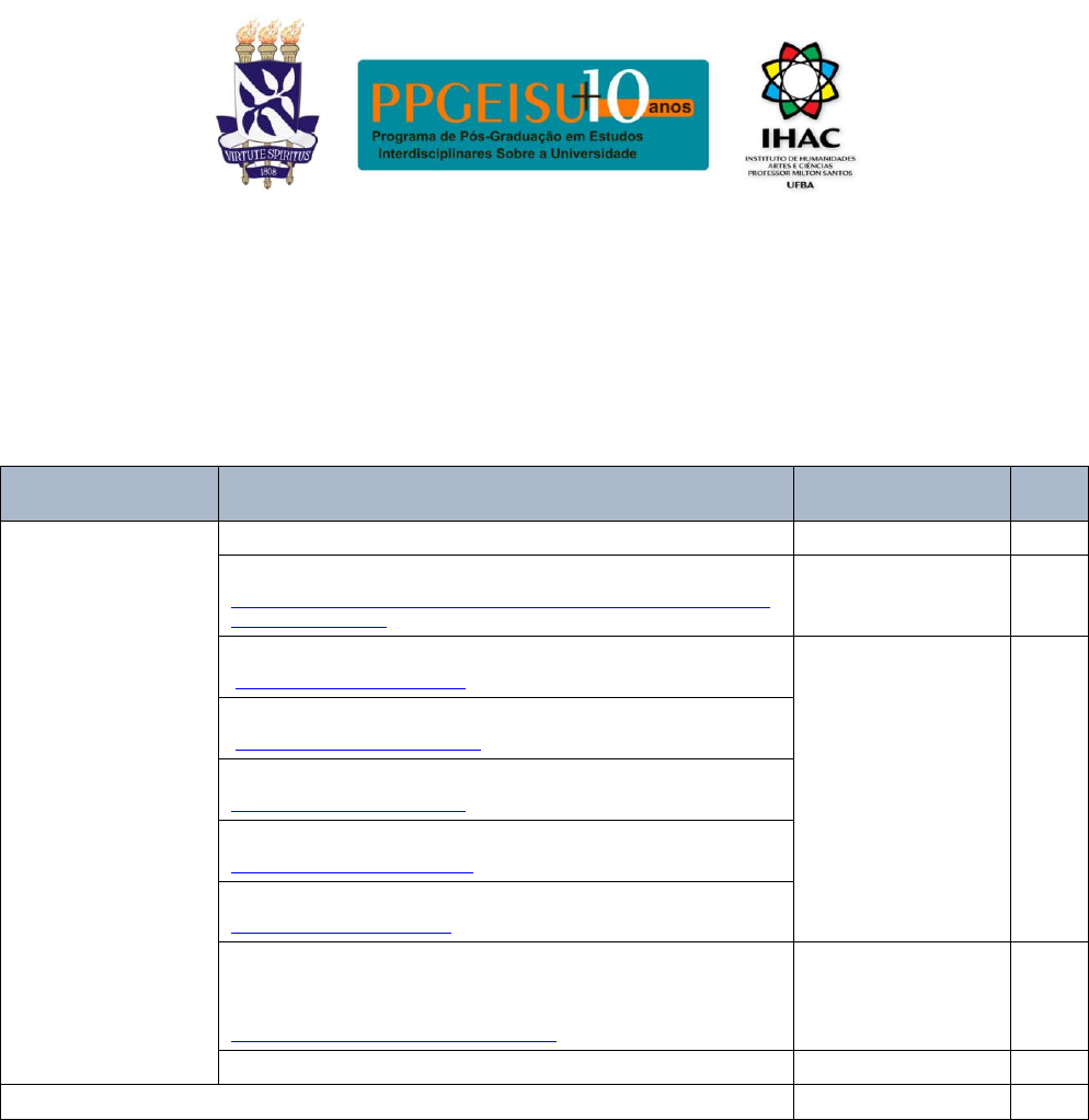 Roteiro da Trilha de Aprendizagem Curso de extensão: Como elaborar projetos de pesquisa 1ª. Trilha de aprendizagem – 22 a 29 jul./2024 Conteúdos Descrição da atividade Tempo de dedicação do cursista (h) Nota Definição do tema, problema e objetivos da pesquisa Participe do fórum de autoapresentação e expectativas 15 min - Participe da aula síncrona: terça-feira, 23/07 – 19h https://conferenciaweb.rnp.br/ufba/curso-de-extensao-elaboracao-de- projeto-de-pesquisa 2h - Assistir a videoaula: tema, problema e objetivos e justificativa https://youtu.be/oGARHm5trk 1h - Assistir a videoaula: Projeto de pesquisa – construção https://youtu.be/UEecFn0nNmo Assistir a videoaula: Tema de pesquisa: erros comuns https://youtu.be/WbEJvrDzRj8 Assistir a videoaula: Pergunta problema e objetivos https://youtu.be/FFVex0U4z6M Assistir a videoaula: Objetivo geral e específicos https://youtu.be/disr6-Cof3M Realizar as leituras: Prodanov e Freitas (2013, p. 120-125) https://bit.ly/3VcMZE3 Aragão e Mendes Neta (2017, p. 27-33) http://repositorio.ufba.br/ri/handle/ri/29414 3h - Prova online (Trilha 1) 3h45 30 Subtotal 10h 30,0 https://conferenciaweb.rnp.br/ufba/curso-de-extensao-elaboracao-de-projeto-de-pesquisa https://conferenciaweb.rnp.br/ufba/curso-de-extensao-elaboracao-de-projeto-de-pesquisa https://youtu.be/oGARHm5trk https://youtu.be/UEecFn0nNmo https://youtu.be/WbEJvrDzRj8 https://youtu.be/FFVex0U4z6M https://youtu.be/disr6-Cof3M https://bit.ly/3VcMZE3 http://repositorio.ufba.br/ri/handle/ri/29414
