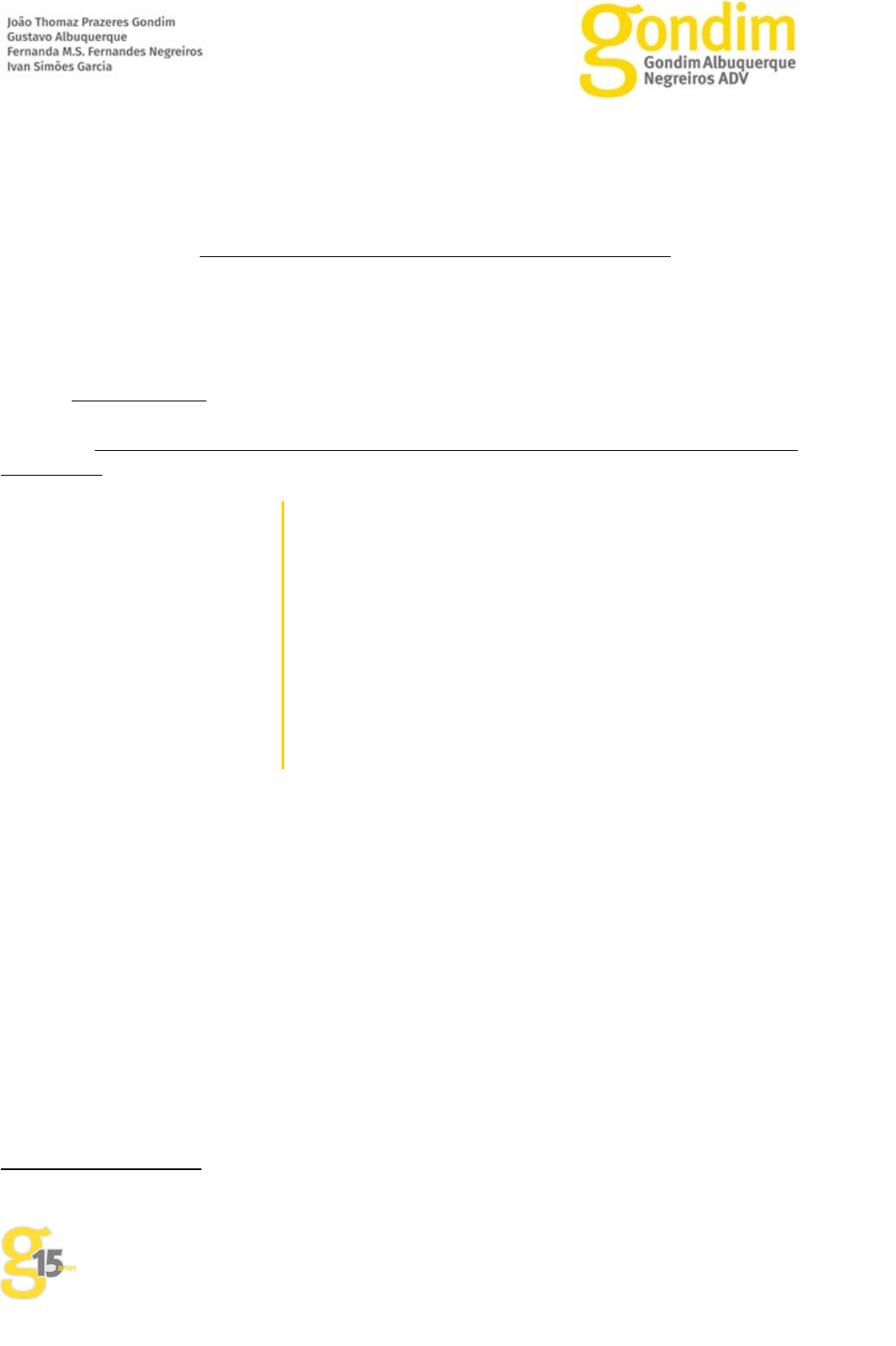 Ausência de Prova da Negativação A parte autora não produziu a prova mais elementar de sua pretensão: a comprovação de que o seu nome foi/está inscrito nos cadastros restritivos de crédito. Trata-se de prova mínima dos fatos constitutivos do direito pleiteado. Deve-se dizer que essa prova é de facílima obtenção, seja junto ao órgão mantenedor do cadastro, seja pela Internet ou, até mesmo, em agências dos Correios. A inversão do ônus da prova não isenta o consumidor de produzir provas mínimas dos fatos que alega. O STJ entende que a hipótese é “excepcional”; que a referida inversão exige a verossimilhança das alegações autorais; e que a redistribuição do ônus probatório é condicionada à dificuldade do consumidor em obter a prova necessária para comprovação de sua tese[footnoteRef:2], o que não é o caso quando a prova em questão é um simples comprovante de negativação. [2: STJ, 4ª Turma, AgRg no REsp 1.335.475/RJ. Relatoria: Ministro Luis Felipe Salomão. Julgado em 23.10.2012, publicado em 06.11.2012.] […] Com efeito, não ficou comprovado nos autos que o nome do autor tenha sido lançado no rol dos inadimplentes pelo débito indevidamente cobrado pela ré apelante. Assim, a divergência e desencontro que ele vivenciou no constante dos autos, a despeito de sua razão, por si só não são capazes de causar danos morais para a reparação pleiteada, mesmo que reprovável a conduta da ré em proceder à cobrança de dívida inexistente. Não se vislumbra, nesses fatos narrados, dano moral efetivo sofrido pelo autor, como violação de suas esferas de intimidade privacidade ou honra, a ensejar a condenação do réu em sua indenização. Inexistiu negativação de seu nome, ou qualquer outro elemento capaz de caracterizar referida violação. […] (TJ-SP, 21ª Câmara de Direito Privado, Apelação Cível nº 1066707-94.2018.8.26.0100. Relatoria: Des. Maia da Rocha. Julgado e publicado em 29.10.2018, grifado). Diante da constatação de que a parte autora não se desincumbiu do ônus de comprovar minimamente os fatos constitutivos de seu direito, na forma do art. 373, I, do CPC, pede-se, respeitosamente, a improcedência dos pedidos. Av. República do Chile 230, 29º Andar | Centro - Rio de Janeiro | 20031-170 T. (21) 2262.7979 | 3993.8878 UNIDADES São Paulo _ Av. das Nações Unidas 12901 Torre Norte Brooklin Paulista 04578-910 T. (11) 4950-5777 Vitória _ R. Américo Buaiz 501 sala 613 Enseada do Suá 29050-955 T. (27) 3345.1708 Belém _ Av. Senador Lemos 435 Ed. Village Boulevard sala 1804 Umarizal 66050-000 T. (91) 3351.6220 www.gondimadv.com.br 2 image2.png image1.png image3.jpeg