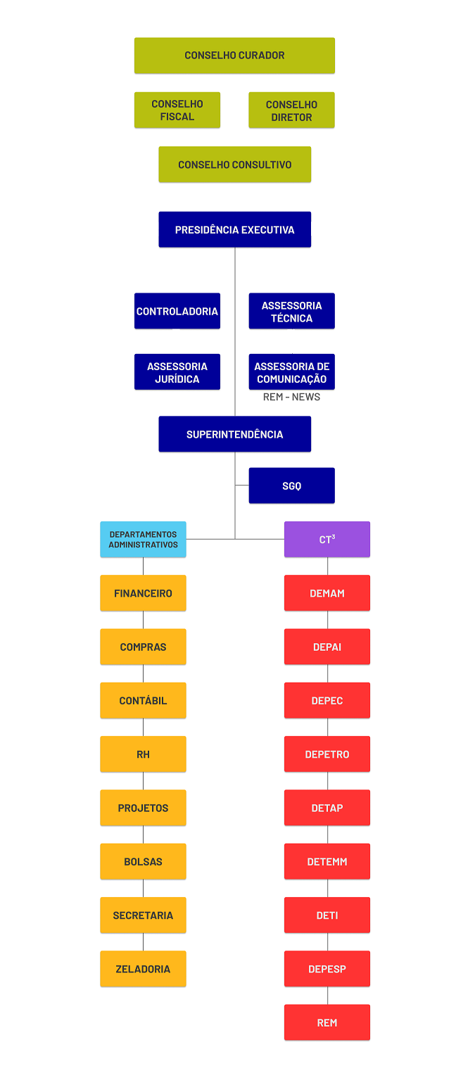 CONSELHO CURADOR CONSELHO CONSELHO FISCAL DIRETOR CONSELHO CONSULTIVO PRESIDÊNCIA EXECUTIVA ASSESSORIA CONTROLADORIA TÉCNICA ASSESSORIA ASSESSORIA DE JURÍDICA COMUNICAÇÃO SUPERINTENDÊNCIA DEPARTAMENTOS ADMINISTRATIVOS CT3 FINANCEIRO DEMAM COMPRAS DEPAI CONTÁBIL DEPEC RH DEPETRO PROJETOS DETAP BOLSAS DETEMM SECRETARIA DETI ZELADORIA DEPESP REM
