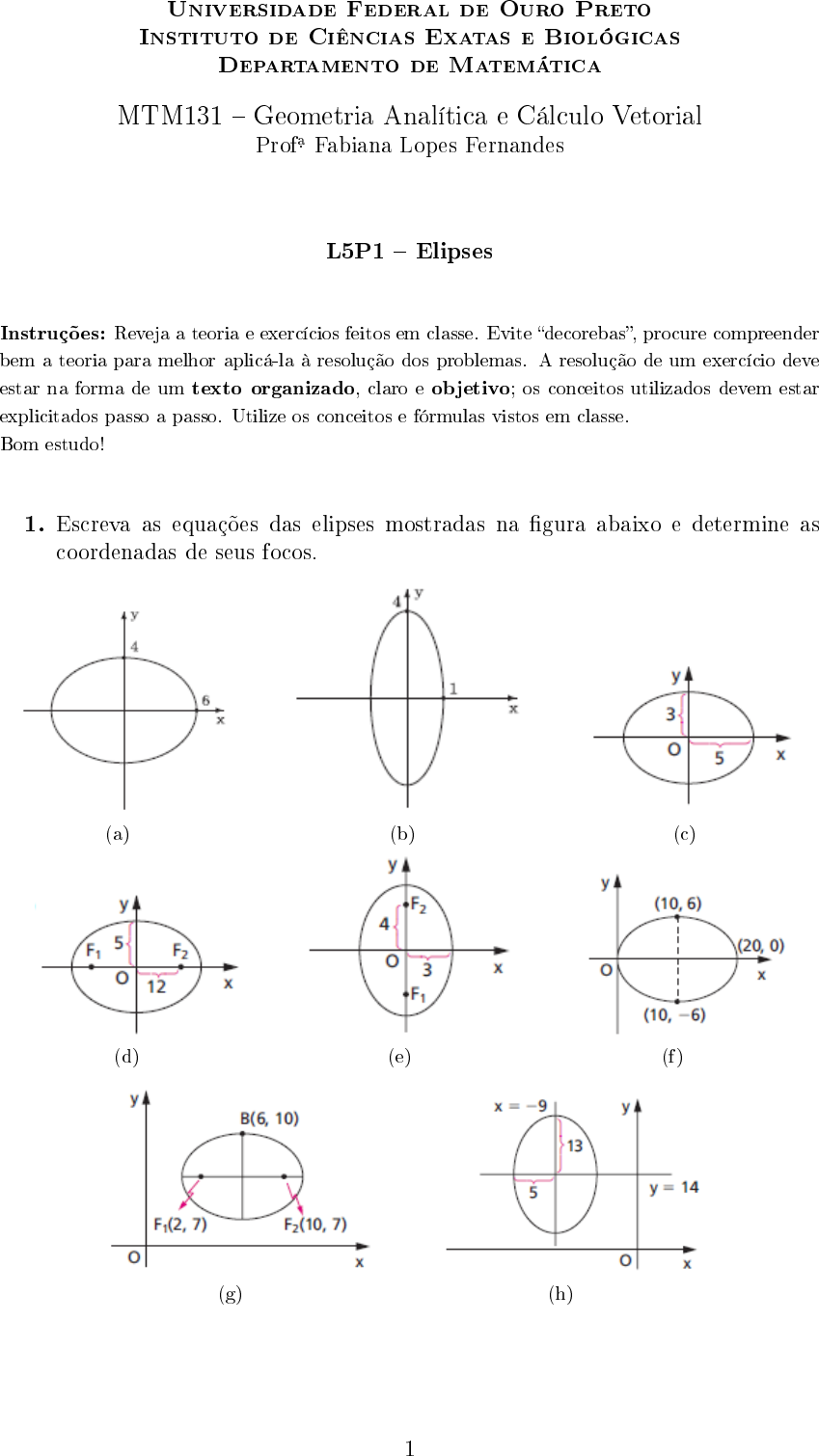 Universidade Federal de Ouro Preto Instituto de Ciências Exatas e Biológicas Departamento de Matemática MTM131 � Geometria Analítica e Cálculo Vetorial Profa. Fabiana Lopes Fernandes L5P1 � Elipses Instruções: Reveja a teoria e exercícios feitos em classe. Evite �decorebas�, procure compreender bem a teoria para melhor aplicá-la à resolução dos problemas. A resolução de um exercício deve estar na forma de um texto organizado, claro e objetivo; os conceitos utilizados devem estar explicitados passo a passo. Utilize os conceitos e fórmulas vistos em classe. Bom estudo! 1. Escreva as equações das elipses mostradas na �gura abaixo e determine as coordenadas de seus focos. (a) (b) (c) (d) (e) (f) (g) (h) 1 2. Em cada item, é dada a equação de uma elipse. Pede-se: (i) as coordenadas dos focos e vértices; (ii) o comprimento do eixo maior; (iii) o comprimento do eixo menor; (iv) esboço. (a) x2 4 + y2 9 = 1 (b) 225x2 + 289y2 = 65025 (c) 144x2 + 169y2 = 24336 3. Em cada item, determine a equação reduzida e faça um esboço da elipse que satisfaz às condições dadas: (a) focos (±3, 0) e passsa pelo ponto P = (0, 4); (b) centro na origem, um foco em (0, 3) e eixo maior de comprimento 10; (c) vértices ( ±5 2 , 0 ) e focos ( ±3 2 , 0 ) ; (d) focos (0,±3) e eixo maior de comprimento 6 √ 3; (e) vértices (±2, 0) e passa pelo ponto Q = ( −1, √ 3 2 ) ; (f) centro em (4,−2), um vértice está em (9,−2) e, um foco, em (0,−2); (g) passa pelos pontos (2, 0), (−2, 0) e (0, 1). 4. Determine o lugar geométrico dos pontos do plano, cuja soma das distâncias aos pontos (0,±5) é igual a 26. Faça um esboço. 5. Em cada item, determine os pontos em que a reta r intercepta a elipse de equação dada. Faça um esboço no plano cartesiano assinalando os pontos de interseção. (a) r : 5x+ y = 5, elipse: 25x2 + y2 = 25 (b) r : x+ 2y = 6, elipse: x2 + 4y2 = 20 6. Obtenha equações das tangentes à elipse λ : 4x2 + 9y2 = 36 que passam pelo ponto (7, 2) e faça um esboço. 7. A �gura abaixo, mostra o vão da entrada de um armazém, pelo qual deverá passar um caminhão que tem 4 metros de largura. Determine a altura máxima que o caminhão pode ter, sabendo que o arco superior do vão é semi-elíptico. 8. O teto de saguão, com 10m de largura, tem o formato de uma semielipse com 9m de altura no centro e 6m de altura nas paredes laterais. Determine a altura do teto a 2m de cada parede. 2 9. O arco de uma ponte tem o formato de uma semielipse com um vão horizontal de 40m e com 16m de altura no centro. Qual a altura do arco a 9m à esquerda ou à direita do centro? 10. Dertermine o valor da constante m para que a reta r : y = mx+8 seja tangente à elipse 16x2 + 25y2 = 400. 11. Conduza por O = (0, 0) as retas t que são tangentes à elipse λ : x2 + 4y2 − 16y + 12 = 0. 12. Seja a elipse E : x2 + 4y 2 = 4. Determine a equação do lugar geométrico dos pontos P do plano, externos à elipse E , que são tais que as tangentes à elipse traçadas por P , sejam perpendiculares. RESPOSTAS 1. (a) x2 36 + y2 16 = 1; F = ( ±2 √ 5, 0 ) (b) x2 + y2 16 = 1; F = ( 0± √ 15 ) (c) x2 25 + y2 9 = 1; F = (±4, 0) (d) x2 169 + y2 25 = 1; F = (±12, 0) (e) x2 9 + y2 25 = 1; F = (0,±4) (f) (x− 10)2 100 + y2 36 = 1; F = (±8, 0) (g) (x− 6)2 25 + (y − 7)2 9 = 1 (h) (x+ 9)2 25 + (y − 14)2 169 = 1; F = (−9,±12) 2. (a) (i) F = ( 0,± √ 5 ) , V = (0,±3), P = (±2, 0); (ii) 6; (iii) 4. (b) (i) F = (±8, 0), V = (±17, 0), P = (0,±15); (ii) 34; (iii) 30. (c) (i) F = (±5, 0), V = (±13, 0) , P = (0,±12); (ii) 26; (iii) 24. 3. (a) x2 25 + y2 16 = 1 (b) x2 16 + y2 25 = 1 (c) x2 25/4 + y2 4/25 = 1 (d) x2 18 + y2 27 = 1 (e) x2 4 + y2 = 1 (f) (x− 4) 2 25 + (y + 2) 2 9 = 1 (g) x2 4 + y2 = 1 4. 169x2 + 144y2 = 24336 5. (a) (0, 5) e (1, 0) (b) (2, 2) e (4, 1) 3 6. y = 2 ou y = 7 10x− 29 10 7. 8 + 3 √ 3 2 m 8. 42 5 m 9. 4 5 √ 319 m 10. m = ±48 25 11. y = ± √ 3 2 x 12. x2 + y2 = 5 4