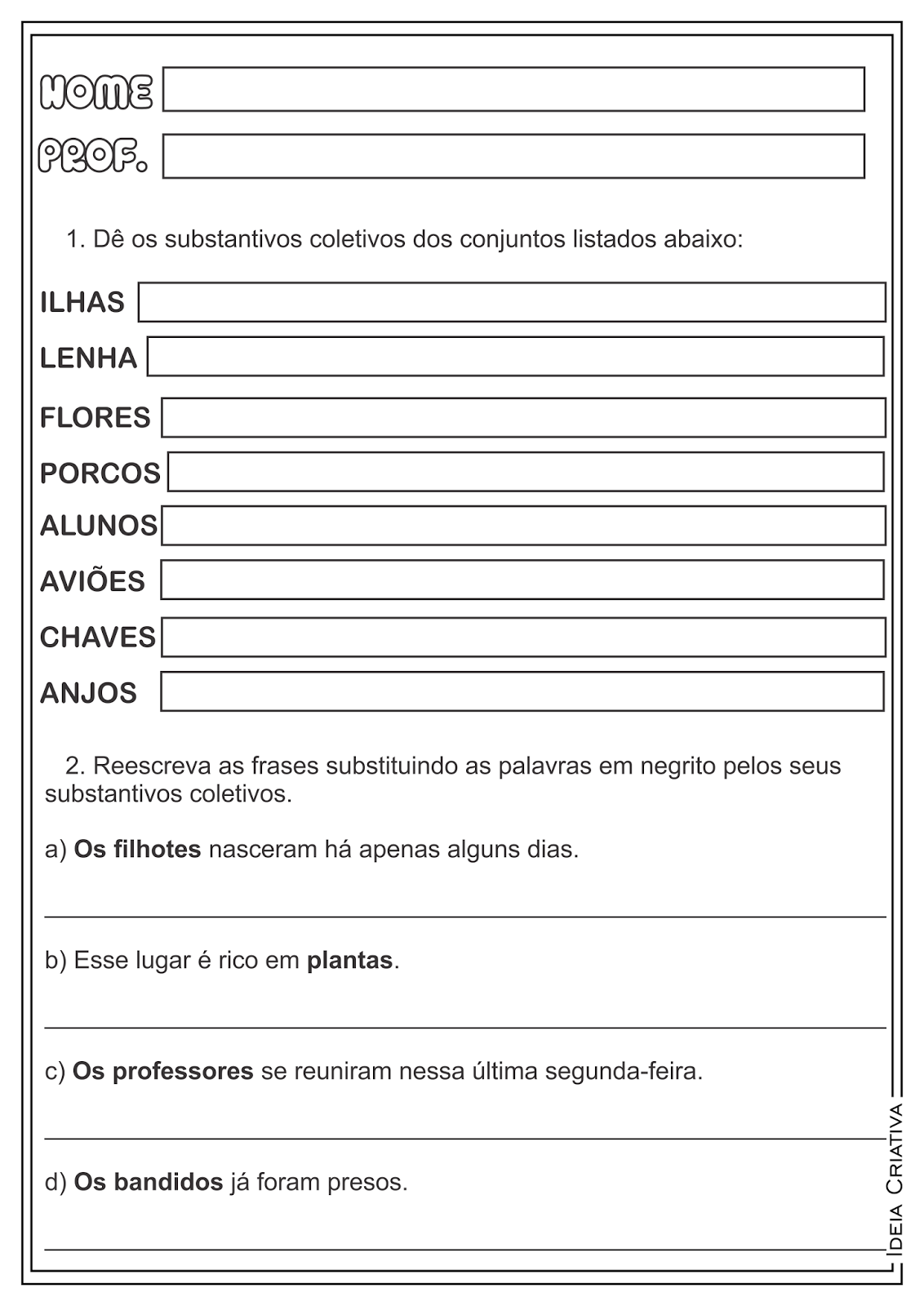HOME PROF. 1. Dê os substantivos coletivos dos conjuntos listados abaixo: ILHAS LENHA FLORES PORCOS ALUNOS AVIÕES CHAVES ANJOS 2. Reescreva as frases substituindo as palavras em negrito pelos seus substantivos coletivos. a) Os filhotes nasceram há apenas alguns dias. b) Esse lugar é rico em plantas. c) Os professores se reuniram nessa última segunda-feira. VA d) Os bandidos já foram presos.