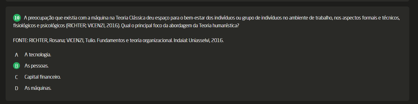 10 A preocupação que existia com a máquina na Teoria Clássica deu espaço para bem-estar dos indivíduos ou grupo de indivíduos no ambiente de trabalho, nos aspectos formais e técnicos, fisiológicos e psicológicos (RICHTER; VICENZI, 2016). Qual principal foco da abordagem da Teoria humanística? FONTE: RICHTER, Rosana; VICENZI, Tulio. Fundamentos e teoria organizacional. Indaial: Uniasselvi, 2016. A A tecnologia. As pessoas. Capital financeiro. D As máquinas.
