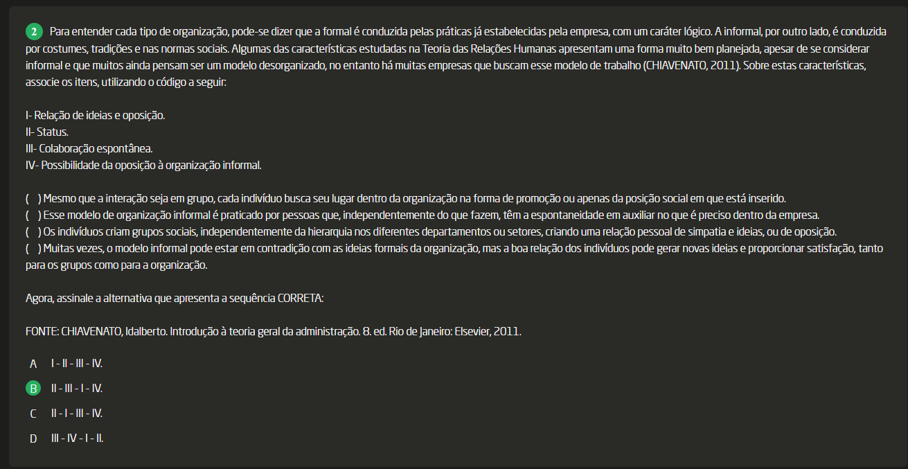 2 Para entender cada tipo de organização, pode-se dizer que a formal é conduzida pelas práticas já estabelecidas pela empresa, com um caráter lógico. A informal, por outro lado, é conduzida por costumes, tradições e nas normas sociais. Algumas das características estudadas na Teoria das Relações Humanas apresentam uma forma muito bem planejada, apesar de se considerar informal e que muitos ainda pensam ser um modelo desorganizado, no entanto há muitas empresas que buscam esse modelo de trabalho (CHIAVENATO, 2011). Sobre estas características, associe os itens, utilizando código a I- Relação de ideias e oposição. II- Status. III- Colaboração espontânea. Possibilidade da oposição à organização informal. ( ) Mesmo que a interação seja em grupo, cada indivíduo busca seu lugar dentro da organização na forma de promoção ou apenas da posição social em que está inserido. ( ) Esse modelo de organização informal é praticado por pessoas que, independentemente do que fazem, têm a espontaneidade em auxiliar no que é preciso dentro da empresa. ( ) Os indivíduos criam grupos sociais, independentemente da hierarquia nos diferentes departamentos ou setores, criando uma relação pessoal de simpatia e ideias, ou de oposição. ( ) Muitas vezes, modelo informal pode estar em contradição com as ideias formais da organização, mas a boa relação dos indivíduos pode gerar novas ideias e proporcionar satisfação, tanto para os grupos como para a organização. Agora, assinale a alternativa que apresenta a CORRETA: FONTE: Idalberto. Introdução à teoria geral da administração. 8. ed. Rio de Janeiro: Elsevier, 2011. A B III IV. D III IV II.