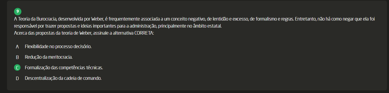 9 A Teoria da Burocracia, desenvolvida por Weber, é frequentemente associada a um conceito negativo, de lentidão e excesso, de formalismo e regras. Entretanto, não há como negar que ela foi responsável por trazer propostas e ideias importantes para a administração, principalmente no âmbito estatal. Acerca das propostas da teoria de Weber, assinale a alternativa CORRETA: A Flexibilidade no processo decisório. B Redução da meritocracia. Formalização das competências técnicas. D Descentralização da cadeia de comando.