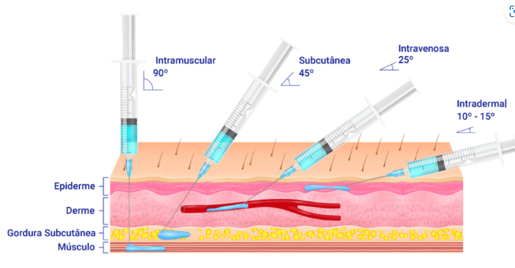 Intravenosa Intramuscular Subcutânea 25° Intradermal 10° - 15° A Epiderme Derme Gordura Subcutânea Músculo