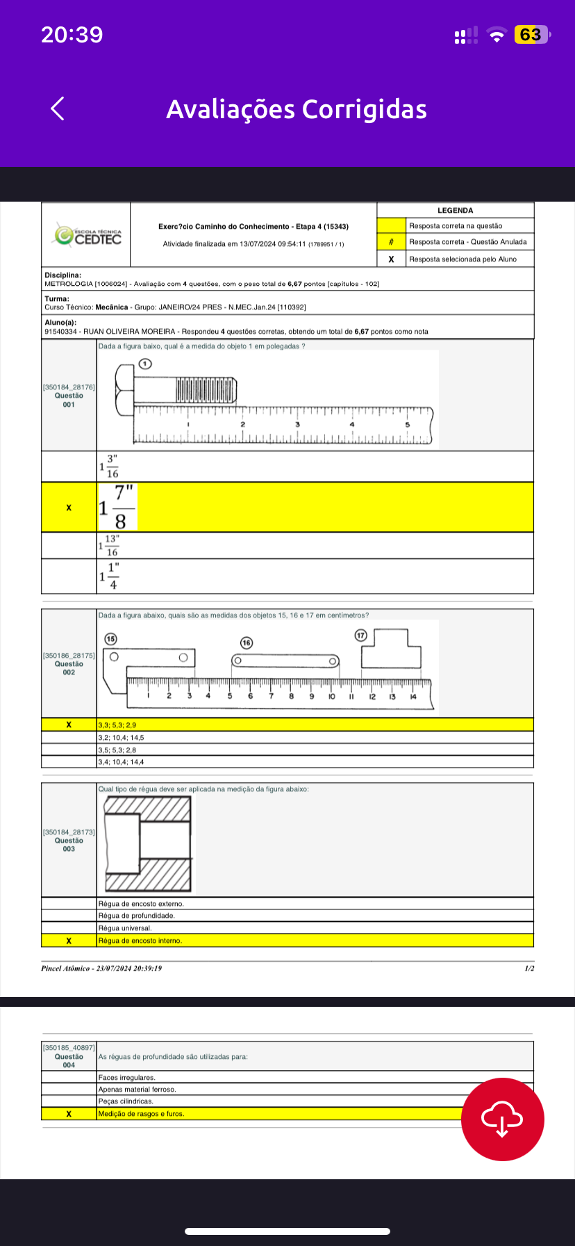 20:39 63 Avaliações Corrigidas LEGENDA Caminho do Conhecimento Etapa 4 (15343) Resposta correta na questão CEDTEC Atividade finalizada em 13/07/2024 09:54:11 (1789951 1) # Resposta correta Questão Anulada X Resposta selecionada pelo Alung Disciplina: METROLOGIA [1006024] . Avaliação com 4 com peso total de 6.67 pontos Turma: Curso Mecânica . Grupo: JANEIRO/24 PRES N.MEC.Jan.24 [110392] 91540334 RUAN OLIVEIRA MOREIRA . Respondeu 4 questões corretas, obtendo um total de 6,67 pontos como nota Dada a figura qual é a medida do objeto 1 em polegadas ? 1 Questão 001 2 3 4 5 3" 1 16 7 " 1 8 13" 1 16 1" 1 4 Dada a figura quais são as medidas dos objetos 15. 16 e 17 em centimetros? 17 15 16 Questão 002 I 2 3 4 5 6 7 8 9 II 12 13 14 X Qual tipo de régua deve ser aplicada na medição da figura abaixo: Questão 003 Régua de encosto externo. Régua de profundidade Régua X Régua de encosto interno. Pincel Atêmico - 23/07/2024 20:39:19 1/2 Questão As réguas de profundidade são utilizadas 004 Faces irregulares Apenas material Peças Medição de rasgos e