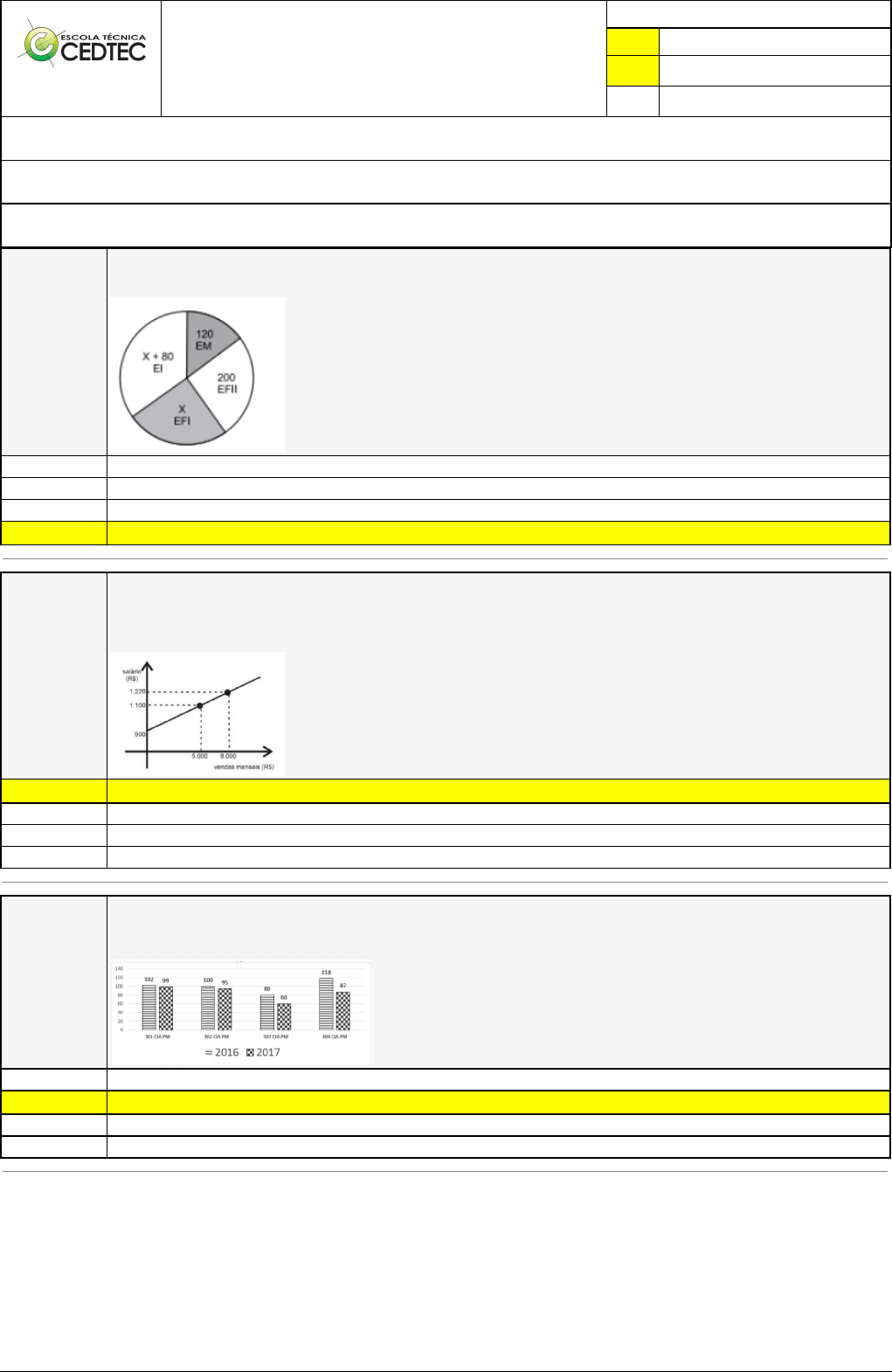 Pincel Atômico - 21/07/2024 23:36:17 1/2 ESTER DA SILVA RIBEIRO Exerc?cio Caminho do Conhecimento - Etapa 4 (21759) Atividade finalizada em 21/07/2024 23:34:07 (2149028 / 1) LEGENDA Resposta correta na questão # Resposta correta - Questão Anulada X Resposta selecionada pelo Aluno Disciplina: ESTATÍSTICA [785974] - Avaliação com 4 questões, com o peso total de 6,50 pontos [capítulos - 122] Turma: Curso Técnico: Segurança do Trabalho - Grupo: JANEIRO/23 PRES - N.SEG.TRAB.Jan.23A [80732] Aluno(a): 91410953 - ESTER DA SILVA RIBEIRO - Respondeu 4 questões corretas, obtendo um total de 6,50 pontos como nota [350045_133198] Questão 001 O gráfico mostra algumas informações sobre o número de alunos matriculados no ensino infantil (EI), ensino fundamental I (EFI), ensino fundamental II (EFII) e ensino médio (EM), de uma escola. Número de Alunos Matriculados 50% 40% 45% X 35% [350047_133200] Questão 002 Um vendedor de uma loja de roupas recebe mensalmente, como salário, uma parte fixa mais uma parte variável (comissão), calculada a partir de cada real por ele vendido. O gráfico seguinte mostra algumas possibilidades de recebimento de salário (y) em função das vendas mensais (x). Com base nessa situação hipotética e no gráfico, é correto afirmar que, a cada real vendido pelo profissional de vendas, ele recebe a quantia de: X R$ 0,04 R$ 0,06 R$ 0,20 R$ 0,08 [350047_133202] Questão 003 O 150º Batalhão é responsável pela 301ª CIA PM, 302ª CIA PM, 303ª CIA PM e 304ª CIA PM. Nesse Batalhão, no ano de 2017, todas as CIAS PM obtiveram redução percentual (%) nos crimes em relação ao ano de 2016. Com base nas informações contidas no gráfico abaixo, marque a alternativa CORRETA. GRÁFICO: crimes na área do 150º BPM, por CIA PM – 2016 a 2017: A 301ª CIA PM obteve maior redução percentual que a 304ª CIA PM. X A 303ª CIA PM conseguiu reduzir os crimes em 25%. A 302ª CIA PM conseguiu reduzir os crimes em 12%. A 303ª CIA PM obteve menor redução percentual que a 302ª CIA PM. Pincel Atômico - 21/07/2024 23:36:17 2/2 [350045_133203] Questão 004 O supervisor de uma agência bancária obteve dois gráficos que mostravam o número de atendimentos realizados por funcionários. O Gráfico I mostra o número de atendimentos realizados pelos funcionários A e B, durante 2 horas e meia, e o Gráfico II mostra o número de atendimentos realizados pelos funcionários C, D e E, durante 3 horas e meia. Observando os dois gráficos, o supervisor desses funcionários calculou o número de atendimentos, por hora, que cada um deles executou. O número de atendimentos, por hora, que o funcionário B realizou a mais que o funcionário C é: 3 5 X 4 10
