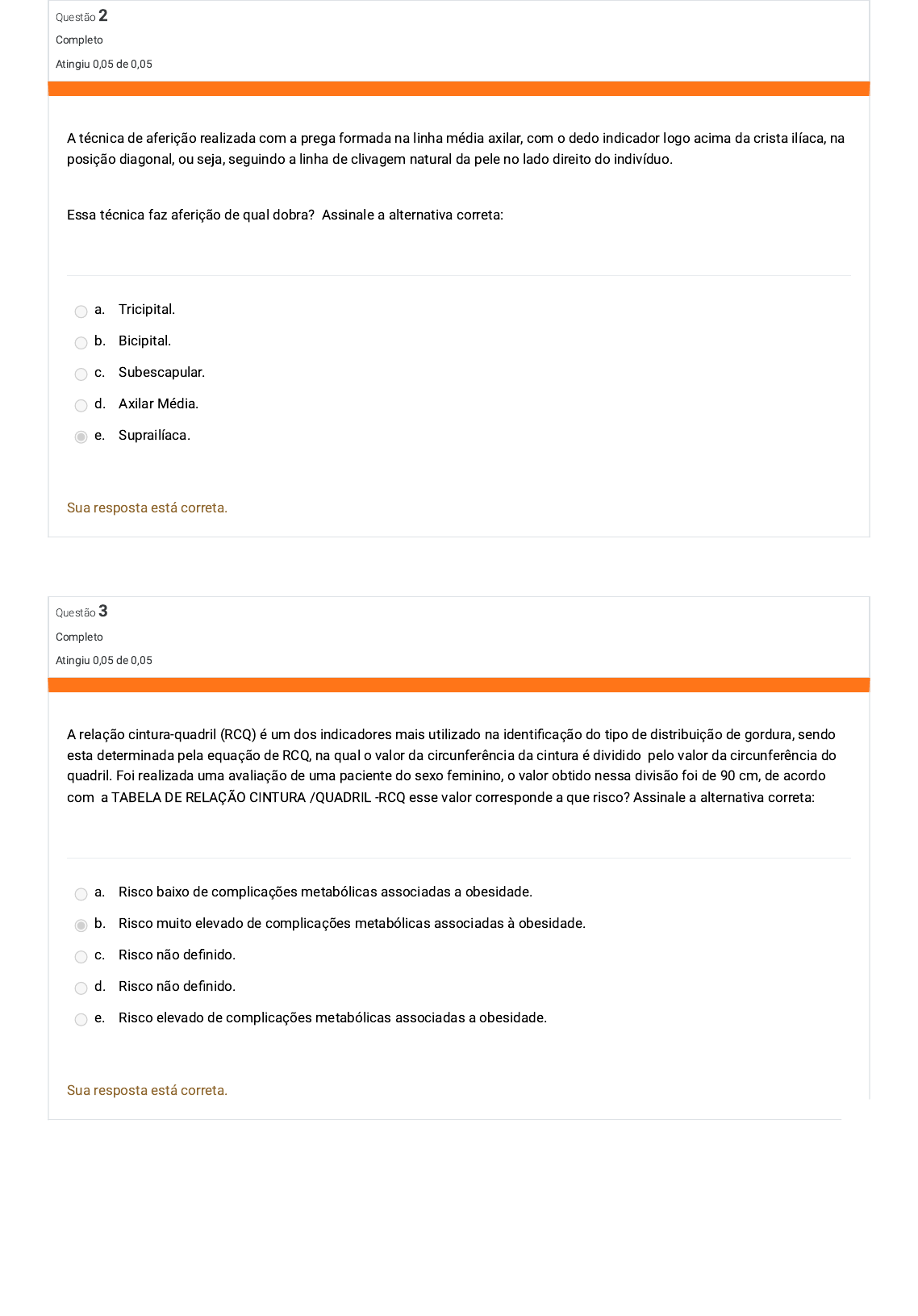 Questão 2 Completo Atingiu 0,05 de 0,05 Questão 3 Completo Atingiu 0,05 de 0,05 A técnica de aferição realizada com a prega formada na linha média axilar, com o dedo indicador logo acima da crista ilíaca, na posição diagonal, ou seja, seguindo a linha de clivagem natural da pele no lado direito do indivíduo. Essa técnica faz aferição de qual dobra? Assinale a alternativa correta: a. Tricipital. b. Bicipital. c. Subescapular. d. Axilar Média. e. Suprailíaca. Sua resposta está correta. A relação cintura-quadril (RCQ) é um dos indicadores mais utilizado na identificação do tipo de distribuição de gordura, sendo esta determinada pela equação de RCQ, na qual o valor da circunferência da cintura é dividido pelo valor da circunferência do quadril. Foi realizada uma avaliação de uma paciente do sexo feminino, o valor obtido nessa divisão foi de 90 cm, de acordo com a TABELA DE RELAÇÃO CINTURA /QUADRIL -RCQ esse valor corresponde a que risco? Assinale a alternativa correta: a. Risco baixo de complicações metabólicas associadas a obesidade. b. Risco muito elevado de complicações metabólicas associadas à obesidade. c. Risco não definido. d. Risco não definido. e. Risco elevado de complicações metabólicas associadas a obesidade. Sua resposta está correta. Questão 4 Completo Atingiu 0,05 de 0,05 Questão 5 Completo Atingiu 0,05 de 0,05 A técnica de aferição realizada com a palma da mão voltada para fora, marcando o local da medida 1 cm acima do local marcado para a prega tricipital. Segura-se a prega verticalmente e aplica o calibrador no local marcado. Essa técnica faz aferição de qual dobra? Assinale a alternativa correta: a. Axilar Média. b. Abdominal. c. Tricipital. d. Subescapular. e. Bicipital. Sua resposta está correta. A avaliação nutricional atua como um exame que analisa de diferentes maneiras como o corpo está recebendo, absorvendo, utilizando e excretando os nutrientes que obtemos dos alimentos. Durante a avaliação antropométrica, qual a medida que, quando usada sozinha, não consegue diferenciar entre a gordura que se acumula em torno dos órgãos internos (gordura visceral) e a gordura logo abaixo da pele (gordura subcutânea)? Assinale a alternativa correta: a. A medida da dobra cutânea abdominal (DCAb). b. A medida da circunferência da cintura (CC). c. A medida da circunferência da panturrilha. d. A medida da circunferência do quadril (CQ). e. A medida da circunferência braquial. Sua resposta está correta. Questão 6 Completo Atingiu 0,05 de 0,05 Questão 7 Completo Atingiu 0,00 de 0,05 O Índice de massa corpórea (IMC) é uma medida básica do estado nutricional calculado utilizando a seguinte fórmula: peso atual(kg)/estatura(m)2. Após realizar o cálculo do IMC, encontrou-se o valor de 39,9 kg/m². De acordo com a tabela do IMC qual a classificação correta? Assinale a alternativa correta: a. Obesidade Classe II. b. Eutrofia. c. Baixo Peso. d. Sobrepeso. e. Obesidade Classe III. Sua resposta está correta. Através do monitoramento da saúde a longo prazo, compreender os cálculos nutricionais também é importante para adultos saudáveis, pois à medida que estes envelhecem, manter uma dieta adequada pode ajudar a prevenir problemas de saúde relacionados à idade, como osteoporose e perda de massa muscular. Dessa forma, esse conhecimento pode ser valioso para profissionais de saúde. Esse conhecimento torna possível ajudar os pacientes a alcançar? Assinale a alternativa correta: a. Apenas para compreender os cálculos e métodos antropométricos. b. Ajudar os pacientes a alcançar um estado nutricional ideal. c. Todas as alternativas estão incorretas. d. Ajudar os pacientes a saberem o peso ideal. e. Ajudar os pacientes a compreender o IMC. Sua resposta está incorreta. Questão 8 Completo Atingiu 0,05 de 0,05 Questão 9 Completo Atingiu 0,05 de 0,05 Durante a prática você pôde aprender que existem inúmeras razões para você, acadêmico de nutrição, aprender sobre cálculos nutricionais para o diagnóstico nutricional de adultos saudáveis. E que ao avaliar a saúde nutricional de um adulto, existem alguns fatores importantes. Assinale abaixo quais são esses fatores: a. Depleções e Excessos nutricionais, e avaliação do consumo alimentar. b. Inquérito alimentar e ASG. c. Excessos Nutricionais e ASG. d. Percentual de gordura corporal e IMC. e. Depleções e massa magra. Sua resposta está correta. Um estudo clássico conduzido por Roche e outros pesquisadores avaliou 13 locais anatômicos diferentes para prever o percentual de gordura corporal e concluiu que apenas cinco desses locais foram considerados bons indicadores. Assinale quais indicadores são eles: a. Subescapular, abdominal, tricipital, coxa e panturrilha. b. Subescapular, abdominal, tricipital, axilar média e bicipital. c. Tricipital, bicipital, subescapular, abdominal e torácica. d. Subescapular, abdominal, tricipital, axilar média e bicipital. e. IMC, CB, CC, CQ, RCQ Sua resposta está correta. Questão 10 Completo Atingiu 0,00 de 0,05 De acordo com as instruções gerais para a aferição das pregas cutâneas, para que seja realizada a medida corretamente da dobra de pele, é necessário identificar e marcar o local ao qual deseja medir, usando os dedos polegar e indicador da mão esquerda, segurando a pele e a camada de gordura cerca de 1 centímetro do ponto marcado, com um calibrador apropriado, mantendo a dobra/prega entre os dedos até concluir a medição. Dessa forma, quantos segundos aproximadamente deve-se segurar a dobra para realizar a leitura? Assinale a alternativa correta: a. Faça a leitura da medida no milímetro mais próximo, levando cerca de 5 a 6 segundos. b. Faça a leitura da medida no milímetro mais próximo, levando cerca de 4 a 5 segundos. c. Faça a leitura da medida no milímetro mais próximo, levando cerca de 2 a 3 segundos. d. Faça a leitura da medida no milímetro mais próximo, levando cerca de 
