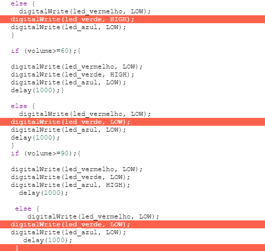 else { digitalWrite (led vermelho, LOW); digitalWrite (led verde, HIGH) ; digitalWrite (led_azul, LOW); } if (volume>=60); digitalWrite(led_verde, HIGH); digitalWrite (led_azul, delay (1000); } else { digitalWrite (led vermelho, LOW) verde, LOW) ; digitalWrite(led_azul, delay } if (volume>=90);{ digitalWrite(ledvermelho, digitalWrite(led_verde, LOW); digitalWrite (led azul, HIGH); delay (1000); else { digitalWrite (led vermelho, digitalWrite (led verde, LOW) ; digitalWrite (led_azul, delay