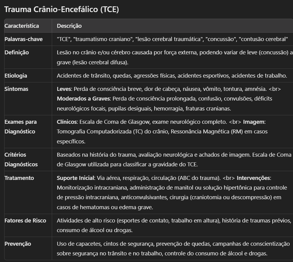 Trauma (TCE) Característica Descrição Palavras-chave "TCE", "traumatismo craniano", "lesão cerebral traumática", "concussão", "contusão cerebral" Definição Lesão no crânio e/ou cérebro causada por força externa, podendo variar de leve (concussão) a grave (lesão cerebral difusa). Etiologia Acidentes de trânsito, quedas, agressões físicas, acidentes esportivos, acidentes de trabalho. Sintomas Leves: Perda de consciência breve, dor de cabeça, náusea, vômito, tontura, amnésia. <br> Moderados a Graves: Perda de consciência prolongada, confusão, convulsões, déficits neurológicos focais, pupilas desiguais, hemorragia, fraturas cranianas. Exames para Clínicos: Escala de Coma de Glasgow, exame neurológico completo. <br> Imagem: Diagnóstico Tomografia Computadorizada (TC) do crânio, Ressonância Magnética (RM) em casos específicos. Critérios Baseados na história do trauma, avaliação neurológica e achados de imagem. Escala de Coma Diagnósticos de Glasgow utilizada para classificar a gravidade do TCE. Tratamento Suporte Inicial: Via aérea, respiração, circulação (ABC do trauma). <br> Intervenções: Monitorização intracraniana, administração de manitol ou solução hipertônica para controle de pressão intracraniana, anticonvulsivantes, cirurgia (craniotomia ou descompressão) em casos de hematomas ou edema grave. Fatores de Risco Atividades de alto risco (esportes de contato, trabalho em altura), história de traumas prévios, consumo de álcool ou drogas. Prevenção Uso de capacetes, cintos de segurança, prevenção de quedas, campanhas de conscientização sobre segurança no trânsito e no trabalho, controle do consumo de álcool e drogas.