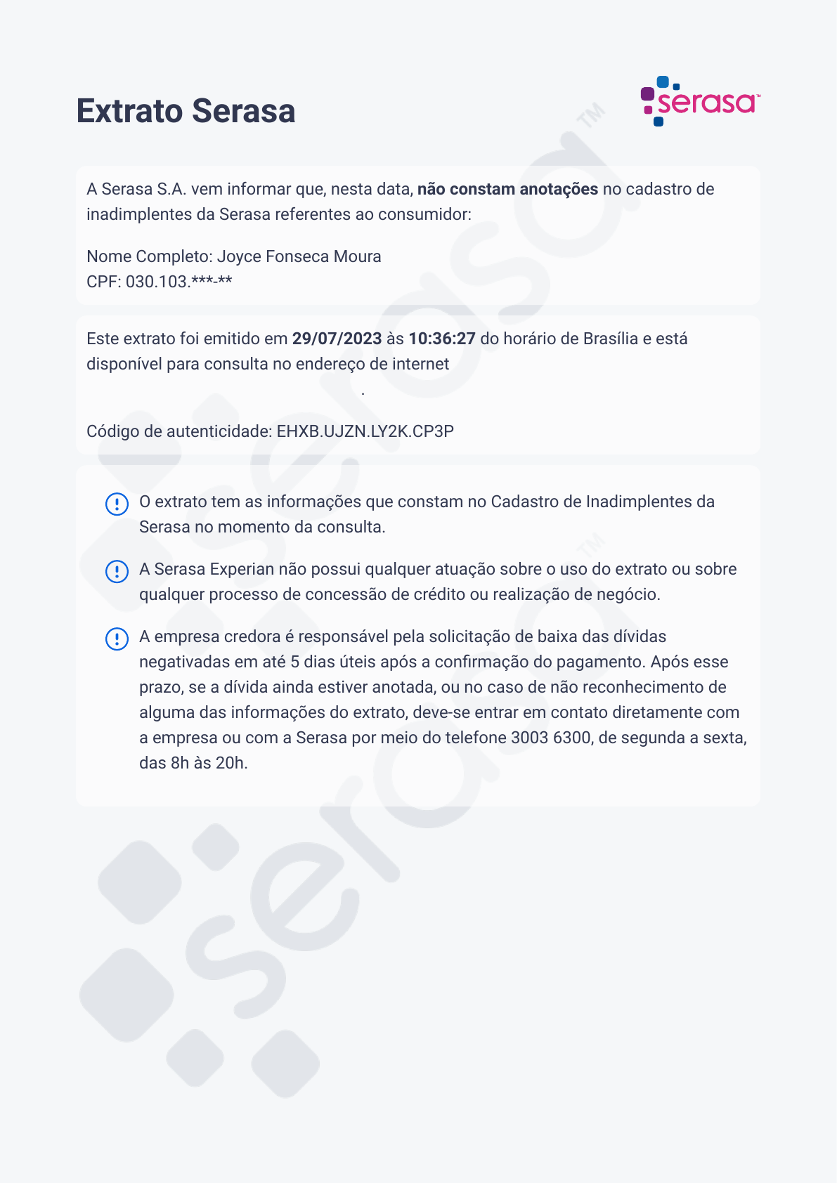 Extrato Serasa A Serasa S.A. vem informar que, nesta data, não constam anotações no cadastro de inadimplentes da Serasa referentes ao consumidor: Nome Completo: Joyce Fonseca Moura CPF: 030.103.***-** Este extrato foi emitido em 29/07/2023 às 10:36:27 do horário de Brasília e está disponível para consulta no endereço de internet https://www.serasa.com.br/area- cliente/meu-cpf/pendencias/extrato. Código de autenticidade: EHXB.UJZN.LY2K.CP3P O extrato tem as informações que constam no Cadastro de Inadimplentes da Serasa no momento da consulta. A Serasa Experian não possui qualquer atuação sobre o uso do extrato ou sobre qualquer processo de concessão de crédito ou realização de negócio. A empresa credora é responsável pela solicitação de baixa das dívidas negativadas em até 5 dias úteis após a confirmação do pagamento. Após esse prazo, se a dívida ainda estiver anotada, ou no caso de não reconhecimento de alguma das informações do extrato, deve-se entrar em contato diretamente com a empresa ou com a Serasa por meio do telefone 3003 6300, de segunda a sexta, das 8h às 20h. Extrato Serasa