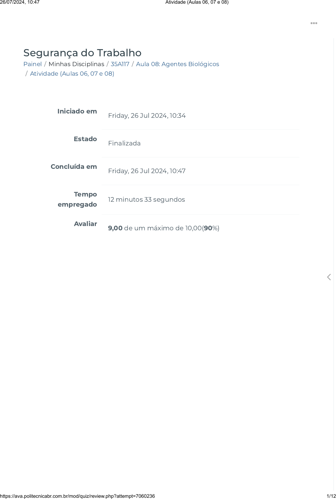 Painel / Minhas Disciplinas / 35A117 / Aula 08: Agentes Biológicos / Atividade (Aulas 06, 07 e 08) Segurança do Trabalho Iniciado em Friday, 26 Jul 2024, 10:34 Estado Finalizada Concluída em Friday, 26 Jul 2024, 10:47 Tempo empregado 12 minutos 33 segundos Avaliar 9,00 de um máximo de 10,00(90%) 26/07/2024, 10:47 Atividade (Aulas 06, 07 e 08) https://ava.politecnicabr.com.br/mod/quiz/review.php?attempt=7060236 1/12 https://ava.politecnicabr.com.br/my/ https://ava.politecnicabr.com.br/my/ https://ava.politecnicabr.com.br/course/view.php?id=1039 https://ava.politecnicabr.com.br/course/view.php?id=1039#section-10 https://ava.politecnicabr.com.br/mod/quiz/view.php?id=25513 https://ava.politecnicabr.com.br/ Questão 1 Incorreto Atingiu 0,00 de 1,00 Assinale a alternativa correta. Escolha uma opção: a. Todas as alternativas estão corretas. b. Condição térmica: transmissão de calor por ondas eletromagnéticas chamadas de ondas de calor ou calor radiante. É por esse fenômeno que os raios de Sol chegam até a terra, através do vácuo. c. Irradiação térmica: transferência de calor conduzido de um ponto a outro do corpo (molécula a molécula). A condução não ocorre no vácuo. É o menos prejudicial à saúde e ao corpo. d. Convecção térmica: é um processo que corresponde à transferência da energia térmica pela matéria em movimento, sendo gases, líquido ou vapor. 26/07/2024, 10:47 Atividade (Aulas 06, 07 e 08) https://ava.politecnicabr.com.br/mod/quiz/review.php?attempt=7060236 2/12 https://ava.politecnicabr.com.br/ Questão 2 Correto Atingiu 1,00 de 1,00 Marque a alternativa correta quanto as de�nições no material de aula sobre aerodispersoides. Escolha uma opção: a. Fumos são as produzidas a partir de um material sólido gerado da condensação de vapores em temperatura ambiente. b. Particulados respiráveis são os menores que 10µ, capazes de se alojar diretamente nos bronquíolos. c. Todas as alternativas estão corretas. d. As neblinas são pequenas gotas em suspensão produzidas pela condensação dos vapores em temperatura normal. e. Particulados, pois são fragmentos pequenos que podem ser inalados; pelo seu tamanho, podem passar pelo trato respiratório, pela traqueia e se instalar nos pulmões. Esses particulados merecem atenção especial. 26/07/2024, 10:47 Atividade (Aulas 06, 07 e 08) https://ava.politecnicabr.com.br/mod/quiz/review.php?attempt=7060236 3/12 https://ava.politecnicabr.com.br/ Questão 3 Correto Atingiu 1,00 de 1,00 Assinale (V) Verdadeiro e (F) Falso, relacionado a exposições extremas. ( ) Quando o trabalhador é exposto a temperaturas mais intensas, podem ocorrer casos graves como a prostração térmica. ( ) Umidade - o agente físico em questão está relacionado a trabalhos em locais alagados, encharcados ou com umidade excessiva que possam produzir danos à saúde do trabalhador, desde laudo de inspeção considere a atividade insalubre. ( ) Retirar o trabalhador do local, tirar as vestimentas do corpo dele, aplicar-lhe banhos de imersão (se tiver local apropriado para tal, valendo lembrar que a água não pode ser fria, e sim tépida, entre 35,5°C e 36°C, para que o trabalhador não entre em choque térmico) e administrar soro �siológico para hidratá-lo; realizar exames periódicos. Nos dois casos dar-se-ão a desidratação e outras alterações orgânicas. Escolha uma opção: a. F, V, F. b. F, F, V. c. V, V, V. d. V, F, V. e. V, V, F. 26/07/2024, 10:47 Atividade (Aulas 06, 07 e 08) https://ava.politecnicabr.com.br/mod/quiz/review.php?attempt=7060236 4/12 https://ava.politecnicabr.com.br/ Questão 4 Correto Atingiu 1,00 de 1,00 Assinale (V) Verdadeiro ou (F) Falso, referente a exposição ao calor. ( ) Com relação a epiderme, a corrente sanguínea contribui para promover a passagem de calor entre as células, com isso pode ocorrer a perda perspiração ou a retenção de carlor. ( ) Sobre a �siologia humana, a referência de temperatura corpórea do homem é de 36 °C a 37 °C, não podendo suportar temperaturas ambientais acima de 40 °C, em que já se torna insuportável e o corpo não consegue amenizar o calor fazendo a troca com o ambiente, pois a evaporação não é realizada adequadamente e seu bem-estar �ca comprometido. Escolha uma opção: a. V, F. b. F, V. c. V, V. d. F, F. 26/07/2024, 10:47 Atividade (Aulas 06, 07 e 08) https://ava.politecnicabr.com.br/mod/quiz/review.php?attempt=7060236 5/12 https://ava.politecnicabr.com.br/ Questão 5 Correto Atingiu 1,00 de 1,00 Assinale a alternativa incorreta. Escolha uma opção: a. Todas as alternativas estão incorretas. b. Mormo é considerado patologia pro�ssional. Tratadores de equinos, que trabalham nas cocheiras ou estábulos, granjeiros, veterinários estão mais propensos a contrair a patologia. É mais comum no homem que na mulher. c. Leptospirose a forma de contaminação é através da pele e mucosas, por água contaminada ou dejetos e urina de ratos infectados. A penetração através da via gástrica é mais difícil em virtude da presença de suco gástrico. d. A escabiose tem como sintomatologia: patologia benigna. Após incubação, que pode durar de 14 a 30 dias, apresenta sintomatologias atípicas, tais como: algias espaçadas pelo corpo, astenia, fadiga, sudorese, febre baixa e oscilante. No gado, o aborto é frequente, o que chama a atenção para o diagnóstico. e. Carbúnculo é um microrganismo que vem do carvão, que apresenta morfologia de bastonete aeróbico estrito e esporulado. É encontrado nos ovinos, caprinos e raramente em equinos. A contaminação se dá através dos esporos, por lãs, couros, crinas, pincéis de barba, farinha de ossos etc. 26/07/2024, 10:47 Atividade (Aulas 06, 07 e 08) https://ava.politecnicabr.com.br/mod/quiz/review.php?attempt=7060236 6/12 https://ava.politecnicabr.com.br/ Questão 6 Correto Atingiu 1,00 de 1,00 Assinale (V) Verdadeiro ou (F) Falso, referente a exposição aos agentes ambientais. ( ) To