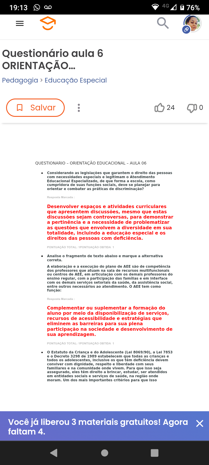 19:13 4G 76% Questionário 6 ORIENTAÇÃO... Pedagogia > Educação Especial Salvar 24 0 QUESTIONARIO ORIENTAÇÃO EDUCACIONAL AULA 06 Considerando as legislações que garantem o direito das pessoas com necessidades especiais e legitimam Atendimento Educacional Especializado, de que forma a escola, como cumpridora de suas funções sociais, deve se planejar para orientar e combater as práticas de discriminação? Resposta Marcada : Desenvolver espaços e atividades curriculares que apresentem discussões, mesmo que estas discussões sejam controversas, para demonstrar a pertinência e a necessidade de problematizar as questões que envolvem a diversidade em sua totalidade, incluindo a educação especial e os direitos das pessoas com deficiência. 1PONTUAÇÃO 1 Analise fragmento de texto abaixo e marque a alternativa correta. A elaboração e a execução do plano de AEE são de competência dos professores que atuam na sala de recursos ou centros de AEE, em articulação com os demais professores do ensino regular, com a participação das famíllas e em Interface com os demais setoriais da saúde, da assistência social, entre outros necessários ao atendimento. AEE tem como função: Resposta Marcada : Complementar ou suplementar a formação do aluno por meio da disponibilização de serviços, recursos de acessibilidade e estratégias que eliminem as barreiras para sua plena participação na sociedade e desenvolvimento de sua aprendizagem. PONTUAÇÃO 1PONTUAÇÃO OBTIDA 1 o Estatuto da Criança e do Adolescente (Lel 8069/90), a Lei 7853 e Decreto 3298 de 1989 estabelecem que todas as crianças e todos os adolescentes, inclusive os que têm deficiência devem conviver com dignidade, respeito e com seus familiares e na comunidade onde Para que seja assegurado, eles têm direito a brincar, ser atendidos em entidades sociais e serviços de saúde, na região onde moram. Um dos mais critérios para que Você já liberou 3 materiais gratuitos! Agora X faltam 4.