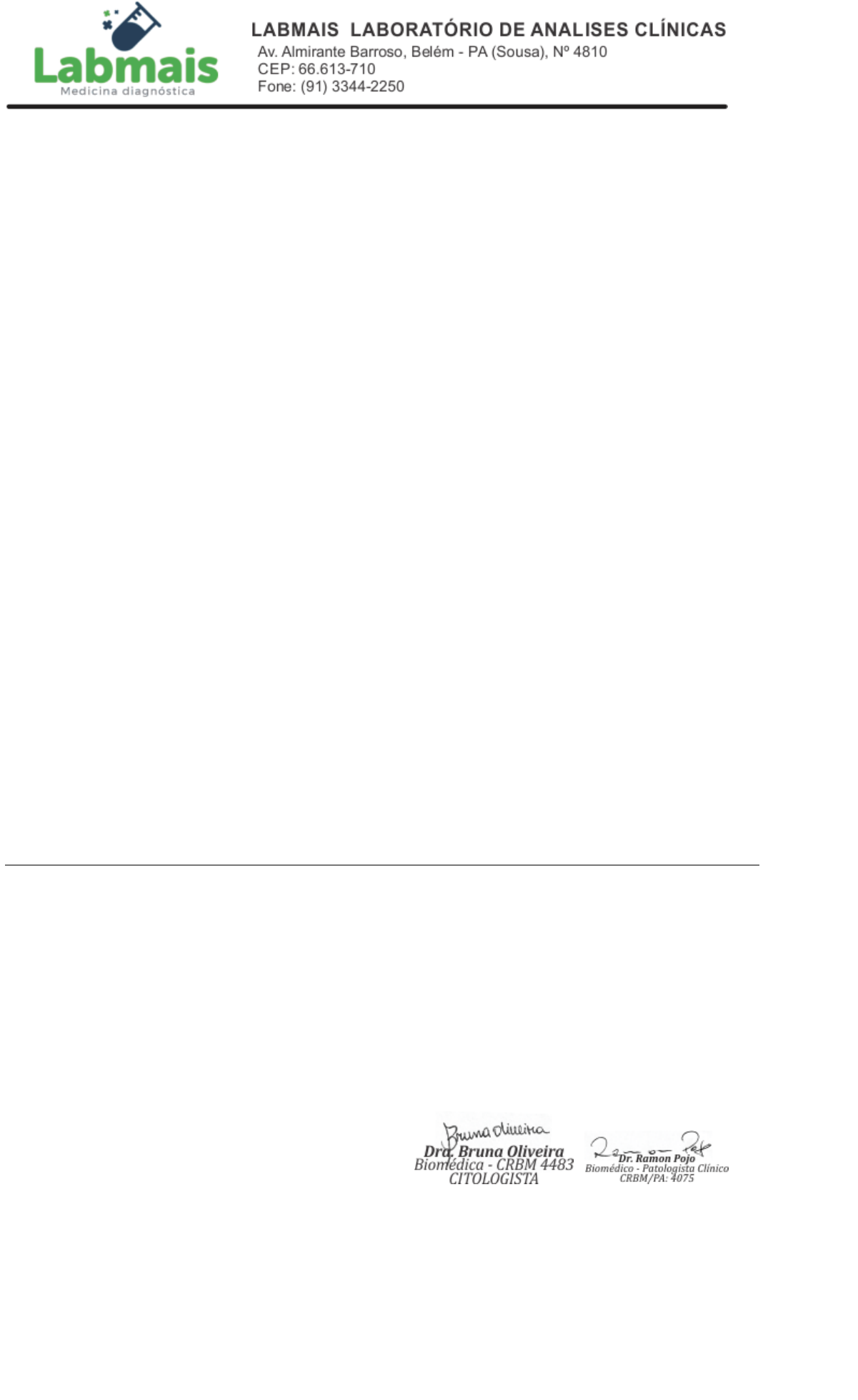 Cl iente: RENATA OLIVEIRA DE MORAES Código do Pedido : 90948-01 Data Nascimento: 02/09/1987 Idade: 36a Sexo:F Matricula : Convênio: PARTICULAR CPF:99924757220 RG:5903826 Unid. Requis i tante: MATRIZ Médico Sol ici tante: Dr(a). - CRM: Data de atendimento: 17/07/2024 09:34:44 _________________________________________________________________________________________________ HEMOGRAMA AUTOMATIZADO ERITROGRAMA Valores de Referência Hemácias: 4,44 milhões/mm³ 3,9 a 5,3 Hematócrito: 35,9 % 36 a 48 Hemoglobina: 13,9 g/dL 12,0 a 16,0 R.D.W: 14,2 % 12,0 a 15,0 V.C.M: 80,9 fL 80 a 100 H.C.M: 31,3 pg 27 a 33 C.H.C.M: 38,7 g/dL 32 a 36 LEUCOGRAMA Valores de Referência Valores de Referência Leucócitos: 8.510 /mm³ 5,000 a 10,000 Eosinófilos: 2,7 % 0 a 7 % 230 /mm³ 20 a 500 Basófilos: 0,4 % 0 a 3 % 34 /mm³ 0 a 200 Mielócitos: 0,0 % 0 % 0 /mm³ 0 Metamielócitos: 0,0 % 0 % 0 /mm³ 0 Bastões: 0,0 % 0 a 5 % 0 /mm³ 0 a 410 Segmentados: 66,8 % 40 a 78 % 5.685 /mm³ 1,700 a 8,200 Linfócitos: 23,7 % 20 a 50 % 2.017 /mm³ 1,000 a 4,500 Monócitos: 6,4 % 2 a 10 % 545 /mm³ 100 a 1.000 Valores de Referência PLAQUETAS: 329.000/mm³ 150.000 a 500.000 PDW: 16,3 /mm³ 15 a 20 fL PCT: 0,28 /mm³ 0,15 a 0,32 % VPM: 8,6 /mm³ até 16 Obs.: Material: [SANGUE TOTAL ] Método: [RESISTIVIDADE - IMPEDÂNCIA - MICROSCOPIA] * Os valores de referência apresentados são pertinentes ao sexo e idade do paciente._____ Data da Liberação:17/07/2024 12:30:22________________________ Liberado por: Dr Rodrigo Peniche Lopes - CRBM/PA Cl iente: RENATA OLIVEIRA DE MORAES Código do Pedido : 90948-01 Data Nascimento: 02/09/1987 Idade: 36a Sexo:F Matricula : Convênio: PARTICULAR CPF:99924757220 RG:5903826 Unid. Requis i tante: MATRIZ Médico Sol ici tante: Dr(a). - CRM: Data de atendimento: 17/07/2024 09:34:44 _________________________________________________________________________________________________ HEMOGLOBINA GLICADA (HBA1C) Valor(es ) de Referência*: Hb A1c: 5,0 Normal: Menor que 5,7% Pré-diabetes: 5,7% a 6,4% Diabetes: Maior ou igual a 6,5% Meta terapêutica Controle adequado: Menor que 7,0% Referência: Posicionamento Oficial SBD, SBPC-ML, SBEM e FENAD 2017/2018. Hb A1a: 0,9 Hb A1b: 1,0 Hb F: 1,6 Hb A1c Lábi l : 0,5 Hb A: 88,0 Gl icemia estimada média: 97 Material: Sangue com EDTA Método: Cromatograia Líquida - HPLC Obs: * Os valores de referência apresentados são pertinentes ao sexo e idade do paciente._____ Data da Liberação:19/07/2024 10:40:09_________________________ Liberado por: Dr Rodrigo Peniche Lopes - CRBM/PA Cl iente: RENATA OLIVEIRA DE MORAES Código do Pedido : 90948-01 Data Nascimento: 02/09/1987 Idade: 36a Sexo:F Matricula : Convênio: PARTICULAR CPF:99924757220 RG:5903826 Unid. Requis i tante: MATRIZ Médico Sol ici tante: Dr(a). - CRM: Data de atendimento: 17/07/2024 09:34:44 _________________________________________________________________________________________________ GLICOSE Valor(es ) de Referência*: Resul tado: 98,0 mg/dL 70 a 99 mg/dL Resultados Anteriores: Material: SORO Método: ENZIMÁTICO Obs: * Os valores de referência apresentados são pertinentes ao sexo e idade do paciente._____ Data da Liberação:17/07/2024 12:30:23_________________________ Liberado por: Dr Rodrigo Peniche Lopes - CRBM/PA URÉIA Valor(es ) de Referência*: Resul tado: 54,0 mg/dL 13 a 45 mg/dL Resultados Anteriores: Material: Soro Método: Automatizado - Prime 300 Obs: * Os valores de referência apresentados são pertinentes ao sexo e idade do paciente. Coleta:17/07/2024 09:34:50 Liberação:17/07/2024 12:30:21____ Liberado por: Dr Rodrigo Peniche Lopes - CRBM/PA TRIGLICERÍDEOS Valor(es ) de Referência*: Resul tado: 127 mg/dL Inferior a 150 mg/dL Resultados Anteriores: (05/07/2022): 86 Material: Soro Método: Automatizado - Prime 300 Obs: * Os valores de referência apresentados são pertinentes ao sexo e idade do paciente. Coleta:17/07/2024 09:34:50 Liberação:17/07/2024 12:30:21____ Liberado por: Dr Rodrigo Peniche Lopes - CRBM/PA CREATININA Valor(es ) de Referência*: Resul tado: 0,87 mg/dL Adultos 0,60 a 1,20 Mg/dl Resultados Anteriores: Material: Soro Método: Automatizado - Prime 300 Obs: * Os valores de referência apresentados são pertinentes ao sexo e idade do paciente. Coleta:17/07/2024 09:34:50 Liberação:17/07/2024 12:30:22____ Liberado por: Dr Rodrigo PenicheLopes - CRBM/PA COLESTEROL TOTAL E FRAÇÕES Valor(es ) de Referência*: Resul tado: Colesterol Tota l : 265,0 mg/dL 0 a 200 mg/dL Colesterol HDL: 41,1 mg/dL Maior ou Igual a 40 mg/dL Colesterol LDL: 198,5 mg/dL Menor que 100 mg/dL Colesterol VLDL: 25,4 mg/dL Menor que 40 mg/dL Trigl icerideos : 127,0 mg/dL Menor que 150 mg/dL Material: Soro Método: Automatizado - Prime 300 Obs: * Os valores de referência apresentados são pertinentes ao sexo e idade do paciente. Coleta:17/07/2024 09:34:50 Liberação:17/07/2024 12:30:22____ Liberado por: Dr Rodrigo Peniche Lopes - CRBM/PA TGO - TRANSAMINASE GLUTAMICO-OXALACETICA Valor(es ) de Referência*: Resul tado: 41,4 U/L Até 31 U/L Resultados Anteriores: (24/07/2023): 22,4 (05/07/2022): 26,3 Material: Soro Método: Automatizado - Prime 300 Obs: * Os valores de referência apresentados são pertinentes ao sexo e idade do paciente. Coleta:17/07/2024 09:34:50 Liberação:17/07/2024 12:30:23____ Liberado por: Dr Rodrigo Peniche Lopes - CRBM/PA Cl iente: RENATA OLIVEIRA DE MORAES Código do Pedido : 90948-01 Data Nascimento: 02/09/1987 Idade: 36a Sexo:F Matricula : Convênio: PARTICULAR CPF:99924757220 RG:5903826 Unid. Requis i tante: MATRIZ Médico Sol ici tante: Dr(a). - CRM: Data de atendimento: 17/07/2024 09:34:44 _________________________________________________________________________________________________ TGP - TRANSAMINASE GLUTAMICO-PIRUVICA Valor(es ) de Referência*: Resul tado: 27,4 U/L Até 32 U/L Resultados Anteriores: (24/07/2023): 16,7 (05/07/2022): 21,6 Material: Soro Método: Automatizado - Prime 300 Obs: * Os valores de referência apresentados são pertinentes ao