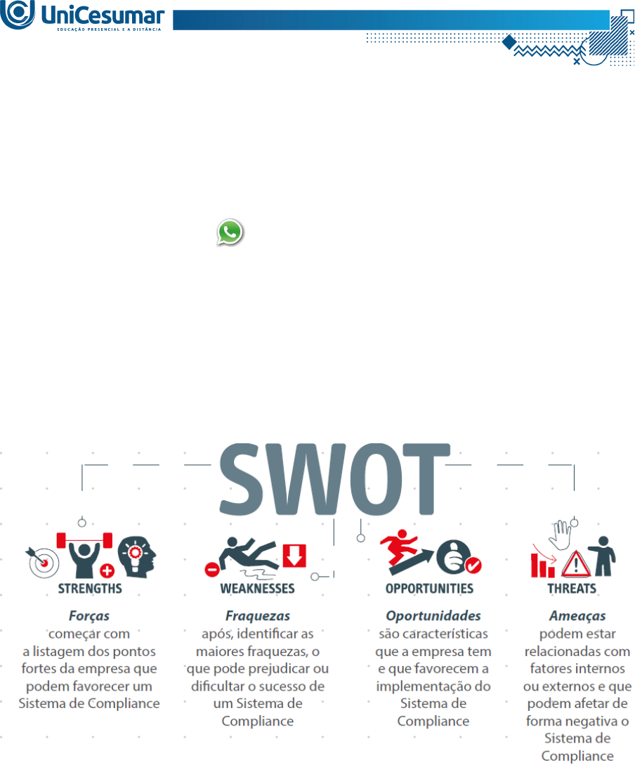 Olá, aluno(a)! Está com dificuldade ou sem tempo para elaborar esse MAPA? Iremos te ajudar! Entre em contato (63) 99129-5554 MAPA – GCOM – COMPLIANCE - 53_2024 No meio corporativo, existem, ainda, ferramentas disponíveis para análise. Uma ferramenta possível é a Análise SWOT, proveniente da expressão em inglês “Strengths, Weaknesses, Opportunities, Threats”. Ao ser traduzida para o português, a expressão se transforma na conhecida “FOFA”: Forças, Fraquezas, Oportunidades e Ameaças. É a partir da verificação dessas condições que é possível alcançar um diagnóstico da situação atual da organização em relação ao tema que é objeto de nosso estudo: o Compliance. Fonte: RIGON, R. de O. A. Compliance. Indaial: Arqué, 2023. p. 19-20. "Você já ouviu falar em Análise SWOT? Essa ferramenta estratégica é fundamental para o sucesso de sua atuação em Compliance. A sigla SWOT representa as palavras Strengths (Forças), Weaknesses (Fraquezas), Opportunities (Oportunidades) e Threats (Ameaças). Com essa análise, você consegue mapear os pontos fortes e fracos do seu programa de Compliance e, também, identificar as oportunidades que podem ser exploradas e as ameaças que precisam ser mitigadas" (Compliance PME, 2023, on-line). Fonte: https://www.instagram.com/compliancepme/p/Ctuf6kztUD7/?img_index=1. Acesso em: 4 jul. 2024. O estudo e a aplicação de Compliance são fundamentais para garantir que as empresas atuem conforme as leis, os regulamentos, as normas e as políticas internas, promovendo a integridade, a transparência e a ética nas operações corporativas. Para desenvolver habilidades e competências nessa área, é essencial que os profissionais aprendam a utilizar ferramentas estratégicas que permitam a avaliação e o fortalecimento dos programas de Compliance. Uma dessas ferramentas é a Análise SWOT (ou FOFA, em português), que ajuda a mapear as forças, fraquezas, oportunidades e ameaças relacionadas ao Compliance dentro de uma organização A proposta desta atividade prática é aplicar a Análise SWOT no contexto de Compliance, permitindo que os participantes identifiquem e avaliem os principais fatores que influenciam a eficácia dos programas de Compliance em uma organização fictícia ou real. Com esta atividade, espera-se desenvolver a capacidade de análise crítica, o pensamento estratégico e a habilidade de propor soluções práticas para aprimorar os programas de Compliance. Atividade prática: Aplicação da Análise SWOT no Programa de Compliance 1. Contextualização e preparação Escolha uma organização (pode ser real ou fictícia) para a qual você realizará a Análise SWOT no contexto do programa de Compliance. Reúna informações sobre a organização, incluindo sua missão, sua visão, seus valores, suas políticas de Compliance e qualquer histórico relevante de questões relacionadas ao cumprimento de normas e regulamentações 2. Realização da Análise SWOT Forças (Strengths): identifique os principais pontos fortes do programa de Compliance da organização. Considere fatores como a eficácia das políticas internas, a cultura organizacional, o apoio da liderança, a existência de treinamentos regulares etc Fraquezas (Weaknesses): avalie as fraquezas do programa de Compliance. Pense em áreas que precisam de melhoria, como lacunas na formação dos funcionários, falta de recursos, processos ineficazes, dentre outros. Oportunidades (Opportunities): mapeie as oportunidades que a organização pode aproveitar para fortalecer o programa de Compliance. Essas podem incluir mudanças regulatórias favoráveis, novas tecnologias, parcerias estratégicas etc. Ameaças (Threats): identifique as ameaças externas que podem comprometer a eficácia do programa de Compliance. Exemplos incluem mudanças na legislação, pressões do mercado, concorrência, dentre outros 3. Análise e propostas de melhoria Com base na Análise SWOT realizada, elabore um relatório detalhado que inclua: - Uma síntese das forças, fraquezas, oportunidades e ameaças identificadas. - Propostas de ações para fortalecer os pontos fortes e mitigar as fraquezas. - Estratégias para aproveitar as oportunidades e enfrentar as ameaças - Inclua recomendações específicas e práticas que a organização pode implementar para melhorar seu programa de Compliance. Dicas importantes: 1. Assista ao vídeo explicativo gravado pela professora. 2. Realize a sua atividade MAPA no formulário-padrão, arquivo em formato Word disponível para download no ambiente da disciplina em Material da Disciplina. 3. Certifique-se de que esteja encaminhando o arquivo correto no seu Studeo antes de finalizar, pois não haverá como editar e/ou enviar outro arquivo após a finalização. 4. Ao utilizar partes do livro da disciplina ou de textos retirados da internet para elaborar a sua resposta, não se esqueça de informar a fonte consultada nas referências ao final do seu texto. 5. Em caso de dúvidas, entre em contato com o seu professor mediador pelo Studeo no Fale com o Mediador. Bons estudos! image1.png image2.png image3.png image4.png