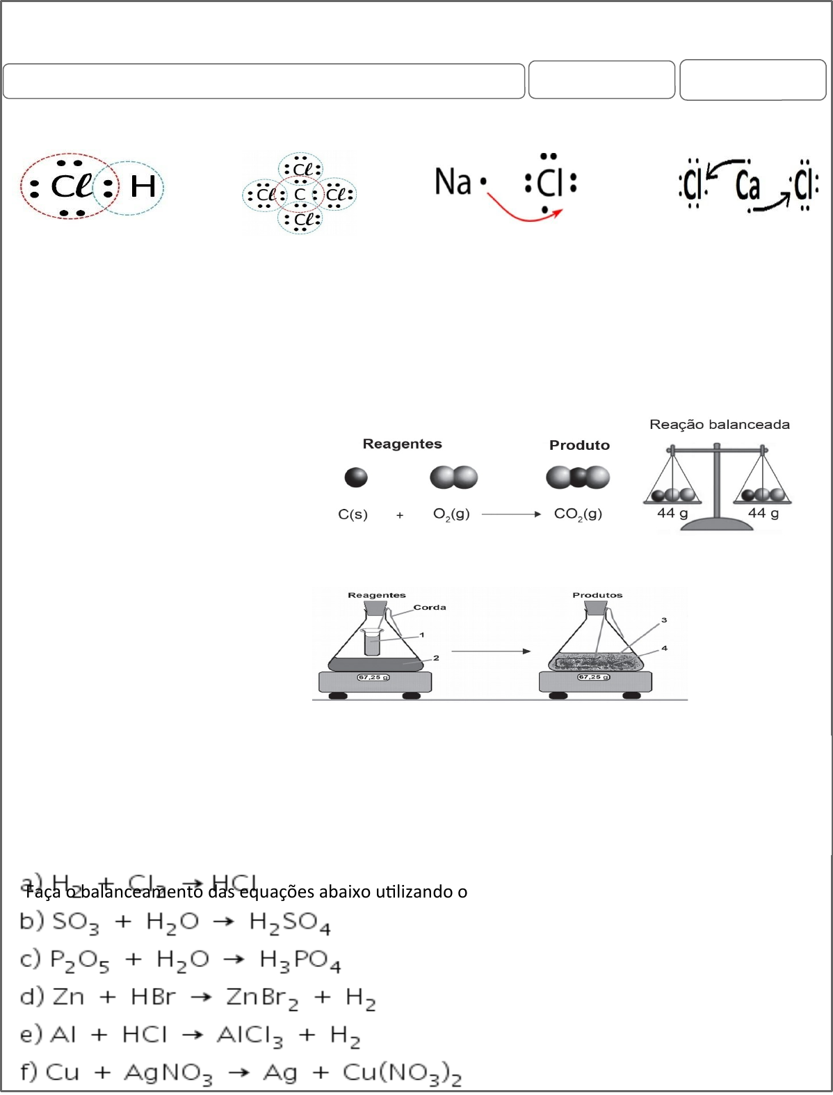 ESCOLA MUNICIPAL FLAMÍNIO ASSIS FREIRE ATIVIDADE AVALIATIVA DE CIÊNCIAS / 9° ANO VALOR: NOTA: NOME: 1) Considere o elemento cloro formando compostos com, respectivamente, hidrogênio, carbono, sódio e cálcio. Com quais desses elementos o cloro forma compostos covalentes? __________________. __________________. __________________. __________________ 2) Como os elementos são listados, sequencialmente, na tabela periódica? 3) Observe, na representação abaixo, uma reação química e uma balança que mostram o equilíbrio das massas dos reagentes e do produto que participam dessa reação. Nessa reação, além do equilíbrio das massas, também ocorre a conservação A) da propriedade de cada átomo. B) da temperatura de ebulição. C) do número de produtos. D) do volume das substâncias. 4) Observe, na imagem abaixo, os dados referentes à reação química em um sistema fechado representado.Com base nesses dados, a propriedade que se conserva nessa reação é A) a pressão. B) a quantidade de massa. C) o ponto de ebulição. D) o volume. 5) Considere as substâncias: I. Molécula de água (H2O). II. Gás metano (CH4). III. Argônio gasoso (Ar). IV. Cloreto de potássio (KCℓ). Quais dessas substâncias apresentam ligações covalentes? A) I e II. B) I e III. C) II e III. D) II e IV. 6) Faça o balanceamento das equações abaixo utilizando o método das tentativas 7) (Unicamp-SP) Leia a frase seguinte e transforme-a em uma equação química (balanceada), utilizando símbolos e fórmulas: “uma molécula de nitrogênio gasoso, contendo dois átomos de nitrogênio por molécula, reage com três moléculas de hidrogênio diatômico, gasoso, produzindo duas moléculas de amônia gasosa, a qual é formada por três átomos de hidrogênio e um de nitrogênio”. 8) Dada a seguinte reação de combustão do etanol: CH4 + 2 O2 → 1 CO2 + 2 H2O De acordo com a estequiometria da reação, 10 g de metano reagem com certa massa de oxigênio, produzindo 27,5 g de gás carbônico e 22,5 g de água. Pode-se afirmar que a massa de oxigênio necessária para que todo hidrocarboneto reaja é de: 9) 100 g de calcário é colocada sob aquecimento e se decompõe em 56 g de cal viva e 44 g de gás carbônico. Essa afirmativa está baseada na lei de qual cientista? a) Lavoisier. b) Dalton c) Richter d) Gay-Lussac 10) (Fuvest-SP) Quando 96 g de ozônio se transformam completamente, a massa de oxigênio comum produzida é igual a: a) 32 g. b) 48 g. c) 64 g. d) 80 g. e) 96 g. 11) A reação entre 20 g de álcool propílico e 48 g de oxigênio produziu 24 g de água e gás carbônico. A massa de gás carbônico obtida foi de?. C3H8O + 9/2 O2 → 3 CO2 + 4 H2O a) 44 g. b) 22 g. c) 61 g. d) 88 g. e) 18 g. 12) (UFPE-PE) Dois frascos, A e B, contendo diferentes reagentes, estão hermeticamente fechados e são colocados nos pratos de uma balança, que fica equilibrada como mostra o diagrama abaixo. Os frascos são agitados para que os reagentes entrem em contato. As seguintes reações ocorrem: Frasco A: Na2SO4 + Ba(NO3)2 ____> 2 NaNO3 + BaSO4 (precipitado branco) Frasco B:Zn(s) + H2SO4 ____> ZnSO4 + H2(g) Podemos afirmar que: (. ) com o andamento das reações o braço da balança pende para o lado do frasco A. (. ) com o andamento das reações o braço da balança pende para o lado do frasco B. ( ) com o andamento das reações os braços da balança permanecem na mesma posição. ( ) este experimento envolve uma reação ácido-base. (. ) este experimento envolve uma reação de oxidação-redução. image1.jpeg image2.jpeg image3.jpeg image4.jpeg image5.jpeg image6.jpeg image2.png image7.jpeg