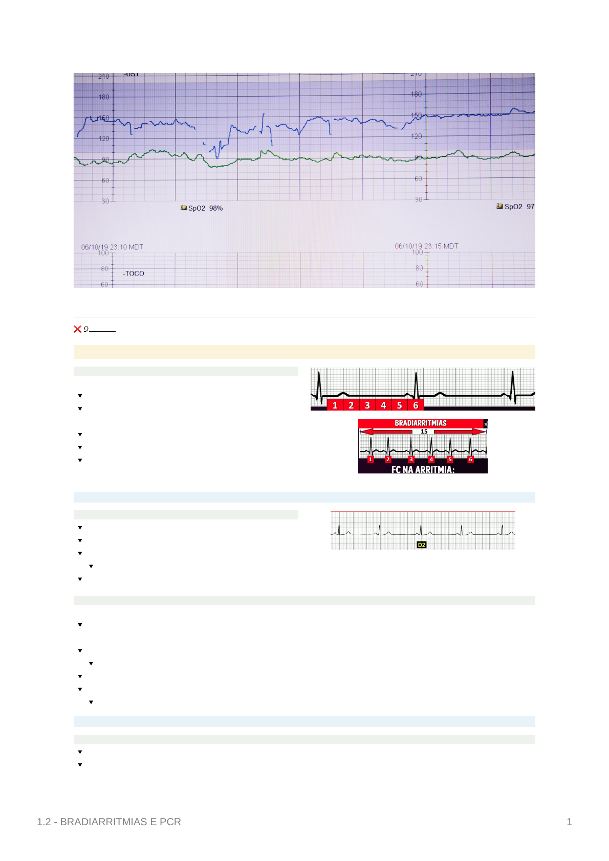 1.2 - BRADIARRITMIAS E PCR 1 1.2 - BRADIARRITMIAS E PCR ❌ QUESTÕES BRADIARRITMIAS FREQUÊNCIA CARDÍACA NORMAL contar "quadradões" até o próximo QRS Dividir por 300 ARRITMIA Contar 15 quadradões Contar quantos QRS nos 15 quadradões Multplicar os "QRS" por 20 BRADICARDIA SINUSAL Passos (1) Onda "P" positiva em DII (2) Cada onda "P" seguida por QRS (3) Intervalo PR = 120-200 ms Onda p + QR tem que caber no quadradão (4) FC baixa Conduta ASSINTOMÁTICO Observar SINTOMÁTICO ATROPINA 1mg a cada 3-5 minutos → máximo ___ mg/vezes 3 Se não responder, faz ADRENALINA ou MARCA-PASSO Se não tiver marcapasso, infundir continuamente em dose alta _________ DOPAMINA BLOQUEIO AV Classificação Acima do Feixe de Hiss: BENIGNOS / supra-hissianos Abaixo ou no Feixe de Hiss: MALIGNOS / intra ou infra-hissianos https://www.notion.so/QUEST-ES-1f45ce91d24545bea7b7f18af6eff5f9 1.2 - BRADIARRITMIAS E PCR 2 BENIGNOS BAV 1º GRAU Alentecimento do estímulo que passa do átrio para o ventrículo; não ocorre bloqueio de fato PR > 200ms P demora para chegar no QRS NUNCA BLOQUEIA BAV 2º GRAU - Mobitz 1 Intervalo PR alarga progressivamente até ocorrer o bloqueio: Fenômeno de ________ WENCKEBACH Às vezes bloqueia CONDUTA Mesma da Bradicardia Sinusal - responde à ATROPINA MALIGNOS BAV 2º GRAU - Mobitz 2 Às vezes bloqueia do nada PR normal e às vezes bloqueia: Fenômeno de _____ Hay BAV 2º grau mobitz 2 - 2:1 (a cada 2 ondas P, apenas 1 conduz) 2 estímulos atritais para 1 ventricular BAV 3º GRAU Dissociação entre onda "P" e "QRS" SEMPRE bloqueia CONDUTA Marca-Passo Marca-Passo MP Transcutâneo Para doenças TRANSITÓRIAS BOTÕES Frequência Cardíaca: 60-70 Modo: fixo Da o choque na frequência que eu designei OUTPUT: 10 a 20% acima do limiar Faz ________ (fentanil), para não doer analgesia É uma medida de emergência → prefere-se o marca-passo ______________ 1.2 - BRADIARRITMIAS E PCR 3 transVENOSO MP TranVENOSO Para doenças TRANSITÓRIAS MP Definitivo Para doenças DEFINITIVAS PARADA CARDIORRESPIRATÓRIA (PRC) CONCEITO "Cessação SÚBITA da ATIVIDADE CARDÍACA que provoca: irresponsividade, respiração anormal e ausência de circulação" PARADA É DIFERENTE DE MORTE Tratar quem MORREU é ___________ Distanásia DIAGNÓSTICO É o Médico que faz o diagnóstico Irresponsividade Respiração Agônica ou Apneia Ausência de Pulso em Grandes Artérias **: Mínimo de 5s e máximo de ____segundos 10 BASIC LIFE SUPORT (1) CIRCULATION - INICIAR COMPRESSÃO TORÁCICA Braço esticado em 90º em relação à vítima PUSH HARD → 5-6 cm PUSH FAST → 100-120bpm ALLOW RECOIL → deixar voltar (2) AIRWAY - ABRIR VIAS AÉREAS Extensão Cervical + Elevação do Queixo Vitima de trauma: retificação da mandíbula (3) BREATHING - 2 VENTILAÇÕES 30 compressões para 2 ventilações Trocar depois de 5 ciclos obrigatoriamente Se com AMBU, pode fazer as ventilações sem sincronia (4) DESFIBRILAÇÃO SE ritmo chocável → FV ou TV s/pulso Choque Único: monofásico (360 Joules) / Bifásico (200 Joules) PÓS CHOQUE = voltar imediatamente para a RCP 5 ciclos 30:2 Após PULSO se ritmo regularizar Local das Pás = igual marcapasso transcutaneo 1 pá abaixo da clavícula 1 pá no ictus ADVANCED CARDIOVASCULAR LIFE SUPORT (ACLS) (1) VA avançada IOT com a compressão sendo realizada Não respeito o 30:2 Compressão 100-120/min Ventilar 10x/min (1x a cada 6s) TROCAR A CADA 2 minutos 1.2 - BRADIARRITMIAS E PCR 4 2) Acesso Venoso Venoso melhor que intraósseo Para tratar a arritmia 3) Tratar a arritmia Ritmos Chocáveis: FV e TV sem Pulso Desfibrilar → RCP 30:2 ou 2 min Adrenalina 1mg a cada 3-5 min Mantém 1mg sempre Checar Desfibrilar → RCP 30:2 ou 2 min AMIODARONA 300mg (2 ampolas) ou Lidocaína 1 a 1,5mg/kg Máximo 2 doses A segunda dose sempre a metade Checar Ritmos Não-Chocáveis: Assistolia, Atividade Elétrica Sem Pulso (AESP) ASSSISTOLIA → Protocolo da Linha Reta é uma CAGADA CAbos: checar cabo → ver se está mal colocado GAnho: checar ganho → zoom para ver se era uma FV que não estava aparecendo DerivAção: mudar a posição das pás Iniciar ADRENALINA 1mg a CADA 3-5 min o MAIS RÁPIDO possível RCP 5x 30:2 ou 2 min Checar 4) Identificar e corrigir causas (H's e T's) SERVE PARA QUALQUER PARADA - diagnósticos diferenciais Hidrogênio (acidose) → HCO3 Hipóxia → VA avançada Hiper K e Hipo K → esqueceu a hemodiálise... (gluconato.. solução polarizada) Hipovolemia → volume Hipotermia → aquecimento lento TEP → trombólise → manter massagem 90 minutos Toxinas Tamponamento Cardíaco → pericardiocentese Tensão Pneumotórax Hipertensivo → Drenagem Trombose Coronariana (IAM) → angioplastia (5) Cuidados pós parada Fazer ECG Se supra → CAT agora Sem supra → UTI SatO2 entre 92-98% com a menor FiO2 possível PAs > 90 / PAM ≥ 65 Voltou comatoso → faz uma hipotermia terapêutica controle direcionado de temperatura (HIPOTERMIA TERAPÊUTICA)→ 32 a 36º C por ≥ 24h reduz a demanda metabólica e o edema cerebral Estudos não tão mostrando muitos beneficios Coagulopatias Difícil O mais importante é que não faça febre Aumenta risco de sangramento (coagulopatia) Aumenta o risco de infecções (leucócitos não atuam bem quando hipotermia) PCR E COVID-19 1.2 - BRADIARRITMIAS E PCR 5 (1) CIRCULATION - INICIAR COMPRESSÃO TORÁCICA Iniciar COMPRESSÃO TORÁCICA em prona entre T7 e T10 (2) AIRWAY - ABRIR VIAS AÉREAS Priorizar IOT Parar a manobra para fazer a IOT (3) BREATHING - 2 VENTILAÇÕES Isar filtros HEPA Manter em VM Fio2 100% Modo PVC - pressão controlada (4) DESFIBRILAÇÃO Se o Ritmo for CHOCÁVEL Pode Antero-posterior