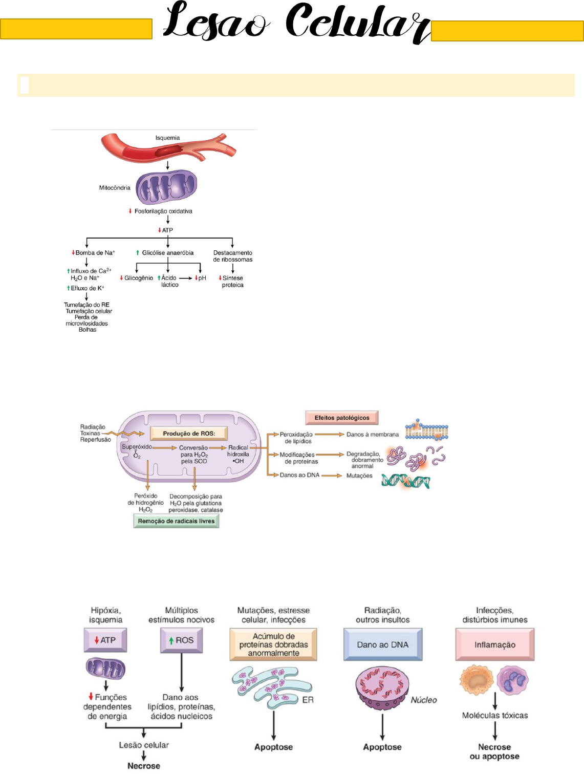 PRINCIPAIS CAUSAS 1. Isquemia 2. Trauma 3. Agentes infecciosos e químicos 4. Distúrbios genéticos 5. Reações Imunológicas Kaylaine Andrade T12 LESÃO REVERSÍVEL É um estágio em que caso o estimulo prejudicial seja removido a célula consegue retornar a sua função e morfologia. Falha das bombas iônicas dependentes de energia na membrana plasmática → Incapacidade de manter a homeostasia iônica e líquida → Células e organelas tumefeitas de água. Em algumas formas de lesão, organelas degeneradas e lipídios podem se acumular dentro das células lesionadas. Histologia Alterações morfológicas na lesão celular reversível e irreversível (necrose). (A) Túbulos renais normais com células epiteliais viáveis. (B) Lesão isquêmica inicial (reversível) mostrando, em células ocasionais, bolhas na superfície, eosinofilia aumentada do citoplasma e tumefação celular. (C) Lesão necrótica (irreversível) das células epiteliais com perda dos núcleos, fragmentação das células e extravasamento dos conteúdos LESÃO IRREVERSÍVEL Ocorre quando a partir de certo ponto a células não consegue mais retornar a sua função e morfologia normal. Ocorre por três motivos: 1. Incapacidade de restaurar a função mitocondrial 2. A perda de estrutura e das funções da membrana plasmática e das membranas intracelulares 3. A perda de DNA e da integridade estrutural da cromatina Morte celular NECROSE 1. Isquemia 2. Exposição a toxinas 3. Infecções e traumatismos A necrose é uma forma de morte celular, na qual as membranas celulares se desintegram e as enzimas celulares extravasam e, por fim, digerem a célula. A necrose provoca uma reação local do hospedeiro, chamada inflamação, que é induzida por substâncias liberadas das células mortas e que serve para eliminar os debris celulares e iniciar o processo de reparo subsequente. As enzimas responsáveis pela digestão da célula são derivadas dos lisossomos e podem ser provenientes das próprias células moribundas ou de leucócitos recrutados como parte da reação inflamatória. • Alterações citoplasmáticas. As células necróticas exibem aumento da eosinofilia (i. e., elas ficam coradas de vermelho pelo corante eosina – o “E” na coloração de hematoxilina e eosina, “H&E”), atribuível em parte às proteínas citoplasmáticas desnaturadas que se ligam à eosina. • Alterações nucleares. As alterações nucleares assumem um dos três padrões, todos resultantes da degradação da cromatina e do DNA. A picnose é caracterizada por retração nuclear e aumento da basofilia; o DNA se condensa em uma massa retraída escura. • Destino das células necróticas. As células necróticas podem persistir por algum tempo ou serem digeridas por enzimas e desaparecer. As células mortas são substituídas por figuras de mielina, que são fagocitadas por outras células ou degradadas em ácidos graxos. Esses ácidos graxos se ligam a sais de cálcio, resultando em células mortas calcificadas. PADRÕES MORFOLÓGICOS DE NECROSE TECIDUAL Necrose de coagulação É a forma de necrose tecidual na qual a arquitetura básica dos tecidos permanece preservada por, pelo menos, alguns dias após a morte celular. Necrose liquefativa É observada em infecções bacterianas focais ou, ocasionalmente, nas infecções fúngicas, porque os microrganismos estimulam o rápido acúmulo de células inflamatórias e as enzimas dos leucócitos digerem (“liquefazem”) o tecido. Necrose gangrenosa Em geral, aplica-se a um membro, normalmente a perna, que perdeu o seu suprimento sanguíneo e sofreu necrose de coagulação, envolvendo várias camadas de tecido. Necrose caseosa É encontrada mais frequentemente em focos de infecção tuberculosa. O termo caseoso (semelhante a queijo) refere-se à aparência friável branco-amarelada da área de necrose no exame macroscópico. Necrose gordurosa Refere-se a áreas focais de destruição gordurosa, em geral resultante da liberação de lipases pancreáticas ativadas na substância do pâncreas e na cavidade peritoneal. Isso ocorre na emergência abdominal calamitosa conhecida como pancreatite aguda. Necrose fibrinoide É uma forma especial de necrose. Geralmente ocorre em reações imunes em que complexos de antígenos e anticorpos são depositados nas paredes dos vasos sanguíneos, mas também pode ocorrer na hipertensão grave. APOPTOSE Morte celular programada VIA INTRINSECA OU MITOCONDRIAL Mitocôndrias contêm várias proteínas que são capazes de induzir apoptose, incluindo o citocromo c. 1. Sensores proteína BH3- Only são ativados 2. Produção de Bak e Bax pró-inflamatórias 3. Como resultado, Bak e Bax se dimerizam, se inserem na membrana mitocondrial e formam canais através dos quais o citocromo c e outras proteínas mitocondriais extravasam para o citosol. 4. Membranas mitocondriais se tornam permeáveis 5. O citocromo c escapa para o citoplasma, desencadeando a ativação da caspase 9. 6. O resultado final é a ativação de uma cascata de caspases que desencadeia a fragmentação nuclear e leva à formação de corpos apoptóticos. 7. Morte celular VIA EXTRINSECA OU DO RECEPTOR DE MORTE Muitas células expressam moléculas de superfície, chamadas receptores de morte, que desencadeiam a apoptose. Família do receptor do fator de necrose tumoral (TNF), que contém em suas regiões citoplasmáticas um “domínio de morte” conservado, assim chamado porque ele medeia a interação com outras proteínas envolvidas na morte celular. 1. Os receptores de morte prototípicos são o receptor de TNF tipo I e Fas (CD95). O ligante de Fas (FasL) é uma proteína de membrana expressa principalmente em linfócitos T ativados. 2. Quando essas células T reconhecem alvos que expressam Fas, as moléculas Fas são ligadas em reação cruzada pelo FasL e se ligam a proteínas adaptadoras através do domínio de morte. 3. Estas, então, recrutam e ativam a caspase-8, que, por sua vez, a