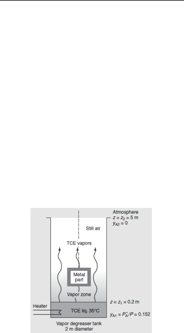 UNIVERSIDADE FEDERAL DO RIO GRANDE ESCOLA DE QUÍMICA E ALIMENTOS DISCIPLINA DE FENÔMENOS DE TRANSPORTE III Segunda Avaliação de Fenômenos de Transporte III – 2021/02 1 – Desengraxantes a vapor, como o mostrado na figura, são amplamente usados para a limpeza de peças de metal. Um solvente líquido repousa no fundo do tanque desengordurante. Um sistema de aquecimento imerso no solvente vaporiza uma pequena porção do solvente e mantém uma temperatura constante, de forma que o solvente exerça uma pressão de vapor constante. As peças previamente resfriadas a serem limpas são suspensas na zona de vapor do solvente onde a concentração de vapor do solvente é mais alta. O solvente condensa nestas partes, dissolve a graxa, e então pinga de volta para o tanque, e assim limpa as partes da peça. Desengraxantes a vapor são muitas vezes deixados abertos para a atmosfera para facilitar o mergulho e a remoção das peças e porque cobri-los pode resultar na formação de uma atmosfera explosiva. Quando o desengraxante não é usado, difusão molecular do vapor do solvente através do ar estagnante dentro do espaço acima da superfície do líquido pode resultar em significante emissão do solvente, porque a atmosfera a seu redor serve como um reservatório infinito para o processo de transferência de massa. Quando a quantidade de solvente no tanque desengraxante é grande relativamente à quantidade de vapor emitido, um processo de difusão em estado estacionário com um fluxo de difusão constante se mantém desde a superfície líquida até a extremidade superior. Um tanque desengordurante cilíndrico com um diâmetro de 2 m e uma altura total de 5 m está em operação, e a altura do nível do solvente é mantida constante a 0,2 m. A temperatura do solvente e da parte interior do desengraxante é mantida constante em 35oC. O solvente utilizado é o tricloroetano (TCE). As normas de operação de desengraxantes requerem que o equipamento não libere mais do que 1 kg do solvente por dia. A taxa de emissão estimada do desengraxante excede este limite? O TCE tem uma massa molecular de 131,4 g/mol e uma pressão de vapor de 115,5 mmHg a 35oC. O coeficiente de difusão binário do TCE no ar é de 0,088 cm2/s determinado a 350C. 2 - Considere o problema da transferência de oxigênio da cavidade interior do pulmão, atravessando o tecido pulmonar, para a rede de vasos sanguíneos no lado oposto. O tecido pulmonar (espécie B) pode ser aproximado por uma parede plana com espessura L. Pode- se considerar que o processo de inalação é capaz de manter uma concentração molar constante (CA0) de oxigênio (espécie A) na superfície interna do tecido (x = 0) e que a assimilação do oxigênio pelo sangue é capaz de manter uma concentração molar constante CAL de oxigênio na superfície externa do tecido (x = L). Há consumo de oxigênio no tecido devido aos processos metabólicos e a reação é de ordem zero, com RA = -k0. Obtenha uma expressão para a distribuição das concentrações de oxigênio ao longo da espessura do tecido. Para isso, liste todas as hipóteses simplificadoras pertinentes. Determine também uma expressão para a taxa de assimilação do oxigênio (consumo de oxigênio) pelo sangue por unidade de área superficial do tecido. 3 - Considere um organismo cilíndrico de raio r0 no interior do qual ocorre respiração a uma taxa volumétrica uniforme RA = -k0. Isto é, o consumo de oxigênio (espécie A) é governado por uma reação química homogênea de ordem zero. a) Se uma concentração molar de CA(r0) = CA0 for mantida na superfície do organismo, obtenha uma expressão para a distribuição radial do oxigênio, CA(r), no interior do organismo; b) Obtenha uma expressão para a taxa de consumo de oxigênio no interior do organismo; c) Considere um organismo de raio r0 = 0,10mm e um coeficiente de difusão para a transferência do oxigênio de DAB = 10-8 m2/s. Sendo CA,0 = 5 x 10-5 kmol/m3 e k0 = 1,2 x 10-4 kmol/(s m3), qual é a concentração molar do O2 no centro do organismo?.