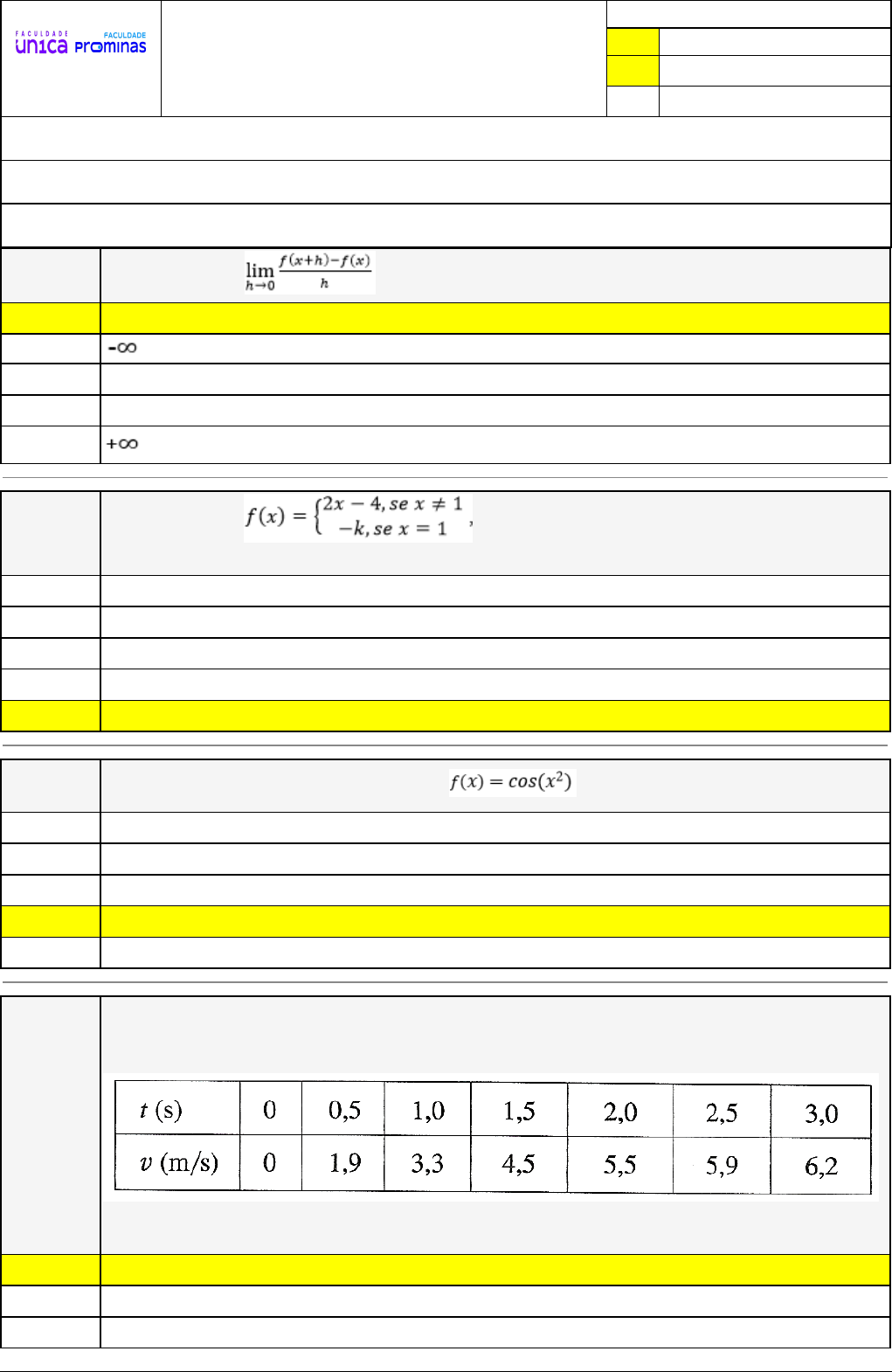 Pincel Atômico - 27/07/2024 18:14:44 1/3 FERNANDO DOS SANTOS Avaliação Online (Curso Online - Automático) Atividade finalizada em 24/03/2024 20:33:36 (1323162 / 1) LEGENDA Resposta correta na questão # Resposta correta - Questão Anulada X Resposta selecionada pelo Aluno Disciplina: CÁLCULO DIFERENCIAL E INTEGRAL I E II [951801] - Avaliação com 10 questões, com o peso total de 30,00 pontos [capítulos - Todos] Turma: Segunda Graduação: Segunda Graduação 6 meses - Licenciatura em Física - Grupo: FPD-OUTUBRO/2023 - SGegu0A261023 [103867] Aluno(a): 91525356 - FERNANDO DOS SANTOS - Respondeu 8 questões corretas, obtendo um total de 24,00 pontos como nota [360032_39672] Questão 001 O resultado de para f(x) = 3x é: X 3 0 -3 [360032_39638] Questão 002 Dada a função o valor de k para que essa função seja contínua em x = 1 é: K = 3 K = 4 K = 1 K = 5 X K = 2 [360032_39678] Questão 003 Ao calcularmos a derivada da função encontramos como resultado: -2xcotg(x²) -2xcos(x²) -2xcosec(x²) X -2xsen(x²) -2xtg(x²) [360032_70911] Questão 004 A velocidade de um corredor aumenta regularmente durante os três primeiros segundos de uma corrida. Sua velocidade em intervalos de meio segundo é dada em uma tabela: Utilizando os extremos esquerdos de cada intervalo podemos dizer que a distância percorrida pelo atleta é X 10,55 13,55 12,55 Pincel Atômico - 27/07/2024 18:14:44 2/3 14,55 11,55 [360034_39779] Questão 005 A derivada da função (pela definição) é: x2 x/3 x-1 X 2 0 [360033_70202] Questão 006 X [360033_39711] Questão 007 A rotina diária de exercícios de um triatleta consiste em nadar, pedalar e correr, nessa ordem. Sabe-se que ele corre mais rápido do que nada e pedala mais rápido do que corre, e que não há intervalo de tempo para descanso entre as três atividades físicas. O gráfico que melhor representa a distância percorrida durante o tempo da rotina diária de exercícios desse triatleta é X Pincel Atômico - 27/07/2024 18:14:44 3/3 [360033_70214] Questão 008 1 X 0 [360034_70216] Questão 009 -2 2 X 0 1 3 [360033_39813] Questão 010 A função tem um ponto crítico para x igual a: 0 X 1 -2 -1 2