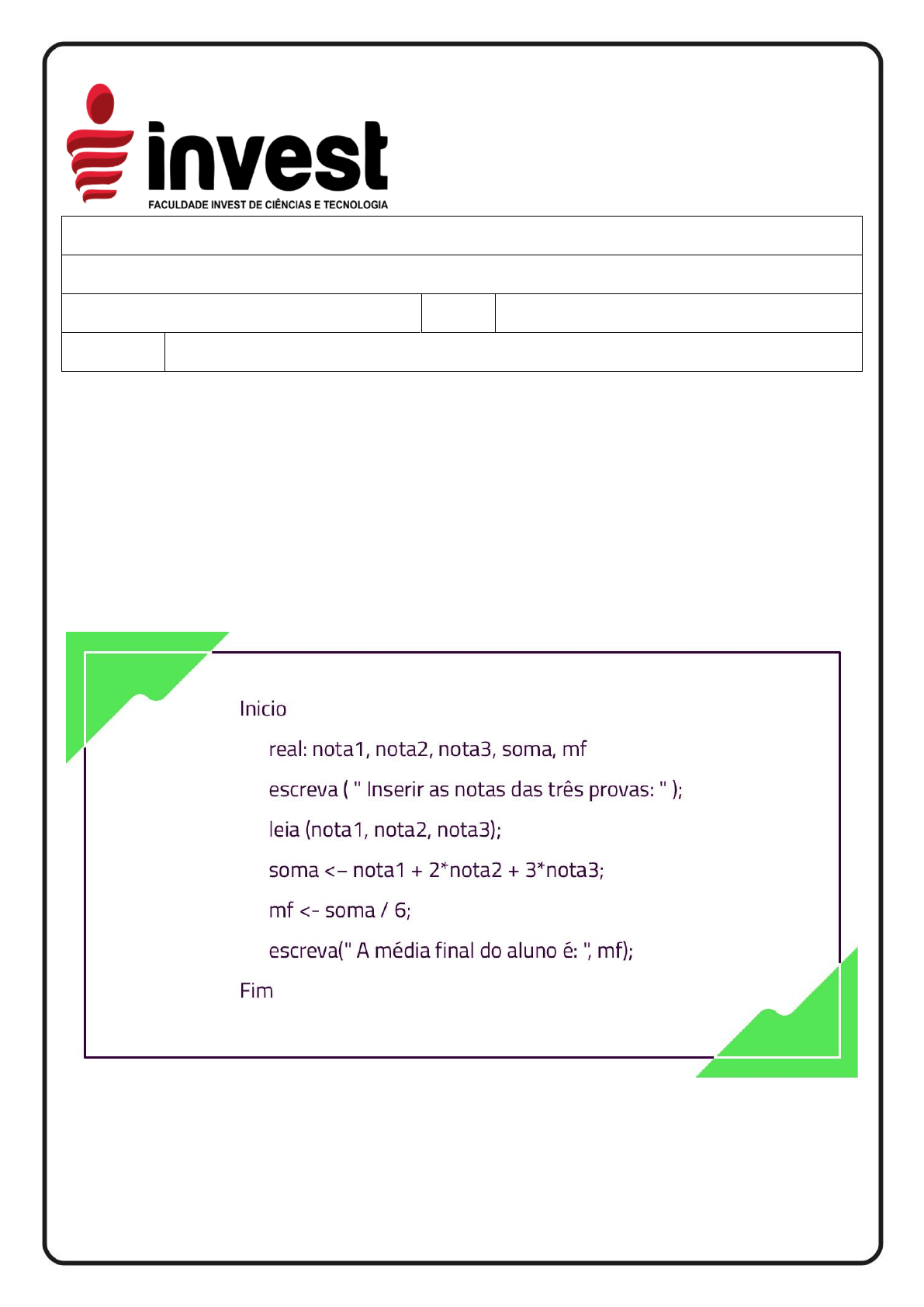 Curso: Ciência da computação / Análise e desenvolvimento de sistemas Discente: Professor: Ed Wilson Jr. Data: Disciplina Algoritmos e Linguagem de Programação EXAME FINAL – 2021/1 1ª Questão: Algoritmos podem ser utilizados com a finalidade de auxiliar professores a determinar a média final de seus alunos. O seguinte algoritmo recebe como entrada as notas nas três avaliações realizadas (n1, n2 e n3) e retorna a média final (mf) do aluno. Perceba que a média calculada é uma média ponderada que dá peso diferente a cada uma das avaliações: Se João teve as seguintes notas nas avaliações: n1 = 9.73 n2 = 3.21 www.institutoinvest.edu.br n3 = 5.45 De acordo com o algoritmo, qual será a sua média final? a) 5.41. b) 7.0. c) 6.0. d) 5.19. e) 5.40. 2ª Questão: Considerando o conceito e as características de um algoritmo sequencial, analise as sentenças apresentadas abaixo. I. A estrutura básica de um algoritmo sequencial é comandos de entrada, atribuição e saída, e utiliza uma estrutura de execução sequencial. II. Um algoritmo sequencial executa os comandos colocados em sequência, no mínimo, uma vez. III. O algoritmo sequencial não utiliza laços de repetição nem testes condicionais. É correto o que se afirma na(s): a) Alternativa I. b) Alternativas I e III. c) Alternativa II. d) Todas as alternativas estão corretas. e) Nenhuma alternativa está correta. 3ª Questão: Uma construtora realizou uma pesquisa com seus funcionários e verificou que cerca de 50% deles estão acima do peso. A pesquisa também apontou que os funcionários necessitam de reeducação alimentar e não praticam atividades físicas. Assim, a empresa contratou uma nutricionista e um restaurante para a preparação das refeições de seus colaboradores. Também buscou uma parceria com uma academia e está introduzindo uma campanha para que os funcionários busquem uma vida mais saudável focando em atividades físicas e reeducação alimentar. Primeiramente, os profissionais da academia medirão o índice de massa corporal (IMC) dos funcionários da construtora para determinar, juntamente com a nutricionista contratada, o tipo de treinamento personalizado para cada pessoa e também o cardápio que deverá ser oferecido para os diversos casos para a empresa. O IMC é uma das formas mais utilizadas para determinar se os níveis de gordura e o peso da pessoa estão dentro do recomendado pela Organização Mundial da Saúde. A fórmula para calcular o IMC necessita do peso e da altura do indivíduo: O algoritmo deve mostrar como saída a tabela abaixo, para que seja possível ver em que categoria o funcionário da construtora se encontra. Valores do IMC: Abaixo do peso – menor que 18,5 Normal – entre 18,5 e 24,9 Acima do peso – entre 25 e 29,10 Obeso – 30 ou mais Analise os algoritmos em forma de fluxograma apresentados a seguir. Em qual alternativa é correta a representação do fluxograma para a solução do problema? a) Alternativa I. b) Alternativa III. c) Alternativas I e II. d) Alternativas I, II e III. e) Nenhuma alternativa. 4ª Questão: Observe o algoritmo em pseudocódigo para a solução de um problema matemático: Um algoritmo pode ter mais de uma solução para determinado problema. Analise os algoritmos apresentados nas alternativas a seguir. Selecione qual alternativa representa de forma correta uma solução para o problema matemático apresentado. a) I b) II c) III d) I e II e) I e III 5ª Questão: Elabore o fluxograma para o programa de IMC especificado abaixo: 6ª Questão: Muitos são os processos hoje automatizados com o uso do computador dentro das empresas nas mais variadas áreas do setor industrial, comercial e de serviços. Auxilie a empresa a identificar e descrever os passos para o processo de apostas na lotérica. Para isso, identifique: Quais são os dados de entrada? Quais são as etapas que envolvem o processamento? Quais são os dados de saída? Em seguida, descreva, elaborando um texto/narrativa, os principais passos que uma pessoa da comunidade precisa seguir para a realização de uma aposta na lotérica. 7ª Questão: Escreva um programa em JAVA (copie o código da implementação aqui ou o link público do arquivo na nuvem) que repita a leitura de uma senha até que ela seja válida. Para cada leitura de senha incorreta informada, escrever a mensagem "Senha Invalida". Quando a senha for informada corretamente deve ser impressa a mensagem "Acesso Permitido" e o algoritmo encerrado. Considere que a senha correta é o valor 2002. Entrada A entrada é composta por vários casos de testes contendo valores inteiros. Saída Para cada valor lido mostre a mensagem correspondente à descrição do problema. 8ª Questão: A linguagem Java tem muitos recursos e uma comunidade muito ativa. Com relação a esses recursos, é possível afirmar: I. Java é uma linguagem compilada. Por isso, sua execução é tão rápida e sua portabilidade é muito boa. II. Java não diferencia entre letras maiúsculas e minúsculas; daí seu alto grau de legibilidade. III. A sintaxe da linguagem Java é muito parecida com a linguagem C. Assinale a opção correta de acordo com o que foi dito anteriormente: a) Somente a III está correta. b) Somente I e III estão corretas. c) Somente a II está correta. d) Somente II e III estão corretas. e) Somente a I está correta. 9ª Questão: A necessidade de armazenamento de informações faz com que os sistemas se tornem algo indispensável para as atividades mais simples do cotidiano das pessoas. Dessa forma, podemos fazer uso de diversas estruturas que, ao serem inseridas no algoritmo, contribuem para que o problema seja solucionado da melhor maneira possível. Aqui, utilizaremos uma estrutura de repetição para que as informações sejam solicitadas conforme a condição pré-estabelecida. Você é o responsável pela TI de uma instituição de ensino superior, e ela necessita de um programa que realize a soma das 4 notas dos a
