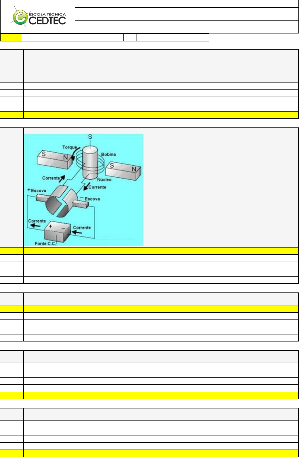 19/06/2024 22:34:22 1/3 REVISÃO DE SIMULADO Nome: JUANEIS AREAS DE SOUZA JUNIOR Disciplina: Máquinas Elétricas e Transformadores Respostas corretas são marcadas em amarelo X Respostas marcardas por você. Questão 001 Marque V para verdadeiro e F para falso: ( ) Teoricamente, todo motor pode ser um gerador. ( ) Existem 8 tipos básicos de máquinas de corrente contínua. ( ) Armadura é a parte girante de uma máquina de CC. ( ) Campo é a parte estática de um motor de CC. ( ) Campo é a parte estática de um motor de CA. A) F, F, V, V, V B) F, V, V, F, F C) F, V, V, F, V D) V, V, F, V, V X E) V, F, V, V, F Questão 002 A figura abaixo refere-se: X A) À constituição básica de um motor de CC B) Ao motor de indução assíncrono C) Ao motor síncrono D) Ao motor síncrono E) Ao motor monofásico de fase auxiliar Questão 003 Em um motor de CC, a conexão do enrolamento da armadura é feita por meio de: X A) Escovas B) Bornes de conexão C) Um circuito retificador D) Receptáculos E) Conectores Questão 004 O motor adquire um alto torque de partida, o qual diminui com a rotação. Esta característica é muito interessante para aplicação com forte tração, como em guindastes, tração elétrica, etc... Esta afirmação refere-se: A) Ao motor paralelo. B) Ao motor universal C) Ao motor monofásico de fase auxiliar D) Ao motor composto X E) Ao motor série (excitação série) Questão 005 Seu objetivo é tornar possível o aproveitamento do alto torque da ligação série, sem os disparos de velocidade com cargas reduzidas ou sem carga, e em seguida fazer uso da baixa variação de velocidade do motor shunt, mesmo variando a carga. Estamos nos refirindo ao: A) Motor monofásico de fase auxiliar B) Motor universal C) Motor série D) Motor paralelo X E) Motor composto 19/06/2024 22:34:22 2/3 Questão 006 A figura a seguir representa qual tipo de partida de motor? A) Partida série-paralelo X B) Partida com Autotransformador (auto-trafo) C) Partida com soft-starter D) Partida estrela-triângulo E) Partida direta Questão 007 A figura a seguir representa qual tipo de partida de motor? A) Partida direta B) Partida por soft-starter C) Partida com auto-trafo X D) Partida estrela-triângulo E) Partida série-paralelo Questão 008 Dispositivo eletrônico utilizado para variação de velocidade do motor de indução trifásico: A) Retificador trifásico X B) Inversor de frequência C) Soft-starter D) CLP E) PLC 19/06/2024 22:34:22 3/3 Questão 009 Representa a diferença entre a velocidade do rotor e a velocidade de variação do campo magnético no estator: A) Fator de uso B) Rendimento C) Fator de potência X D) Escorregamento Questão 010 Um motor de indução trifásico ligado em 50Hz, fornece 989 rpm quandoligado em vazio. Numa determinada condição de carga apresenta um escorregamento de 5,5%. Qual é o número de polos do motor? A) 10 X B) 6 C) 4 D) 8 E) 12