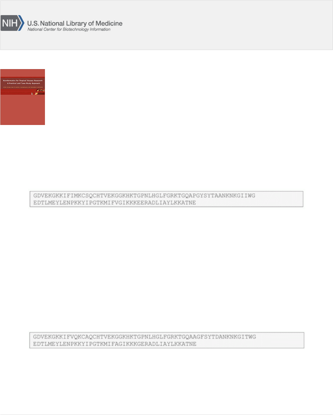 NLM Citation: Setubal JC, Braeuning R. Similarity Search. 2006 Feb 10 [Updated 2007 Mar 9]. In: Gruber A, Durham AM, Huynh C, et al., editors. Bioinformatics in Tropical Disease Research: A Practical and Case-Study Approach [Internet]. Bethesda (MD): National Center for Biotechnology Information (US); 2008. Chapter A05. Bookshelf URL: https://www.ncbi.nlm.nih.gov/books/ Chapter A05. Similarity Search João Carlos Setubal, PhD1 and Ruediger Braeuning, PhD2 Created: February 10, 2006; Updated: March 9, 2007. João Carlos Setubal has authored the theoretical part of this chapter and Ruediger Braeuning has authored the tutorial. Why Sequence Comparison Is Important Consider the following protein sequence: It is the sequence of a small protein found in humans, called cytochrome c. Its function is to carry electrons in the cell. The full description from the SwissProt database (http://us.expasy.org, also mirrored at other sites) is: Electron carrier protein. The oxidized form of the cytochrome c heme group can accept an electron from the heme group of the cytochrome c1 subunit of cytochrome reductase. Cytochrome c then transfers this electron to the cytochrome oxidase complex, the final protein carrier in the mitochondrial electron- transport chain. This description, although irrelevant in what follows, serves the useful purpose to remind us that proteins are three-dimensional structures that perform specific biochemical roles in a cell. It is easy to forget this fundamental fact when dealing with the strings of letters that represent proteins (or DNA), as I do in this entire chapter. Now consider the following sequence: It is the sequence of a protein found in mice, whose function is the same as that of the human protein, and therefore is also known as cytochrome c. A cursory look at these two sequences suggests that they are very similar. In fact, one could play the children's game "spot the differences" and, with some patience, visually determine all differences that exist between these two sequences. For example, the first difference is in the 11th residue: in the human sequence, we find an I, whereas in the mouse sequence there is a V. Author Affiliations: 1 Virginia Bioinformatics Institute and Department of Computer Science; Virginia Polytechnic Institute and State University; Email: setubal@vbi.vt.edu. 2 National Bioinformatics Network; University of the Western Cape; Bellville; South Africa; Email: ruedigerb@gmail.com. http://us.expasy.org One way to be more systematic about finding the differences is to align these two sequences. This means placing one on top of the other, so that it is easier to tell which positions are the same and which positions are different. Here is this alignment, with the human sequence on top and the mouse sequence on the bottom: Notice that the alignment had to be broken into two sections, because the sequences are too long to fit in a single line. Notice also that there are asterisks below the second sequence to show positions where there is a match between a residue (or character) in the first sequence and a character in the second sequence. Thus, we can immediately see that there are exactly nine positions where these two sequences differ, of a total of 104 positions. This gives us our first measure of similarity between these two sequences: they are 91% (95/104) identical. Intuition suggests that this is a high level of similarity, and indeed it is. It is no coincidence that two proteins, although from two different species, have the same function with highly similar sequences. Humans and mice are mammals, and they share an ancestor that probably existed about 80 million years ago. It is likely that this ancestor had a cytochrome c protein, and the sequences above are descendants of that primitive sequence, just as each species is as a whole (but please note the caveats in the next section). Many of the protein sequences in mice and humans are similar for this reason, and this gives us a powerful tool to find clues about protein function. In the case of cytochrome c, independent bench experiments determined the function of each of the two proteins. For many other newly discovered proteins, however, we can formulate hypotheses for their function based on similarity with known proteins. This is a primary motivation for comparing sequences. If sequence similarities were restricted to closely related species, such as humans and mice, sequence comparison would be of limited use. Fortunately, this is not the case, as can be shown by comparing the human cytochrome c sequence to cytochrome c sequences from other organisms. Let us start with Drosophila melanogaster, the fruit fly. Here is its sequence: This time it is not so straightforward to align this sequence to the human sequence. The first problem is that this sequence has 107 characters, instead of 104. So it is not immediately clear how to align one on top of the other, as we did before. But again, some visual inspection suggests that the sequences are very similar. For example, we could notice that both sequences have the strings GDVEKGKK at or near the beginning. On the basis of this observation, we could create the following alignment: 2 Bioinformatics in Tropical Disease Research Karen We have obtained an alignment where there are 80 identical positions. Again, this level of similarity is very high. If we did not know what the function of the D. melanogaster protein was, we would be able to hypothesize that it has the same function as the one from human, although humans and flies are very different organisms. Now let us see what we can do with the cytochrome c sequence from Caenorhabditis elegans, a worm and well- studied model organism. Here is its sequence: This sequence has 107 characters, so we have again the problem of differing lengths. Our method of visual inspection may suggest local similarities, but to obtain a good alignment, it will not suffice to simply shift one sequence with respect to
