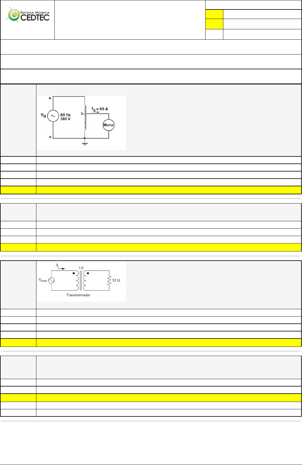Pincel Atômico - 28/07/2024 08:02:20 1/1 FERNANDA SIMONELLI GALON Exercício Caminho do Conhecimento - Etapa 6 (25630) Atividade finalizada em 15/06/2024 13:37:48 (2106785 / 1) LEGENDA Resposta correta na questão # Resposta correta - Questão Anulada X Resposta selecionada pelo Aluno Disciplina: MÁQUINAS ELÉTRICAS E TRANSFORMADORES [1087684] - Avaliação com 4 questões, com o peso total de 6,50 pontos [capítulos - 113] Turma: Curso Técnico: Automação Industrial - Grupo: EAD - 04/24 - EAD AUT [120870] Aluno(a): 91608828 - FERNANDA SIMONELLI GALON - Respondeu 4 questões corretas, obtendo um total de 6,50 pontos como nota [349990_175693] Questão 001 Analise o circuito a seguir em que um autotransformador, regulado em um ponto de derivação de 58,8%, alimenta um motor de indução por meio de um módulo de corrente. Nesse caso, a potência nominal desse autotransformador é igual a: 5,52 kVA 9,39 kVA 7,89 kVA 6,73 kVA X 13,41 kVA [349988_175696] Questão 002 A expansão dos sistemas elétricos em corrente alternada a grandes distâncias está basicamente estruturada com a aplicação dos transformadores. Entretanto, nos transformadores reais, temos vários tipos de perdas. A perda por produção de calor nas bobinas do transformador é devida a: Capacitâncias parasitas dos enrolamentos das bobinas. Indutância mútua entre os enrolamentos. Histerese magnética do núcleo do transformador. X Resistências ôhmicas dos enrolamentos das bobinas. [349989_175691] Questão 003 No circuito da figura, a potência dissipada no resistor é igual a 30 kW. Sabendo-se que o transformador é ideal, então, o valor, em ampères, da corrente I x é: 10 50 25 125 X 250 [349990_175695] Questão 004 Sobre TC (Transformadores de Corrente), é verdade o que se afirma no(s) item(ns): I. Transformadores de corrente (TCs) são equipamentos usados na medição de sistemas elétricos. II. Existem vários tipos de (TCs), os do tipo Núcleo Ferro Doce, Núcleo Ferro Branco e Núcleo Ferro Cinza. III. Transformadores de corrente (TCs) são equipamentos usados na proteção de sistemas elétricos. II e III, apenas I, II e III X I e III, apenas I, apenas I e II, apena