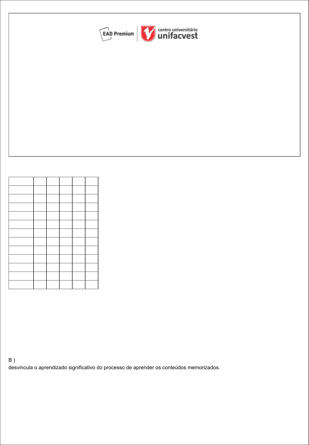 Requisição: 6935119 Matricula: 661521 Data: 02/04/2024 22:04 Página: 1/5 Prova presencial regular Curso: 48 MESES - LICENCIATURA PEDAGOGIA - UNIFACVEST EAD Módulo: 12 Grupo: 201 Município: UBERLÂNDIA - MG Disciplina(s): 101229 - AVALIAÇÃO DA APRENDIZAGEM Nome: 661521 - EDILENE DE SOUSA RESPLANDES SOUZA Data: ___/___/_________ Hora:___|___|___ Assinatura do aluno: ________________________________________________________ Preencha o gabarito abaixo com X na coluna correta. Atente para a coluna de numeração e das alternativas. Questões A B C D E 1 2 3 4 5 6 7 8 9 10 11 12 1 ) Assinale a alternativa que completa corretamente o trecho a seguir. A avaliação classificatória orienta o professor a mensurar o conhecimento apropriado pelo aluno, exigindo que mude sua forma de avaliar. Quando o docente avalia para classificar o desempenho do estudante, ele: A ) desvincula o aprendizado significativo da cópia e memorização dos saberes. B ) desvincula o aprendizado significativo do processo de aprender os conteúdos memorizados. C ) desvincula o aprendizado significativo do processo de ensinar. D ) desvincula o aprendizado significativo do processo de reproduzir o que foi ensinado pelo professor. E ) desvincula o aprendizado significativo do processo de estudar para a prova. 16 05 2024 17 48 EDILENE DE OUSA RESPLANDES SOUZA Requisição: 6935119 Matricula: 661521 Data: 02/04/2024 22:04 Página: 2/5 2 ) No Brasil, o início do processo avaliativo foi uma ação aplicada pelos jesuítas, desde o ano de 1599. Nesse período, como era a prática do ensino adotada? A ) Voltada a conteúdos direcionados para que os alunos aprendessem para a vida e para o mercado de trabalho. B ) Voltada a ações educativas inovadoras e comprometidas com o ensino de qualidade. C ) Voltada à transmissão dos conteúdos pelos professores, com repetição, memorização e mera reprodução dos saberes ensinados. D ) Voltada a apresentar o que o aluno aprendia e ao direcionamento que o professor devia dar quando o aluno demonstrava que não havia aprendido os conteúdos. E ) Voltada ao propósito de que o aluno estudasse e construísse saberes que fossem significativos e aplicáveis à sua realidade. 3 ) Complete a reflexão a seguir sobre os cenários das representações sociais. As representações sociais causam grande impacto nas pessoas, visto que se expressam por meio de ________________________________. A ) conhecimentos prévios B ) pensamentos sociais C ) habilidades e atitudes D ) comportamentos e sentimentos E ) saberes sobre os conteúdos discutidos em sala de aula 4 ) Assinale a alternativa que completa corretamente o trecho a seguir. Na proposta de ensino tecnicista, a formação do aluno deve ser direcionada para atender às exigências do ____________________. A ) mundo educacional B ) mundo cultural C ) mundo econômico D ) mundo social E ) mundo de trabalho 5 ) Avaliar nos anos finais do ensino fundamental exige do professor um olhar democrático e critérios justos. Assinale a alternativa correta sobre a avaliação nesse contexto. A ) A avaliação deve direcionar atividades para assimilação dos conteúdos, preparando os alunos para as próximas atividades e Requisição: 6935119 Matricula: 661521 Data: 02/04/2024 22:04 Página: 3/5 avaliações. B ) A avaliação deve ser aplicada em tempos específicos, visando apenas classificar e mensurar a aprendizagem dos estudantes. C ) A avaliação deve partir da verificação das respostas dos alunos, e o professor deve retomar os conteúdos por meio de feedbacks para futuras aprendizagens. D ) A avaliação deve promover um encaminhando de recuperação, caso o aluno não alcance as notas das provas e não realize as atividades. E ) A avaliação deve estimular o aluno a compreender seu papel como corresponsável pela própria aprendizagem. 6 ) Quando avaliamos com base no levantamento de hipóteses, observando as dificuldades dos alunos, esclarecendo dúvidas, orientando para novos caminhos de aprendizagem, usando termos de apoio e incentivo na busca de novos saberes, sem, entretanto, reprender ou julgar negativamente, estamos avaliando de maneira: A ) ética, com responsabilidade, sem provocar constrangimentos. B ) que leve a criança a pensar e não errar mais. C ) direta, para que a criança saiba que precisa estudar mais. D ) franca, assim a criança se acostuma com feedbacks positivos e negativos. E ) objetiva, apontando os erros e acertos. 7 ) Aponte a alternativa que completa corretamente a frase a seguir. No contexto da escola nova o professor é um: A ) mediador e facilitador do processo e aprendizagem, levando os interesses dos alunos em consideração para trabalhar os conteúdos. B ) reprodutor de conhecimentos, levando o aluno a memorizar e copiar as respostas do que foi aprendido em sala de aula. C ) orientador de conteúdos técnicos, pois deve preparar os estudantes para atuar no mundo do trabalho. D ) organizador e planejador dos conteúdos que são fundamentais para que os alunos aprendam. E ) auxiliador do estudante, promovendo a compreensão de acertos e erros. 8 ) Assinale a alternativa correta sobre a Lei Capanema. A ) Trata-se das Leis dos Planos Nacionais de Educação. B ) Trata-se das Leis das Avaliações. C ) Requisição: 6935119 Matricula: 661521 Data: 02/04/2024 22:04 Página: 4/5 Trata-se das Leis das Bases Curriculares Nacionais da Educação. D ) Trata-se das Leis da Base Nacional Comum Curricular. E ) Trata-se do Conjunto de Leis Orgânicas do Ensino. 9 ) Ao acompanhar o desenvolvimento individual do aluno na avalição mediadora, o professor verifica: A ) se o aluno estudou todos os conteúdos e os decorou para realizar as atividades. B ) se, após aplicada a avaliação, a nota é compatível com as exigências da escola com relação à média para aprovação. C ) se o aluno aprendeu; caso contrário, direciona várias atividades, como lição de casa e pesquisas. D ) o progresso de cada estudante e pensa
