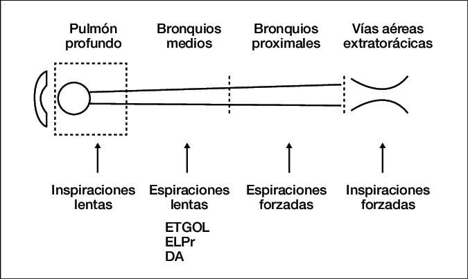 Pulmón Bronquios Bronquios Vías aéreas profundo medios proximales extratorácicas Inspiraciones Espiraciones Espiraciones Inspiraciones lentas lentas forzadas forzadas ETGOL ELPr DA