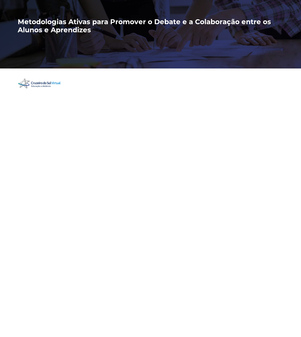 Conteudista: Prof. Me. Douglas Zampar Revisão textual: Profa. Dra. Selma Aparecida Cesarin Contextualização Construindo seu Repertório Think, Pair, Share Peer Instruction GV-GO Método Trezentos Fórum Wiki Mais sobre Construir seu Repertório Material Complementar Referências Metodologias Ativas para Promover o Debate e a Colaboração entre os Alunos e Aprendizes Imagine um estudante que tem um celular, acesso à internet e muita curiosidade para aprender. Esse estudante gosta muito de séries de TV e, além de assistir, lê muito a respeito delas. Esse aluno está acostumado a interagir com os textos pelo celular, a pular de um link para outro, a parar quando quer para ligar a TV e assistir um episódio da série sobre a qual estava lendo. Porém, quando chega em sala de aula, precisa se sentar por cerca de uma hora e ouvir uma pessoa contando para ele sobre um conteúdo que não o interessa e que não parece ter utilidade alguma. Como você acha que será a aprendizagem desse aluno nesse contexto? E o engajamento? E o comportamento? E se eu disser a você que há um jeito de transformar sua aula em uma experiência de aprendizagem com potencial de conquistar esse aluno, e de mostrar para ele que há conexão entre o que ele estuda e o exercício da cidadania e da profissão, mostrar para ele que muitas vezes a gente aprende não apenas pelo conteúdo, mas para nos tornarmos mais inteligentes, mais aptos a lidar com os problemas que a vida nos joga? Essa é justamente a proposta das Metodologias ativas que você encontra nesta Unidade de Aprendizagem. Depois de conhecer as Metodologias, escolha a mais apropriada e comece a fazer parte da tão necessária transformação de nossa Educação. 1 / 11 Contextualização Esta introdução é bem curta, pois já passamos pela fase de teoria, preparação e sensibilização. Como você já sabe, para ser um(a) professor(a) que inova e agrega valor ao que entrega em sala de aula por meio das Metodologias Ativas, você precisa de repertório. Esta Unidade tem como objetivo de impacto ampliar seu repertório em Metodologias Ativas. Vamos lá? 2 / 11 Construindo seu Repertório A metodologia Think, Pair, Share pode ser utilizada em diversos momentos, e tem grande potencial para gerar aprendizagem sustentada na reflexão e na colaboração. Trata-se de “um procedimento cooperativo de aprendizagem desenvolvido por Frank Lyman na University of Maryland, em 1981. Muitos educadores que apoiam a aprendizagem cooperativa adotaram o procedimento ou métodos de ensino similares” (SHIH, REYNOLDS, 2015, tradução nossa). Além disso, vale destacar, com Bes (2019, p. 203) que: Esquema Simplificado Esquema 1: Preparação Você vai precisar de uma pergunta, provocação ou situação-problema para apresentar aos seus estudantes. Essa pergunta pode ser lida em voz alta, ser projetada, estar anotada em uma folha que você entrega ao aluno ou estar em um arquivo digital que você disponibiliza. 3 / 11 Think, Pair, Share Preparação: Pergunta, provocação ou situação-problema; Aplicação: Passo 1: estudantes refletem individualmente e fazem anotações; Passo 2: estudantes refletem em duplas ou pequenos grupos e anotam o que aprenderam; Passo 3: estudantes e professores abrem a discussão para o grande grupo, estudantes anotam o que aprenderam. Avaliação: Professor realiza a leitura das anotações dos estudantes e, se adequado, atribui nota. “ A think pair share pode ser direcionada a qualquer situação, área, público-alvo ou contexto. Na Educação, pode ser aplicada desde a Educação básica até cursos técnicos, graduação, pós-graduação e Educação informal. Sua amplitude permite algumas variações em relação às ações que podem ser adotadas em sua aplicação. ” Você também vai precisar de uma maneira para coletar o registro produzido pelo aluno, a resposta à sua pergunta, provocação ou situação-problema. A maneira mais fácil é entregando uma folha com alguns campos para o aluno preencher ou criando esses campos nos arquivos digitais que você compartilha. Para esse material para registro, você pode utilizar a base a seguir. Aplicação Em aula, você deverá seguir os seguintes passos para aplicação da Metodologia: Caro estudante, para auxiliá-lo nesta atividade THINK | PAIR | SHARE, faça download deste documento editável. https://cruzeirodosul.instructure.com/files/1278900/download?download_frd=1 Avaliação Você tem várias anotações de seus alunos e deve fazer uma leitura atenta. Dependendo do momento e do recorte proposto, você pode atribuir uma nota ao que o aluno registrou. Além da aprendizagem que a troca proporcionou, você tem uma forma de visualizar a aprendizagem de seus alunos. Passo 1: apresente a pergunta, a provocação ou a situação-problema para os alunos, peça que reflitam a respeito durante um ou dois minutos, anotando na primeira coluna o que pensaram; Passo 2: forme duplas ou grupos pequenos e peça que, em cada grupo, os estudantes compartilhem com os pares o que pensaram e anotem o que aprenderam com essa discussão na segunda coluna. Três a cinco minutos costumam ser suficientes aqui; Passo 3: abra a discussão para a turma toda, incentivando ou mesmo indicando alunos para compartilharem com a turma o que aprenderam no passo 2. Os alunos devem anotar na terceira coluna o que aprenderam nesse passo. A metodologia Peer Instruction foi criada pelo professor Eric Mazur, que a apresenta da seguinte forma: 4 / 11 Peer Instruction - MAZUR, 2015, p.27 Como eu gosto muito de conhecer e contar as histórias das Metodologias, não poderia deixar de indicar um vídeo do Eric Mazur, criador do Peer Instruction. Peer Instruction for Active Learning - Eric Mazur “Os objetivos básicos da Peer Instruction são: explorar a interação entre os estudantes durante as aulas expositivas e focar a atenção dos estudantes nos conceitos que servem de fundamento. Em vez de dar a aula com o nív