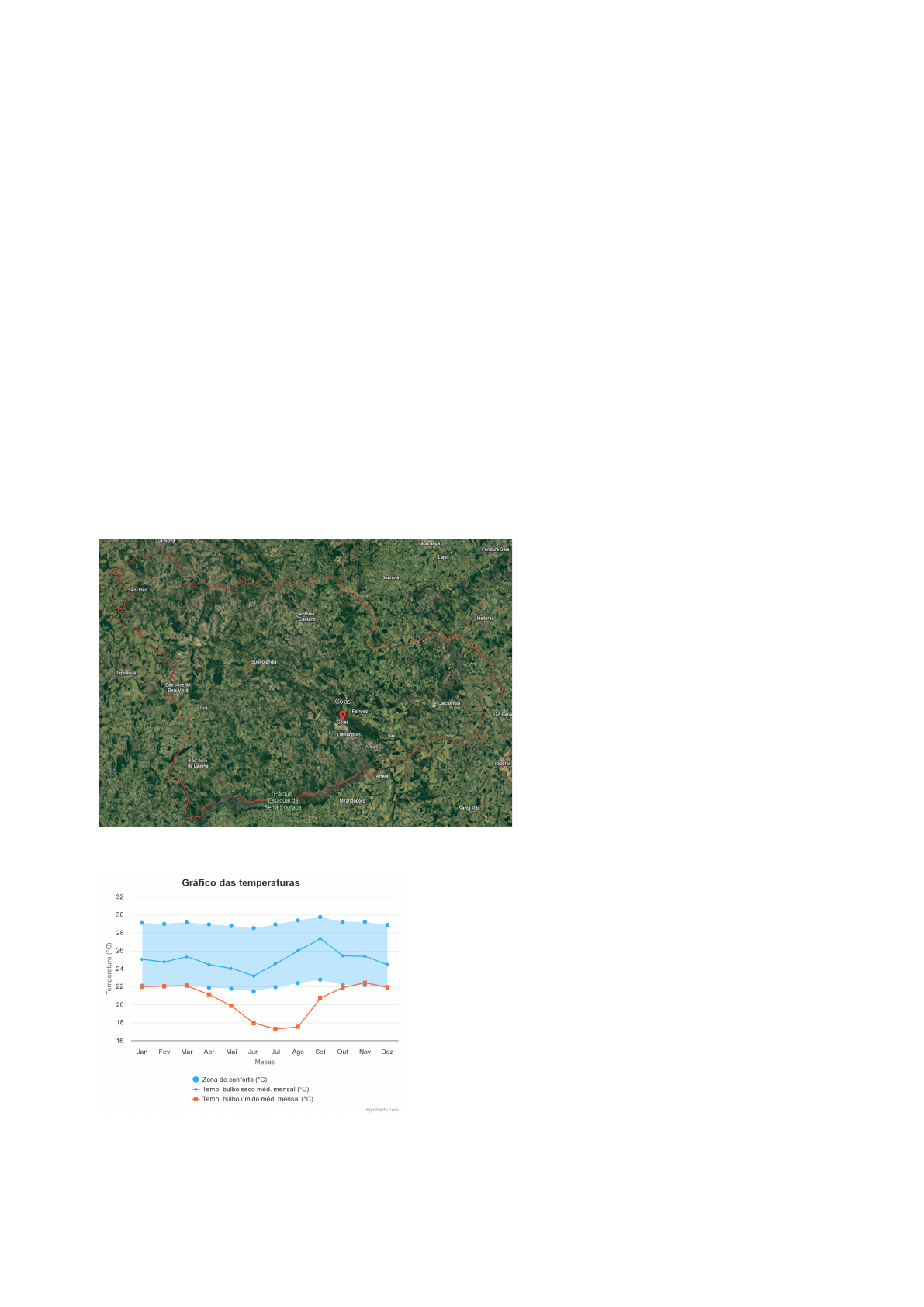 UFG - Unidade Acadêmica Especial de Ciências Sociais Aplicadas Arquitetura e Urbanismo Conforto Ambiental I Docente: Thiago Góes Discente: Amanda Peregrine Análise de sítio - Bioclimatismo A cidade de Goiás está localizada nos seguintes dados geográficos (disponivel em: <https://drajmarsh.bitbucket.io/psychro-chart2d.html> acesso em novembro de 2023): Latitude: -15.939° Longitude: -50.141° Elevação: 513.5 m Fuso horário: -03:00 O gráfico ao lado, coletado no <Dados Climáticos - ProjetEEE (mme.gov.br)> (acesso em novembro de 2023.), representa as médias mensais de temperatura durante todo o ano no na cidade de Goiás, com o parâmetro referencial de conforto térmico determinado pelo próprio ProjetEEE. O terreno analisado está localizado no Setor Bacalhau, entre a Rua Calcilândia, Avenida Goiás e a Rua Buenolândia - não pavimentada, o local possui área total de 3630m². Apesar de ser uma região predominantemente residencial, conta com a presença de instituições de segurança e saúde pública. No entorno mais próximo à região não existe uma Área de Preservação Permanente (APP), ademais, o terreno é demarcado pela presença de vegetação natural e árvores de médio e grande porte. Existem grandes declives topográficos na região entretanto, na gleba em questão, não há presença de curvas mestras, com apenas 1 metro de desnível total. O objetivo final do estudo é a elaboração do projeto de uma escola pública de ensino fundamental II e médio, ou seja, é a partir dos usos empregados a esta edificação que as estratégias de conforto bioclimático será empregadas, atendendo as necessidades dos usuários de acordo com a finalidade a que o prédio se destina. A Carta Psicrométrica abaixo foi retirada do <PD: Psychrometric Chart (drajmarsh.bitbucket.io)> acesso em novembro de 2023. A partir de dados fornecidos pelo InMET, referentes ao ano de 2016, a Carta Bioclimática de Givoni é utilizada aqui para representar as estratégias bioclimáticas que podem ser empregadas para a região atingir o estado de conforto térmico almejado. Diretrizes projetuais: De maneira geral, de acordo com a plataforma projetEEE, existem três principais estratégias recomendadas para atingir a condição de conforto térmico na cidade: ventilação natural, sombreamento e resfriamento evaporativo. Além dessas, outras soluções podem ser aplicadas desde a fundação de sistemas estruturais até acabamentos, todas elas voltadas principalmente para técnicas que auxiliem na diminuição da temperatura da edificação, visto que de acordo com o zoneamento bioclimático brasileiro a cidade de Goiás, faz parte da zona 7, contendo 57% do seu ano comprometido por desconforto térmico devido ao calor. Esses dados podem ainda se restringir em diretrizes mais específicas; por se tratar de uma escola com períodos matutino e vespertino, aplicações pensadas para o conforto noturno podem ser dispensadas, visto que a edificação estará vazia neste período. Sendo assim, no período da tarde a inércia térmica para resfriamento entra também como uma medida ideal para atingirmos o conforto térmico neste projeto. Ou seja, a partir do que foi visto e do estudo da carta solar da região, as principais estratégias projetuais devem ser: o aproveitamento da ventilação natural, com aberturas cruzadas, voltadas para a fachada noroeste, onde os ventos são predominantes (projetEEE, 2023), a utilização do efeito chaminé com aberturas superiores, para que o ar quente do ambiente possa sair livremente; sombreamento da edificação e suas aberturas, com forte presença de árvores de grande porte e marquises; técnicas de resfriamento evaporativo, com aplicação de grandes volumes d'água, que auxiliem também no aumento da umidade do ar, tratando-se de uma região predominantemente seca; e não menos importante, a utilização de materiais com alta capacidade térmica que possibilitem o atraso térmico do fluxo de calor no período vespertino.