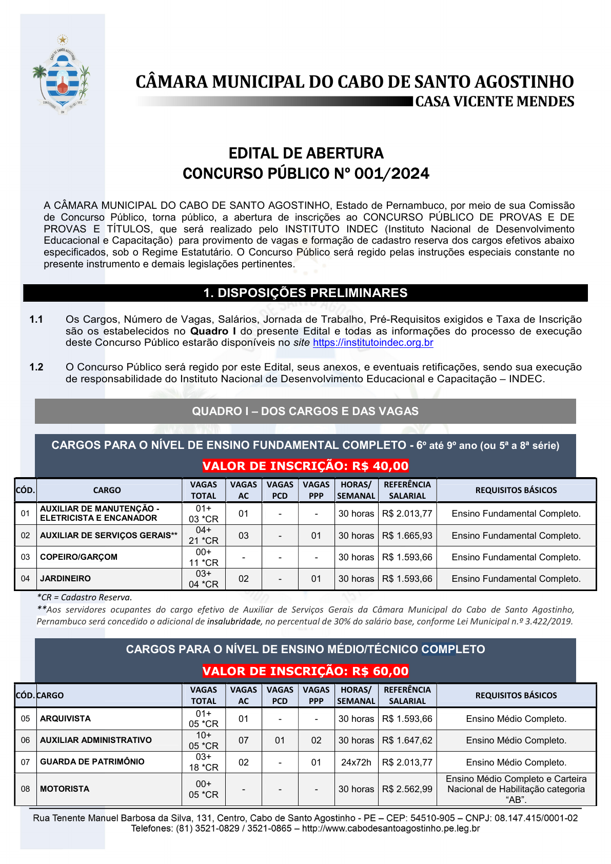 pcimarkpci MDAwMDowMDAwOjAwMDA6MDAwMDowMDAwOmZmZmY6MmRiZjo2OGFl:VGh1LCAyNSBKdWwgMjAyNCAxNzowMzowMyAtMDMwMA== www.pciconcursos.com.br EDITAL DE ABERTURA CONCURSO PÚBLICO Nº 001/2024 A CÂMARA MUNICIPAL DO CABO DE SANTO AGOSTINHO, Estado de Pernambuco, por meio de sua Comissão de Concurso Público, torna público, a abertura de inscrições ao CONCURSO PÚBLICO DE PROVAS E DE PROVAS E TÍTULOS, que será realizado pelo INSTITUTO INDEC (Instituto Nacional de Desenvolvimento Educacional e Capacitação) para provimento de vagas e formação de cadastro reserva dos cargos efetivos abaixo especificados, sob o Regime Estatutário. O Concurso Público será regido pelas instruções especiais constante no presente instrumento e demais legislações pertinentes. 1. DISPOSIÇÕES PRELIMINARES 1.1 Os Cargos, Número de Vagas, Salários, Jornada de Trabalho, Pré-Requisitos exigidos e Taxa de Inscrição são os estabelecidos no Quadro I do presente Edital e todas as informações do processo de execução deste Concurso Público estarão disponíveis no site https://institutoindec.org.br 1.2 O Concurso Público será regido por este Edital, seus anexos, e eventuais retificações, sendo sua execução de responsabilidade do Instituto Nacional de Desenvolvimento Educacional e Capacitação – INDEC. QUADRO I – DOS CARGOS E DAS VAGAS CARGOS PARA O NÍVEL DE ENSINO FUNDAMENTAL COMPLETO - 6º até 9º ano (ou 5ª a 8ª série) VALOR DE INSCRIÇÃO: R$ 40,00 CÓD. CARGO VAGAS TOTAL VAGAS AC VAGAS PCD VAGAS PPP HORAS/ SEMANAL REFERÊNCIA SALARIAL REQUISITOS BÁSICOS 01 AUXILIAR DE MANUTENÇÃO - ELETRICISTA E ENCANADOR 01+ 03 *CR 01 - - 30 horas R$ 2.013,77 Ensino Fundamental Completo. 02 AUXILIAR DE SERVIÇOS GERAIS** 04+ 21 *CR 03 - 01 30 horas R$ 1.665,93 Ensino Fundamental Completo. 03 COPEIRO/GARÇOM 00+ 11 *CR - - - 30 horas R$ 1.593,66 Ensino Fundamental Completo. 04 JARDINEIRO 03+ 04 *CR 02 - 01 30 horas R$ 1.593,66 Ensino Fundamental Completo. *CR = Cadastro Reserva. **Aos servidores ocupantes do cargo efetivo de Auxiliar de Serviços Gerais da Câmara Municipal do Cabo de Santo Agostinho, Pernambuco será concedido o adicional de insalubridade, no percentual de 30% do salário base, conforme Lei Municipal n.º 3.422/2019. CARGOS PARA O NÍVEL DE ENSINO MÉDIO/TÉCNICO COMPLETO VALOR DE INSCRIÇÃO: R$ 60,00 CÓD. CARGO VAGAS TOTAL VAGAS AC VAGAS PCD VAGAS PPP HORAS/ SEMANAL REFERÊNCIA SALARIAL REQUISITOS BÁSICOS 05 ARQUIVISTA 01+ 05 *CR 01 - - 30 horas R$ 1.593,66 Ensino Médio Completo. 06 AUXILIAR ADMINISTRATIVO 10+ 05 *CR 07 01 02 30 horas R$ 1.647,62 Ensino Médio Completo. 07 GUARDA DE PATRIMÔNIO 03+ 18 *CR 02 - 01 24x72h R$ 2.013,77 Ensino Médio Completo. 08 MOTORISTA 00+ 05 *CR - - - 30 horas R$ 2.562,99 Ensino Médio Completo e Carteira Nacional de Habilitação categoria “AB”. pcimarkpci MDAwMDowMDAwOjAwMDA6MDAwMDowMDAwOmZmZmY6MmRiZjo2OGFl:VGh1LCAyNSBKdWwgMjAyNCAxNzowMzowMyAtMDMwMA== www.pciconcursos.com.br 09 RECEPCIONISTA 04+ 06 *CR 03 - 01 30 horas R$ 1.794,11 Ensino Médio Completo. 10 SECRETÁRIO (A) 04+ 21 *CR 03 - 01 30 horas R$ 1.726,23 Ensino Médio Completo. 11 TÉCNICO DE INFORMÁTICA 01+ 10 *CR 01 - - 30 horas R$ 2.929,14 Ensino Médio Completo. 12 TÉCNICO DE SOM 02+ 02 *CR 02 - - 30 horas R$ 2.390,49 Ensino Médio Completo. 13 TÉCNICO EM MÍDIAS SOCIAIS 00+ 01 *CR - - - 30 horas R$ 2.390,49 Ensino Médio Completo. 14 TÉCNICO LEGISLATIVO 04+ 13 *CR 03 - 01 30 horas R$ 2.929,14 Ensino Médio Completo. 15 TELEFONISTA 00+ 02 *CR - - - 30 horas R$ 1.794,11 Ensino Médio Completo. *CR = Cadastro Reserva. CARGOS PARA O NÍVEL DE ENSINO SUPERIOR COMPLETO VALOR DE INSCRIÇÃO: R$ 80,00 CÓD. CARGO VAGAS TOTAL VAGAS AC VAGAS PCD VAGAS PPP HORAS/ SEMANAL REFERÊNCIA SALARIAL REQUISITOS BÁSICOS 16 ANALISTA EM CONTROLE INTERNO 02+ 03 *CR 02 - - 30 horas R$ 6.407,47 Curso Superior Completo em áreas correlatas a Administração, Ciências Contábeis, Direito, Gestão de Políticas Públicas ou Economia. 17 CONTADOR 01+ 00 *CR 01 - - 30 horas R$ 2.500,00 Curso Superior Completo em Ciências Contábeis e registro no Conselho de classe competente. 18 JORNALISTA 01+ 01 *CR 01 - - 30 horas R$ 2.766,94 Curso Superior Completo com habilitação em Comunicação Social. 19 PROCURADOR LEGISLATIVO 01+ 02 *CR 01 - - 30 horas R$ 8.369,60 Curso Superior Completo em Direito e inscrição na Ordem dos Advogados do Brasil - OAB. *CR = Cadastro Reserva. Tabela Orientadora da Ordem de Convocação das Vagas AC, PCD e PPP Esta Tabela Orientadora sugere a ordem em que poderão ser admitidos os candidatos das listagens de Ampla Concorrência (AC), Pessoa Preta ou Parda (PPP) e Pessoa com Deficiência (PCD), de acordo com a quantidade de vagas/convocações, que obedecerão a ordem classificatória em cada uma das listagens (AC, PPP e PCD). Quantidade de admissões Listagem Utilizada Quantidade de admissões Listagem Utilizada 1 AC 26 AC 2 AC 27 AC 3 PPP 28 PPP 4 AC 29 AC 5 PCD 30 AC 6 AC 31 AC 7 AC 32 AC 8 PPP 33 PPP 9 AC 34 AC 10 AC 35 AC 11 AC 36 AC 12 AC 37 AC 13 PPP 38 PPP 14 AC 39 AC 15 AC 40 AC 16 AC 41 AC pcimarkpci MDAwMDowMDAwOjAwMDA6MDAwMDowMDAwOmZmZmY6MmRiZjo2OGFl:VGh1LCAyNSBKdWwgMjAyNCAxNzowMzowMyAtMDMwMA== www.pciconcursos.com.br 17 AC 42 AC 18 PPP 43 PPP 19 AC 44 AC 20 AC 45 PCD 21 AC 46 AC 22 AC 47 AC 23 PPP 48 PPP 24 AC 49 AC 25 PCD 50 AC Legenda: AC Ampla Concorrência PCD Cota Pessoa com Deficiência PPP Cota Pessoa Preta ou Parda Subsídios para definição das regras: • Cota PCD: Decreto 3.298/99 e Lei 8.112/90 • Cota PPP: Lei 12.990/14 Esta tabela é válida para concursos que tenham cargos que disponibilizem até 4 (quatro) vagas efetivas por cargo, e que considerem o percentual de 5% para a listagem de Cotas PCD. A partir de 5 (cinco) vagas efetivas para determinado cargo, havendo um candidato PCD concorrente, o mesmo poderá ser convocado para ocupar já a segunda vaga (e não mais a quinta, como apresentado na tabela abaixo), pois considera-se que com esse núm
