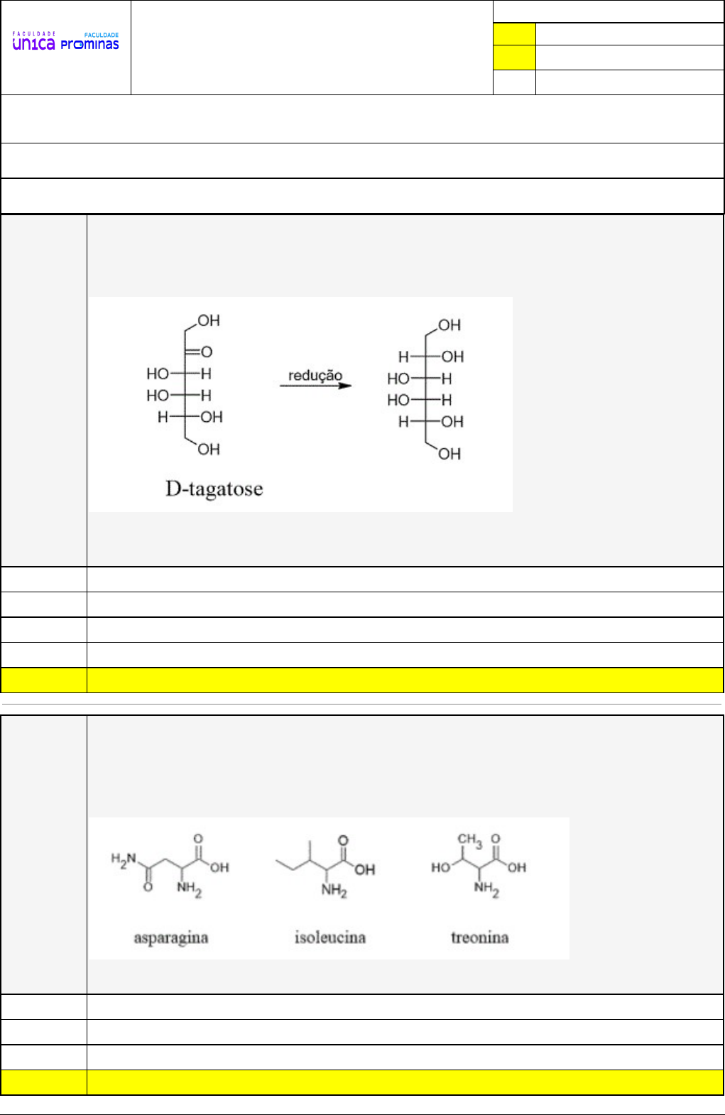 Pincel Atômico - 21/02/2024 12:33:14 1/4 LUCIANO LIMA COSTA Avaliação Online (SALA EAD) Atividade finalizada em 17/02/2024 20:40:11 (1343170 / 1) LEGENDA Resposta correta na questão # Resposta correta - Questão Anulada X Resposta selecionada pelo Aluno Disciplina: PRÁTICA PEDAGÓGICA INTERDISCIPLINAR: QUÍMICA ORGÂNICA [961441] - Avaliação com 10 questões, com o peso total de 30,00 pontos [capítulos - Todos] Turma: Segunda Graduação: Segunda Graduação 6 meses - Licenciatura em Química - Grupo: FPD-OUTUBRO/2023 - SGegu0A311023 [104644] Aluno(a): 91527229 - LUCIANO LIMA COSTA - Respondeu 8 questões corretas, obtendo um total de 24,00 pontos como nota [359963_112232] Questão 001 A D-tagatose é um carboidrato encontrado em pequenas quantidades em alimentos, como no leite submetido a fervura, e funciona como adoçante artificial. Esta substância passa por uma reação de redução não estereosseletiva, ou seja, forma múltiplos estereoisômeros. As estruturas de Fischer são mostradas a seguir: O número de estereoisômeros possíveis do reagente e do produto, respectivamente, é 3 e 4. 8 e 16. 8 e 64. 3 e 6. X 8 e 15. [359963_112226] Questão 002 Aminoácidos (aa´s) são as unidades constituintes das proteínas. É conhecido o fato de que os aa´s distinguem compostos quirais, e isso se deve em parte à sua própria quiralidade, devido à presença de um carbono assimétrico. Alguns aa´s apresentam também outros centros quirais. Abaixo temos a estrutura de três aa´s essenciais: O número de estereoisômeros possíveis para os aa´s citados é, respectivamente 4, 2, 2. 2, 2, 4. 4, 4, 2. X 2, 4, 4. Pincel Atômico - 21/02/2024 12:33:14 2/4 2, 2, 2. [359963_112242] Questão 003 Considere as seguintes reações: As reações I, II, III e IV podem ser classificadas, respectivamente, como: X SN2, E1, SN1, E2 SN2, SN1, E1, E2 SN2, E2, SN1, E1 SN1, E1, SN2, E2 SN2, E1, SN1, E1 [359963_110171] Questão 004 Dentre as condições que favorecem o mecanismo SN2, pode-se mencionar: X Uso de solvente aprótico. Grupo abandonador pequeno. Baixa concentração do nucleófilo. Elevada energia de ativação. Maior impedimento estérico. [359963_112182] Questão 005 Considere os seguintes pares de compostos: A espécie mais ácida em cada par é A, C, E. X A, C, F. B, C, F. B, D, E. A, D, E. [359964_110146] Questão 006 As bases conjugadas das espécies H2PO4-, CH3SH, -OCH2C≡CH são, respectivamente: Pincel Atômico - 21/02/2024 12:33:14 3/4 HPO4 2-, CH3SH2 +, HOCH2C≡CH PO4 3-, CH3SH, -OCH2C≡C- X HPO4 2-, CH3S -, -OCH2C≡C- H3PO4, CH3SH2 +, HOCH2C≡CH H3PO4, CH3S -, HOCH2C≡CH [359964_110158] Questão 007 Um estudante atribuiu a um composto, erroneamente, a nomenclatura 2-metil-3- etilbutano. A nomenclatura correta desta substância é 3-metil-2-etilbutano 2,3,3-trimetilbutano X 2,3-dimetilpentano isopropilbutano 3,4-dimetilpentano [359964_110164] Questão 008 O ácido tartárico foi o principal objeto de estudo de Louis Pasteur em 1842, e se apresenta em duas formas oticamente inativas. Uma forma (I) tem ponto de fusão de 206 ºC e pode ser separada em duas formas oticamente de ponto de fusão 170 ºC. A outra forma (II) tem ponto de fusão 140 ºC e não pode ser separada em mais de uma forma. As formas I e II correspondem, respectivamente, a Uma mistura de um enantiômero com um distareoisômero e uma mistura racêmica. Uma mistura racêmica e um composto meso. X Um composto meso e um diastereoisômero. Uma mistura de distereoisômeros e um enantiômero. Dois compostos meso. [359965_110132] Questão 009 Leia as afirmativas abaixo: I. Os elementos se ligam uns aos outros por meio de ligações covalentes mediante a hibridização de seus orbitais atômicos. II. Ligações duplas e triplas contém superposições laterais de seus orbitais p puros, formando ligações σ. III. Ao contrário do carbono, o enxofre pode expandir seu octeto. Escolha a alternativa correta. Apenas II. Apenas III. I e II. X I e III. Todas as alternativas estão corretas. Pincel Atômico - 21/02/2024 12:33:14 4/4 [359965_110160] Questão 010 No que diz respeito às reações de alcanos, relacione a primeira coluna com a segunda: 1. Adição sin 2. Substituição radicalar 3. Combustão completa ( ) Reação envolvendo quebras homolíticas. ( ) Reação térmica que leva à formação de dióxido de carbono e água. ( ) Mecanismo da hidrogenação catalítica. A relação correta entre as colunas está expressa na alternativa: 1, 2, 3 2, 1, 3 X 2, 3, 1 3, 1, 2 1, 3, 2