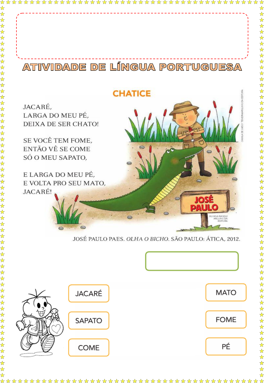 1. LEIA O POEMA ABAIXO. 2. QUAL É O TÍTULO DO POEMA? 3. LIGUE AS PALAVRAS QUE RIMAM: ESCOLA:____________________________________TURMA: ___ANO___ PROFESSORA:_________________________DATA:______/_____/_____ ESTUDANTE:___________________________________________________ 4. O POEMA FALA QUE O JACARÉ É: BONITO CHATO VERDE 5. O POEMA FALA PARA O JACARÉ COMER: A BANANA A PIPOCA O SAPATO 6. QUAL O NOME NO AUTOR DO TEXTO? ___________________________________________________________________ __ 7. LIGUE AS FIGURAS A SUA LETRA INICIAL. 8. CIRCULE O NOME DE CADA FIGURA. S P J 9. COMPLETE O QUADRO COM O QUE SE PEDE: PALAVRAS LETRA INICIAL QUANTIDADE DE LETRAS QUANTIDADE DE SÍLABAS MOLA SAPATO CHAVE FOLHA BOLO VELA JACARÉ 10. ESCREVA, NOS QUADRINHOS A PRIMEIRA LETRA DO NOME DE CADA FIGURA. 11. ESCREVA FRASES COM OS DESENHOS ABAIXO. 1. OBSERVE A TABELA ABAIXO. A) QUAL FOI A SOBREMESA MAIS VOTADA? B) QUAL A FOI A SOBREMESA MENOS VOTADA? C) AGORA COMPLETE O GRÁFICO ABAIXO COM OS DADOS DA TABELA. 2. MARQUE UM X NA RESPOSTA CERTA. QUAL DOS PRODUTOS ABAIXO É VENDIDO POR PESO? 3. MARQUE COM UM X O COMPRIMENTO DO DESENHO DA ESCOVA DE DENTES. 3 cm 4 cm 7 cm 4. MARQUE UM X NA RESPOSTA CERTA. QUAL DOS PRODUTOS ABAIXO É VENDIDO POR METRO? 5. ESCREVA A HORA QUE OS RELÓGIOS ESTÃO MARCANDO. Matemática Matemática