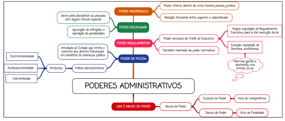 Poder interno dentro de uma mesma pessoa jurídica PODER HIERÁRQUICO Serve para disciplinar as pessoas com algum vinculo especial Relação funcional entre superior e subordinado PODER DISCIPLINAR Apuração de infrações e Regra expedição de Regulamento aplicação de penalidades Executiva para a fiel execução do lei Poder exclusivo do Chefe do Executivo PODER REGULAMENTAR expedição de Atividade do Estado que limita exercício dos direitos individuals chamado de poder normativo Decretos Discricionariedade em benefício do interesse público PODER DE Normas gerais e nos Autoexecutoriedade Atributos administrativa limites da lei Coercibilidade PODERES ADMINISTRATIVOS Excesso de Poder de Competência uso E ABUSO DE PODER Abuso de Poder Desvio de Poder de Finalidade