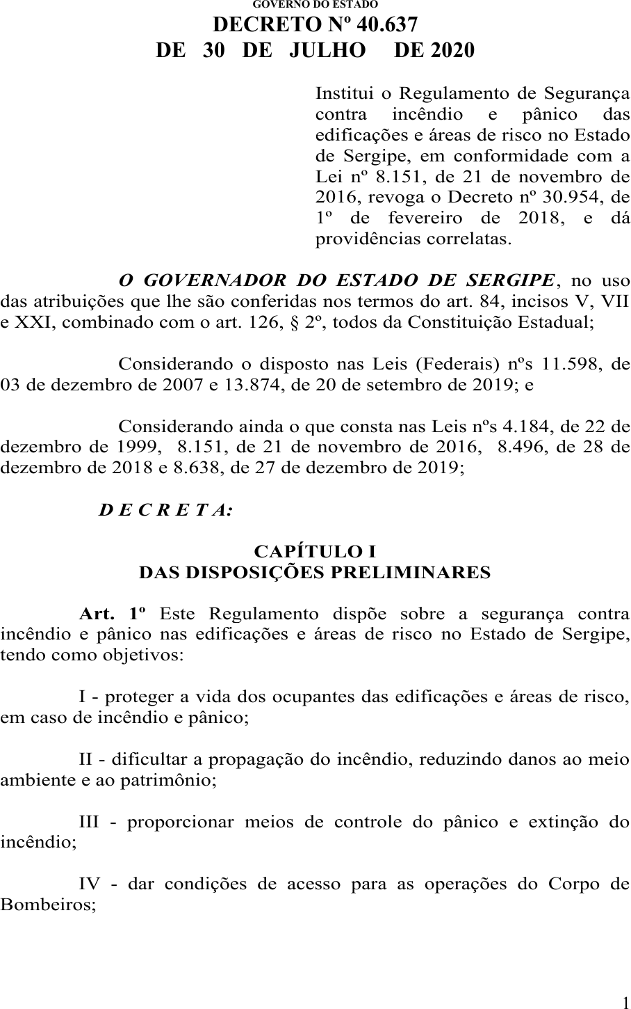 1 GOVERNO DO ESTADO DECRETO Nº 40.637 DE 30 DE JULHO DE 2020 Institui o Regulamento de Segurança contra incêndio e pânico das edificações e áreas de risco no Estado de Sergipe, em conformidade com a Lei nº 8.151, de 21 de novembro de 2016, revoga o Decreto nº 30.954, de 1º de fevereiro de 2018, e dá providências correlatas. O GOVERNADOR DO ESTADO DE SERGIPE, no uso das atribuições que lhe são conferidas nos termos do art. 84, incisos V, VII e XXI, combinado com o art. 126, § 2º, todos da Constituição Estadual; Considerando o disposto nas Leis (Federais) nºs 11.598, de 03 de dezembro de 2007 e 13.874, de 20 de setembro de 2019; e Considerando ainda o que consta nas Leis nºs 4.184, de 22 de dezembro de 1999, 8.151, de 21 de novembro de 2016, 8.496, de 28 de dezembro de 2018 e 8.638, de 27 de dezembro de 2019; D E C R E T A: CAPÍTULO I DAS DISPOSIÇÕES PRELIMINARES Art. 1º Este Regulamento dispõe sobre a segurança contra incêndio e pânico nas edificações e áreas de risco no Estado de Sergipe, tendo como objetivos: I - proteger a vida dos ocupantes das edificações e áreas de risco, em caso de incêndio e pânico; II - dificultar a propagação do incêndio, reduzindo danos ao meio ambiente e ao patrimônio; III - proporcionar meios de controle do pânico e extinção do incêndio; IV - dar condições de acesso para as operações do Corpo de Bombeiros; BGO Nº 120 Publicado em 03/08/2020 2 V - proporcionar a continuidade dos serviços nas edificações e áreas de risco. CAPÍTULO II DAS DEFINIÇÕES Art. 2º Para efeito deste Regulamento são adotadas as definições abaixo descritas: I - altura da edificação: a) para fins de exigências das medidas de segurança contra incêndio e pânico, é a medida em metros do piso mais baixo ocupado ao piso do último pavimento, observando as exceções descritas no art. 21 dessa norma; b) para fins de saída de emergência, é a medida em metros entre o ponto que caracteriza a saída do nível de descarga ao piso do último pavimento, podendo ser ascendente ou descendente; c) para fins de definição da necessidade de implantação de Sistema de Proteção Contra Descargas Atmosféricas - SPDA, é a medida em metros do ponto mais alto da edificação até o solo. II - ampliação: é o aumento da área construída da edificação; III - análise: é o ato de verificação das condições de segurança das edificações e áreas de risco no projeto de segurança contra incêndio e pânico ou projeto de construção; IV - análise prévia: é a análise preliminar de elementos de proteção passiva da edificação peculiares ao projeto arquitetônico; V - andar: é o volume compreendido entre dois pavimentos consecutivos, ou entre o pavimento e o nível superior à sua cobertura; VI - área da edificação: é o somatório da área a construir e da área construída de uma edificação; VII - área construída: somatório de todas as áreas de uma edificação que sejam cobertas e destinadas a abrigar atividade humana ou qualquer instalação, equipamento ou material, como também, pátios descobertos destinados à produção ou armazenamento industrial; BGO Nº 120 Publicado em 03/08/2020 3 VIII - áreas de risco: é o ambiente externo à edificação que contém risco específico de ocorrência de incêndio ou emergência, tais como: armazenamento de produtos inflamáveis ou combustíveis, bacia de contenção em parque de tanques, subestações elétricas, explosivos, produtos perigosos, aglomeração de pessoas em local provido de controle de acesso, áreas de diversão e entretenimento, depósitos a céu aberto e similares; IX - Atestado de Regularidade do Corpo de Bombeiros - ARCB: é o documento emitido pelo Corpo de Bombeiros Militar do Estado de Sergipe – CBMSE, certificando que, durante a vistoria, a edificação possuía as condições de segurança contra incêndio, previstas pela legislação e constantes no processo, estabelecendo um período de revalidação; X - Atestado de Regularidade de Barraca de Fogos - ARBF: é o documento hábil para a regularização do ponto de vendas de fogos de artifícios de regime temporário; XI - Atestado Provisório com Restrições - APRCB: é o documento excepcional e provisório com a finalidade de garantir a continuidade do uso da edificação ou área de risco que já possua preventivos elementares, e não ofereçam riscos iminentes à vida, ao patrimônio ou ao meio ambiente; XII - ático: é a parte do volume superior de uma edificação, destinada a abrigar máquinas, piso técnico de elevadores, caixas de água e circulação vertical; XIII - atividade econômica: o ramo de atividade identificado a partir da Classificação Nacional de Atividades Econômicas – CNAE, e da lista de estabelecimentos auxiliares a ela associados, se houver, editada pela Comissão Nacional de Classificação – CONCLA; XIV - atividade econômica de risco alto ou nível de risco III: aquela cujo exercício apresente alto nível de risco à integridade física das pessoas, ao meio ambiente ou ao patrimônio que implique em licenciamento por meio de procedimentos específicos e pré-definidos pelos Corpos de Bombeiros Militares, conforme regramento próprio das unidades federativas; BGO Nº 120 Publicado em 03/08/2020 4 XV - atividade econômica de risco leve ou nível de risco I: aquela que não oferece riscos de incêndio ou apresenta risco muito baixo, na qual é dispensada a solicitação de qualquer ato público de liberação ou licenciamento para o seu funcionamento; XVI - atividade econômica de risco médio ou nível de risco II: aquela que possibilita o ato público de liberação, ou licenciamento, por meio de fornecimento de informações e declarações do interessado, a fim de permitir o reconhecimento formal do atendimento aos requisitos de prevenção contra incêndio e pânico por parte do Corpo de Bombeiros Militar; XVII - Auto de Conformidade de Evento Temporá