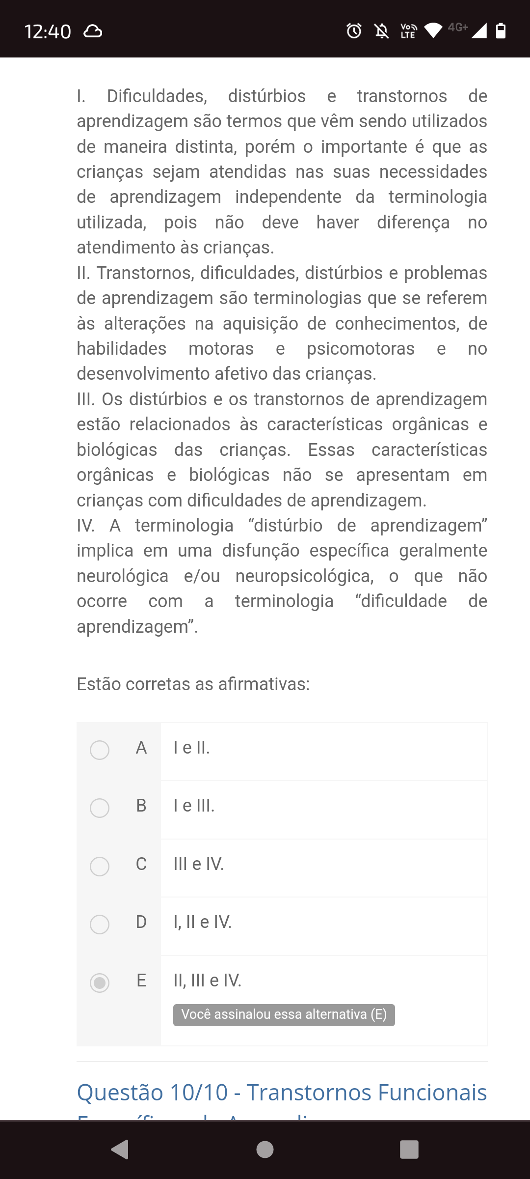4G+ 12:40 LTE I. Dificuldades, distúrbios e transtornos de aprendizagem são termos que vêm sendo utilizados de maneira distinta, porém o importante é que as crianças sejam atendidas nas suas necessidades de aprendizagem independente da terminologia utilizada, pois não deve haver diferença no atendimento às crianças. II. Transtornos, dificuldades, distúrbios e problemas de aprendizagem são terminologias que se referem às alterações na aquisição de conhecimentos, de habilidades motoras e psicomotoras e no desenvolvimento afetivo das crianças. III. Os distúrbios e os transtornos de aprendizagem estão relacionados às características orgânicas e biológicas das crianças. Essas características orgânicas e biológicas não se apresentam em crianças com dificuldades de aprendizagem. IV. A terminologia "distúrbio de aprendizagem" implica em uma disfunção específica geralmente neurológica e/ou neuropsicológica, o que não ocorre com a terminologia "dificuldade de aprendizagem". Estão corretas as afirmativas: A e II. B e III. C III e IV. D I, e IV. E II, III e IV. Você assinalou essa alternativa (E) Questão 10/10 Transtornos Funcionais
