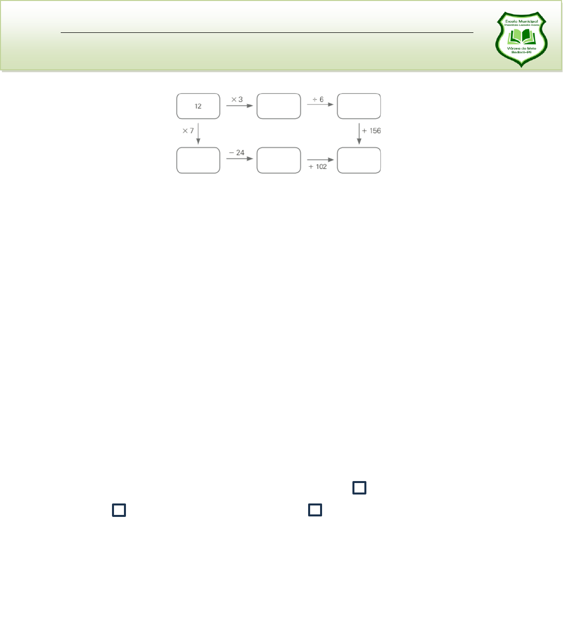 ESCOLA MUNICIPAL THEODÓZIO LEANDRO HORAS Aluno (a) Professor: José Roberto da Silva 6º Ano _____ Data: / /2024 1. (1 ponto) Complete o esquema com os números que estão faltando. 2. (1 ponto) Escreva os números a seguir utilizandopotências de base 10. a) 3 000 000 000 = b) 1 200 000 000 000 000 = c) 225 000 000 = d) 5 000 000 000 000 000 000 = e) 1 000 000 000 000 = 3. (1 ponto) Escreva como se lê as potências abaixo: a) 21 = b) 122 = c) 163 = d) 114 = e) 357 = f) 2410 = 4. (1 ponto) O número 48 pode ser representado em fatores primos por: (Faça os cálculos) A) 2² ⋅3 B) 2⋅33 C) 23⋅3 D) 24 ⋅3 E) 2⋅32 5. (1,5 ponto) Que número deve ser colocado no lugar do para que cada lado da igualdade tenha o mesmo valor? (Faça os cálculos) a) 5 + 7 = – 15 b) 90 + = 77 + 19 6. (1 ponto) É divisível por 2, 3 e 5 simultaneamente o número: (explique sua resposta) a) 235 b) 520 c) 230 d) 510 e) 532 7. (1,5 ponto) Quais os 5 primeiros multiplos de 2 e 3 simultaneamente? (explique sua resposta) 8. (2 ponto) Um número é divisível por 6 se ele é divisível por 2 e por 3. Quais números abaixo são divisíveis por 6? (explique sua resposta) a) 756 = b) 1 157 = c) 13 420 =