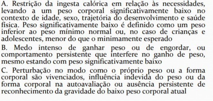 Transtornos alimentares Anorexia nervosa Início: dieta motivada pela insatisfação com peso ou imagem corporal Evolui com mudanças no comportamento alimentar: · Restrição alimentar (tipo ou quantidade) · Uso de métodos purgativos (laxantes, diuréticos, vômitos autoinduzidos, exercício físico excessivo) Outros elementos clínicos: · Distorção significativa da imagem corporal · Medo intenso de ganhar peso · Controle sobre o corpo (pesagem e checagem frequente) · Preocupações com o corpo e com o peso são centrais na vida do paciente Exemplos de comportamentos observados: · Esconder alimentos no armário, no banheiro ou em roupas. · Dividir as refeições em pequenas porções. · Preparar alimentos para os outros. · Mastigar lentamente pequenas quantidades de comida. · Ruminação do alimento (mastigação seguida de descarte do alimento ou deglutição seguida de regurgitação). · Evitar comer na presença de outras pessoas · Interessar-se por tudo o que está relacionado à culinária e a dietas. · Ter um grande conhecimento sobre as calorias dos alimentos e sobre nutrição. · Acreditar que alimentos consumidos se transformam imediatamente em gordura corporal. · Evitar grupos alimentares específicos, muitas vezes com justificativas ideológicas (vegetarianismo, macrobiótica, etc.). · Crenças rígidas e perfeccionismo em relação a modelos estéticos e “saudáveis”. DSM 5 Principais complicações clínicas: Pele e anexos: pele seca, unhas quebradiças, queda de cabelo, crescimento de lanugo, perdas dentárias Trato gastrintestinal: constipação intestinal, dor abdominal Cardiovascular: bradicardia, diminuição da pressão arterial, alterações no intervalo QT, insuficiência cardíaca, arritmias (principal causa de óbito) Hematológico: anemia, leucopenia, trombocitopenia Renal: edema, insuficiência renal aguda, cálculo renal Eletrólitos: hipopotassemia, hiponatremia, hipoglicemia, desidratação Reprodutivo: amenorreia, infertilidade, atraso do desenvolvimento sexual Osteomuscular: osteopenia, osteoporose Evolução: Quanto mais rápido, maior chance de remissão 60% apresenta remissão completa 20 –30% apresenta quadro recorrente 10 –20% apresenta quadro crônico e refratário Comorbidades são frequentes: Tr. Depressivo Maior, Tr. Ansiosos ,TOC e TP Cluster C Tratamento: Multidisciplinar ⇒Nutricionista, psicólogo e psiquiatra Acompanhamento nutricional ⇒Renutrição e estabelecer padrões alimentares saudáveis Psicoterapia ⇒Abordagem sistemática das crenças distorcidas sobre peso/corpo Tratamento farmacológico apenas para comorbidades Bulimia nervosa Prevalência 1 a 4% (90% mulheres) Pico de incidência: Adolescentes e adultos jovens (20 anos) Profissionais que trabalham com o corpo e de saúde tem maior risco Início semelhante à AN: dieta restritiva devido à insatisfação com o peso corporal (menor intensidade). Compulsão alimentar: ingestão de grande quantidade de alimentos em curto espaço de tempo. Pode chegar a um comer desordenado, com alimentos frios e crus. Purgação: utilização de métodos compensatórios com o objetivo de tentar impedir o ganho de peso (vômitos provocados, uso de laxantes, diuréticos, inibidores do apetite, atividade física intensa) Gatilhos diversos (frustrações, tristeza, relacionamentos) podem levar a compulsão alimentar ou purgação Ciclo bulímico: Complicações clínicas: menos intensas que na anorexia Geral: desidratação, hipotensão, desmaios Pele e anexos: retração gengival, erosão do esmalte dentário, hipertrofia das parótidas Trato gastrintestinal: esofagite, esôfago de Barrett, doença do refluxo gastresofágico, ruptura de esôfago, hérnia de hiato Eletrólitos: hipopotassemia, alterações hidreletrolíticas Cardiovascular: arritmias (principal causa de óbito) Reprodutivo: irregularidade menstrual, risco de aborto espontâneo DSM: Prova: compulsão: comer demais, quantidade maior que a normal, e sem controle Evolução: 60% tem remissão completa 30% tem remissão parcial 10% tem quadro crônico e refratário Comorbidades são frequentes: Depressão, uso de substâncias, TP Cluster B Tratamento: Multidisciplinar ⇒Nutricionista, psicólogo e psiquiatra Acompanhamento nutricional ⇒Estabelecer padrões alimentares saudáveis Psicoterapia ⇒Abordagem sistemática das crenças distorcidas sobre peso/corpo Tratamento farmacológico: inibidores seletivos da recaptação de serotonina (Ex. Fluoxetina); Topiramato (25 a 600 mg/dia) Transtorno de compulsão alimentar (TCA) Prevalência 1,5 e 4,5% na população (mais comum na pop. geral) Afeta mais mulheres, mais equilibrado (6 F / 4 M) Início: Adolescência, com dietas restritivas ou compulsões; Flutuação do peso Episódios de compulsão alimentar sem método compensatório Episódios podem acontecer tanto após gatilhos (frustrações) quanto em celebrações Comorbidades: Tr. Depressivos, Tr. Ansiosos, uso de substâncias e TP Cluster B Existe associação frequente entre TCA e obesidade. Quanto maior o IMC maior o risco de o paciente ter TCA (Obesidade grau 3 chega a 40%) DSM: Tratamento: Multidisciplinar ⇒Nutricionista, psicólogo e psiquiatra Modificações no estilo de vida: atividades físicas regulares, regularização o sono, ampliação do espectro de atividades de lazer Acompanhamento nutricional ⇒Estabelecer padrões alimentares saudáveis Tratamento farmacológico: ISRS ou Topiramato. Sibutramina ou Lisdexanfetamina em casos selecionados Pica Pica do latim pega – um pássaro do hemisfério norte conhecido por comer quase tudo o que encontra pela frente Pode ser observada especialmente em mulheres grávidas e em meninos e meninas. Principalmente em crianças sofrendo dificuldades no desenvolvimento infantil normal O consumo de terra faz parte de costumes e tradições para satisfazer certas deficiências físicas, como nos casos de anemia grave (o que não se trata de Transtorno de Pica) 