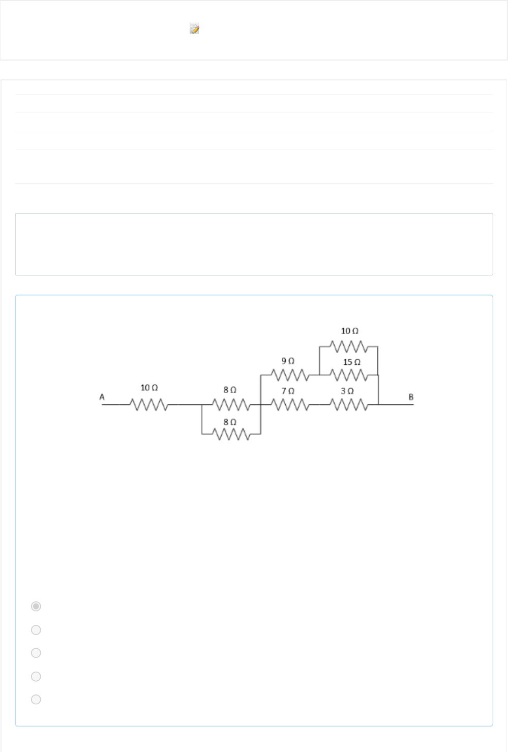Painel / Meus cursos / FEENGP / 📝 AVALIAÇÕES 2024/3 / ATIVIDADE ONLINE 1 - AV12024/3 Iniciado em segunda, 29 jul 2024, 16:59 Estado Finalizada Concluída em segunda, 29 jul 2024, 17:20 Tempo empregado 20 minutos 45 segundos Avaliar 1,80 de um máximo de 2,00(90%) Questão 1 Correto Atingiu 0,20 de 0,20 Um sistema elétrico com diversos resistores foi montado conforme a figura a seguir. Sabe-se que, para que o aparelho eletrônico funcione adequadamente, uma corrente elétrica igual a 4 A deve percorrer o sistema. Com base nisso, qual deve ser a diferença de potencial entre os pontos A e B para que o funcionamento aconteça adequadamente? Escolha uma opção: a. 80 V. b. 110 V. c. 90 V. d. 100 V. e. 220 V. https://moodle.ead.unifcv.edu.br/my/ https://moodle.ead.unifcv.edu.br/course/view.php?id=1551 https://moodle.ead.unifcv.edu.br/course/view.php?id=1551#section-4 https://moodle.ead.unifcv.edu.br/mod/quiz/view.php?id=204058 Questão 2 Incorreto Atingiu 0,00 de 0,20 Considere uma partícula U que possua metade da massa de um elétron e que tenha carga positiva. Quando essa partícula for posicionada em um campo elétrico uniforme, a uma distância D da carga da qual o campo se origina, ela sofrerá a ação do mesmo e irá adquirir uma aceleração de módulo igual a X. Considere que, agora, ao invés de ser usada uma partícula O positiva, será usada uma partícula de carga negativa, a qual tem metade da massa de U, e a mesma será posicionada à metade da distância D da carga da qual o campo elétrico se origina. Determine a aceleração sofrida pela partícula O em função da aceleração X e assinale a alternativa que a indica. Escolha uma opção: a. 8.X. b. -8.X. c. -4.X. d. 4.X. e. -2.X. Questão 3 Correto Atingiu 0,20 de 0,20 Classificada como grandeza física, a corrente elétrica é o meio pelo qual a quantidade de carga presente em um condutor pode ser calculada. Assim, o Sistema Internacional de Unidades define que a medida para carga elétrica é dada em “amperes x segundos”, ou seja, A.s. Esse tipo de unidade é denominada de coulomb (C). A corrente elétrica pode, dessa forma, ser classificada de duas maneiras: corrente contínua ou alternada. Disponível em: https://conhecimentocientifico.r7.com/corrente-eletrica/. Acesso em 24 nov. 2020. A respeito da corrente elétrica e de suas classificações, são feitas as seguintes afirmações: I – A corrente elétrica existe por conta da diferença de potencial em duas extremidades de um fio condutor, a qual irá gerar um campo elétrico e, consequentemente, movimento dos elétrons. II – A principal diferença entre a corrente contínua e a corrente alternada se dá pelo sentido do caminho que os elétrons seguem. Enquanto na contínua não há mudança de sentido, na alternada há uma mudança frequente. III – Pilhas se utilizam comumente da corrente alternada, pois ela é mais eficiente quando a distância a ser percorrida é pequena. IV – Na corrente alternada ocorre um maior controle da tensão do circuito. É correto o que se afirma em: Escolha uma opção: a. III e IV, apenas. b. I, II e IV, apenas. c. II e III, apenas. d. I, II, III e IV. e. I, apenas. Questão 4 Correto Atingiu 0,20 de 0,20 Uma carga elétrica igual a é posicionada em um ponto qualquer no vácuo, ficando sujeita a uma força elétrica de intensidade igual a 4,2 N. Com base nas informações expostas, determina qual será a intensidade do campo elétrico no ponto em questão e assinale a alternativa que a indica corretamente. Escolha uma opção: a. b. c. d. e. Questão 5 Correto Atingiu 0,20 de 0,20 Na figura a seguir está representado um circuito misto com d.d.p. igual a 220 V. Cada resistor tem seu valor apresentado. Calcule a resistência equivalente do sistema em questão e o valor da corrente que passa por ele. Assinale a alternativa em que elas estão respectivamente representadas. Escolha uma opção: a. 107,3 Ω e 9,04 A. b. 86,6 Ω e 8,07 A. c. 86,6 Ω e 9,04 A. d. 86,6 Ω e 2,54 A. e. 107,3 Ω e 2,05 A. Questão 6 Correto Atingiu 0,20 de 0,20 Ao provocar o atrito entre determinados materiais — como esfregar os pés sobre um tapete, por exemplo —, fazemos com que ocorra uma transferência de cargas, que vão ficando acumuladas sobre a superfície até que sejam liberadas. É por isso que, em certos momentos, acontecem pequenos choques quando você toca alguma outra pessoa. Na verdade, você — ou ele — está descarregando essa carga extra que foi acumulada. Disponível em: https://www.megacurioso.com.br/fisica-e-quimica/36967-por-que-as-vezes- levamos-choques-quando-tocamos-outra-pessoa-.htm. Acesso em 23 nov. 2020. Com base na situação exposta e nos conteúdos tratados durante a aula, analise as afirmações a seguir. I – Quando se esfrega dois corpos, ocorre a transferência de prótons entre ambos, fazendo com que um deles fique positivamente carregado. II – Dois corpos de mesma carga podem trocar cargas entre si. III – Dois corpos carregados positivamente irão se repelir. IV – Caso criemos atrito entre um corpo feito de vidro e um corpo feito de cobre, o corpo de vidro irá ceder cargas ao corpo de cobre. É correto o que se afirma em: Escolha uma opção: a. I e II, apenas. b. I, II, III e IV. c. I, III e IV, apenas. d. II, III e IV, apenas. e. II e III, apenas. Questão 7 Correto Atingiu 0,20 de 0,20 Uma partícula A, com carga C, está posicionada no vácuo e gera um campo elétrico ao seu redor. Considerando que esta partícula não está sendo diretamente influenciada por nenhuma outra e que ela permanece estática, analise as afirmativas a seguir. I – O campo elétrico em uma partícula que esteja a 3 cm de distância de A será 9 vezes menos intenso do que aquele em uma partícula que esteja a 1 cm de distância de A. II – O campo elétrico gerado por A em uma partícula de 4 C será 4 vezes mais intenso do que seria em uma partícula de 2 C que esteja separada pela mesma distância. III – 