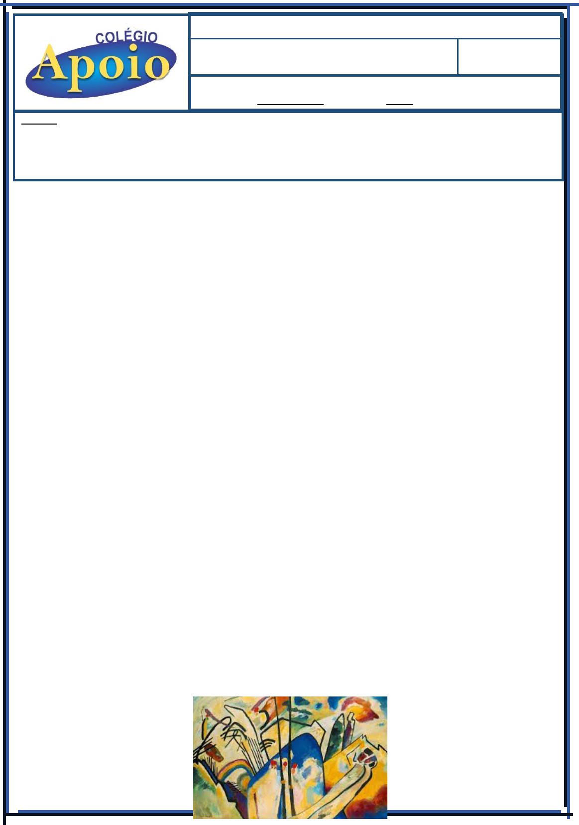 Nome Completo:____________________________________ Turma: 2ª SÉRIE Atenção: - A prova DEVE ser desenvolvida com caneta azul ou preta. - Questões com respostas em GRAFITE ou RASURADAS serão desconsideradas. - Leia atentamente as questões e quando necessário posicione as respostas nos respectivos espaços. - Questões que necessitam de cálculos, DEVEM ter os respectivos cálculos nos espaços adequados. Professor: CARLOS GOMES Disciplina: ARTES IV Bimestre, Ensino Médio. AVALIAÇÃO CONTÍNUA II – AC2 A arte abstrata combina linhas e formas de um mundo irreal. À primeira vista, o desenho abstrato pode parecer estranho aos olhos da observação, mas ali estão os resultados das ideias e das emoções do artista sobre determinado tema. E devem ser respeitados. Kandisky, um dos maiores pintores do abstracionismo, dizia que um quadro abstrato é a representação de um estado de espírito e não a representação de objetos. Wassily Kandinsky. Composição nº 4,1911. Óleo sobre tela,159,5cm x 250,5 cm 01. Sobre o abstracionismo julgue os itens abaixo em (C) para os certos e (E) para os errados: a) ( ) A pintura abstrata não se preocupou em relacionar suas formas e cores comas formas e cores de um ser. b) ( ) A pintura abstrata representa exatamente a realidade c ) ( ) As telas abstratas não narram necessariamente uma cena religiosa ou mitológica 02. A _________________ não representa objetos ou paisagens próprias da nossa realidade. a) pintura abstrata b) pintura rupestre c) pintura clássica 03. A criação de Kandinsky tem trabalhos voltados para o abstrato. Chamou o principal aspecto de sua arte de beleza interior, fervor de espírito e uma necessidade funda de desejo espiritual. Qual característica abaixo representa uma pintura abstrata? a) Perspectiva rigorosa e científica b) Utilização de materiais secos e planos. c) Representação de objetos inanimados. d) Não simula objetos próprios da realidade. 04. Das alternativas abaixo marque uma alternativa que não está no contexto da arte abstrata. a) Ausência de objetos reconhecíveis; b) Arte com pinturas clássicas c) Oposição ao modelo renascentista e à arte figurativa; 05. Das imagens abaixo qual não está no contexto de uma pintura abstrata: 06. A principal característica do contexto abstrato é: a) Algo mais clássico com cores suaves b) Pinturas sem formas definidas e cores fortes c) Pinturas com cores suaves clássicas 07. Complete: ______________________Um estilo artístico moderno das artes visuais que prioriza as formas abstratas em detrimento das figuras que representam algo da nossa própria realidade. a) pintura abstrata b) pintura rupestre c) pintura clássica image1.jpeg image2.png image3.png