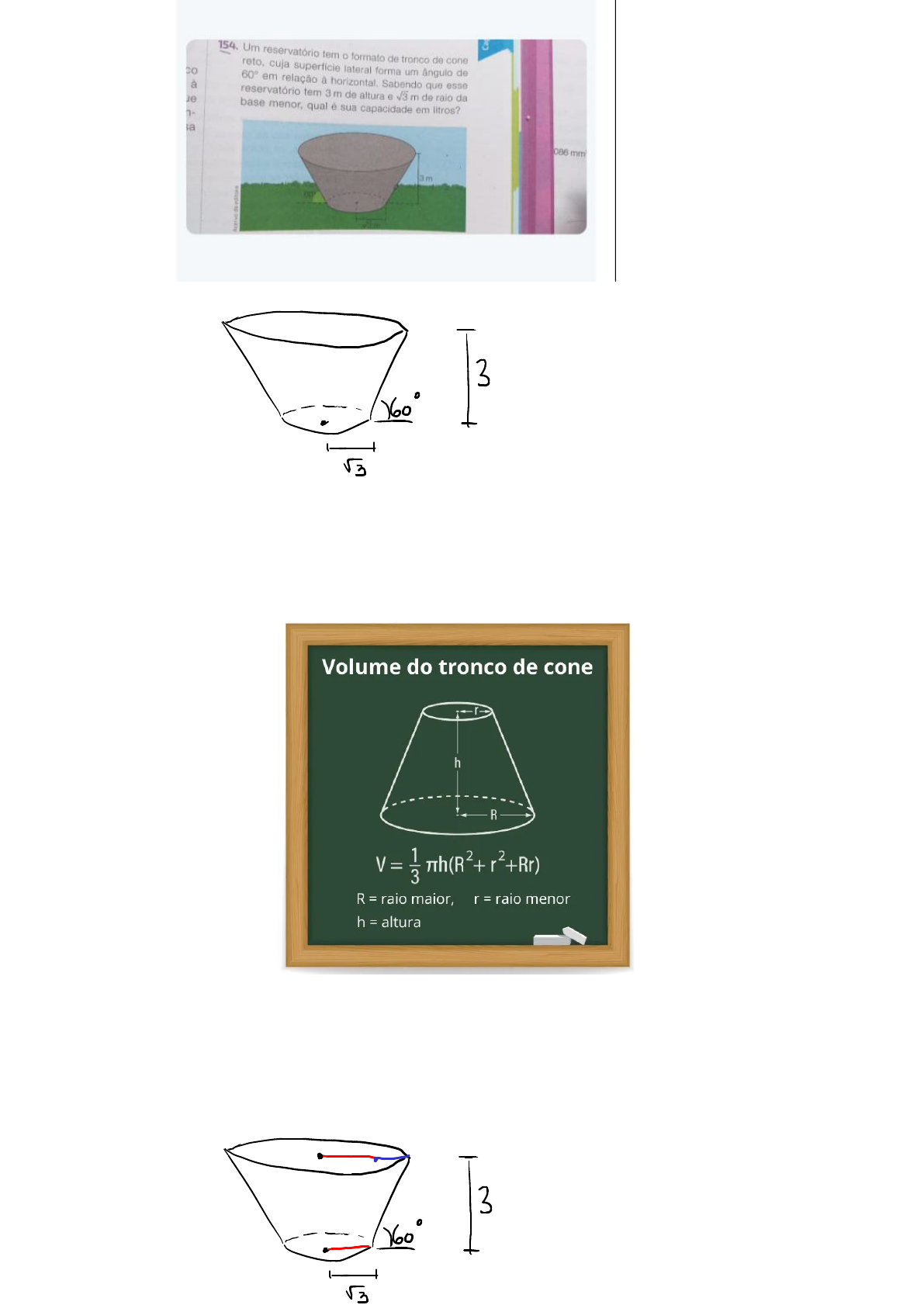 Perceba que só falta o raio maior (R) para eu conseguir aplicar a fórmula. Vamos achá-lo: Primeira coisa: O raio maior vai ser o menor (azul) somado a uma pequena parte (azul): Basicamente, aqui queremos o volume de um tronco de cone, vamos usar a fórmula para isso: Ou seja, basta eu achar essa parte azul, vamos focar nela: Coloquei um segmento rosa que é literalmente a altura (do chão até o topo), o que tenho é: Agora vou usar trigonometria do triângulo retângulo!