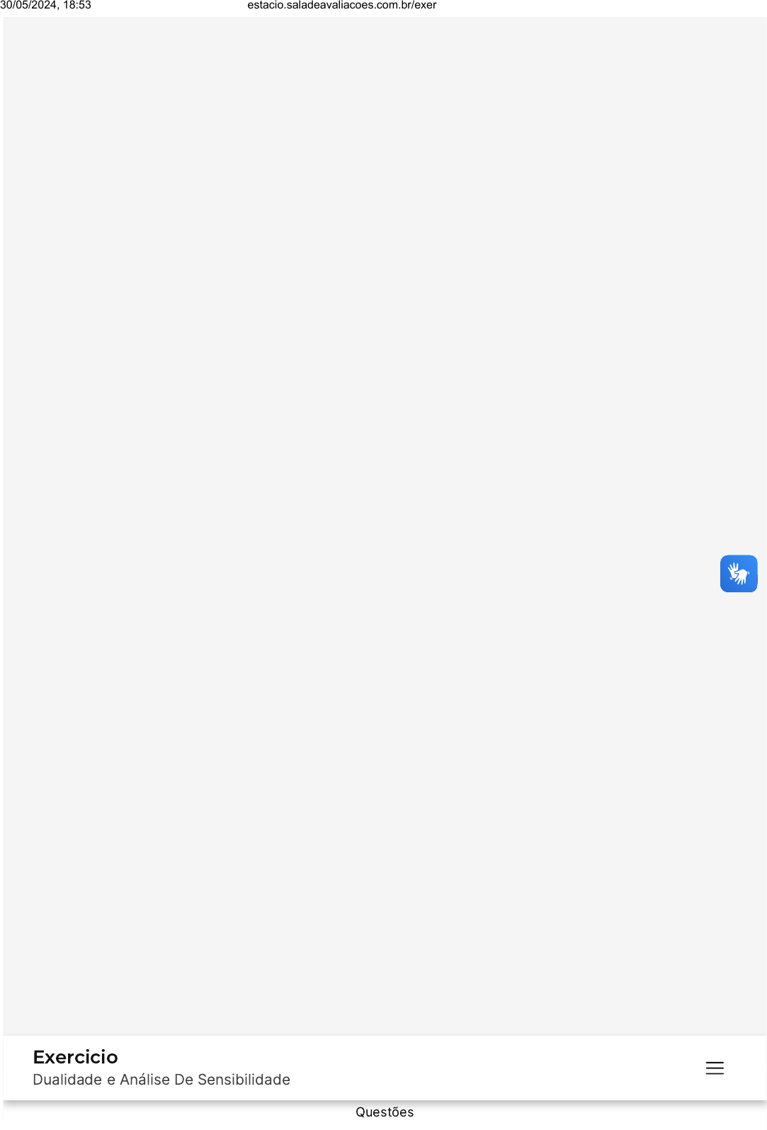 Questões Exercicio Dualidade e Análise De Sensibilidade 30/05/2024, 18:53 estacio.saladeavaliacoes.com.br/exercicio/662c57c1139d33d9149e3e46/gabarito/ https://estacio.saladeavaliacoes.com.br/exercicio/662c57c1139d33d9149e3e46/gabarito/ 1/15 Você acertou 2 de 10 questões Verifique o seu desempenho e continue treinando! Você pode refazer o exercício quantas vezes quiser. Verificar Desempenho 1 Marcar para revisão A aplicação de Métodos Quantitativos é uma ferrramenta que visa a solução de problemas, como o custo minimo, no estudo de caso de nutrição a seguir. O custo mínimo para resolver este problema de nutrição não se resume apenas a um número; ele representa uma abordagem holística que equilibra saúde, nutrição e economia doméstica. Considere o seguinte estudo de caso. Uma mãe deseja que seus filhos tenham uma alimentação equilibrada e, por isso, consultou uma nutricionista, que lhe recomendou que eles consumam por dia, no mínimo, 10 mg de vitamina A, 70 mg de vitamina C e 250 de vitamina D. Mas essa mãe também está preocupada com os custos. Ela deseja oferecer aos filhos a dieta equilibrada, porém ao menor custo possível. Para ajudar nos cálculos, ela fez uma pesquisa sobre informações nutricionais para diferentes tipos de alimento, conforme apresentado a seguir. Tabela de informações nutricionais em mg Vitamina Leite �L� Carne (kg) Peixe (kg) Salada �100 g) A 2 2 10 20 C 50 20 10 30 D 80 70 10 80 A mãe também foi ao supermercado e verificou que um litro de leite custa 20,00, um quilo de peixe custa 3,00. O modelo matemático para o planejamento da alimentação das crianças, buscando minimizar o custo, é dado por: Min Z � 2x � 20x � 25x � 3x s. a.: 2x � 2x � 10x � 20x ≥ 10 50x � 20x � 10x � 30x ≥ 70 80x � 70x � 10x � 80x ≥ 250 x , x , x , x ≥ 0 Sendo: x = litros de leite a serem consumidos por dia pelas crianças x = quilos de carne a serem consumidos por dia pelas crianças x = quilos de peixe a serem consumidos por dia pelas crianças x � 100 g de salada a serem consumidos por dia pelas crianças í i i é $ i í i 2, 00,umquilodecarnecusta 25, 00, equeparapreparar100gdesaladaelagastaria 1 2 3 4 1 2 3 4 1 2 3 4 1 2 3 4 1 2 3 4 1 2 3 4 30/05/2024, 18:53 estacio.saladeavaliacoes.com.br/exercicio/662c57c1139d33d9149e3e46/gabarito/ https://estacio.saladeavaliacoes.com.br/exercicio/662c57c1139d33d9149e3e46/gabarito/ 2/15 A B C D E O custo mínimo que a mãe vai ter é de $ 6,46. Caso recomendação de ingestão mínima de vitamina C passasse para 100 mg por dia, o custo mínimo: Não sofreria alteração. Aumentaria em $ 0,20. Aumentaria em $ 1,20. Aumentaria em $ 2,20. Aumentaria em $ 3,20. Resposta incorreta Opa! A alternativa correta é a letra A. Confira o gabarito comentado! Gabarito Comentado A resposta certa é: Não sofreria alteração. Com base na solução do Solver, percebe-se que não há alteração no valor. 2 Marcar para revisão Uma mãe deseja que seus filhos tenham uma alimentação equilibrada e, por isso, consultou uma nutricionista, que lhe recomendou que eles consumam por dia, no mínimo, 10 mg de vitamina A, 70 mg de vitamina C e 250 de vitamina D. Essa mãe também está preocupada com os custos. Ela deseja oferecer aos filhos a dieta equilibrada, porém ao menor custo possível. Para ajudar nos cálculos, ela fez uma pesquisa sobre informações nutricionais para diferentes tipos de alimento, conforme apresentado a seguir. Tabela de informações nutricionais em mg 30/05/2024, 18:53 estacio.saladeavaliacoes.com.br/exercicio/662c57c1139d33d9149e3e46/gabarito/ https://estacio.saladeavaliacoes.com.br/exercicio/662c57c1139d33d9149e3e46/gabarito/ 3/15 A B C D E Tabela de informações nutricionais em mg Vitamina Leite �L� Carne (kg) Peixe (kg) Salada �100 g) A 2 2 10 20 C 50 20 10 30 D 80 70 10 80 A mãe também foi ao supermercado e verificou que um litro de leite custa 20,00, um quilo de peixe custa 3,00. O modelo matemático para o planejamento da alimentação das crianças, buscando minimizar o custo, é dado por: Min Z � 2x � 20x � 25x � 3x s. a.: 2x � 2x � 10x � 20x ≥ 10 50x � 20x � 10x � 30x ≥ 70 80x � 70x � 10x � 80x ≥ 250 x , x , x , x ≥ 0 Sendo: x = litros de leite a serem consumidos por dia pelas crianças x = quilos de carne a serem consumidos por dia pelas crianças x = quilos de peixe a serem consumidos por dia pelas crianças x � 100 g de salada a serem consumidos por dia pelas crianças As restrições para o dual do problema são dadas pelos seguintes conjuntos de inequações: 2, 00,umquilodecarnecusta 25, 00, equeparapreparar100gdesaladaelagastaria 1 2 3 4 1 2 3 4 1 2 3 4 1 2 3 4 1 2 3 4 1 2 3 4 2y � 50y � 80y ≥2; 2y �20y � 70y ≥ 201 2 3 1 2 3 2y � 50y � 80y ≥ 2; 2y � 20y � 70y ≥ 20; 10y � 10y � 10y ≥ 25; 20y � 30y + 80y ≥ 3 1 2 3 1 2 3 1 2 3 1 2 3 2y � 50y � 80y ≤ 2; 2y � 20y � 70y ≤ 20; 10y � 10y � 10y ≤ 25; 20y � 30y + 80y ≤3 1 2 3 1 2 3 1 2 3 1 2 3 2y � 2y � 10y � 20y ≥ 10; 50y � 20y � 10y � 30y ≥ 70; 80y � 70y � 10y + 80y ≥ 250 1 2 3 4 1 2 3 4 1 2 3 4 2y � 2y � 10y � 20y ≤ 10; 50y � 20y � 10y � 30y ≤ 70; 80y � 70y � 10y + 80y ≤ 250 1 2 3 4 1 2 3 4 1 2 3 4 Resposta correta Parabéns, você selecionou a alternativa correta. Confira o gabarito comentado! Gabarito Comentado A alternativa correta é a, que apresenta as seguintes inequações: 2y � 50y � 80y ≥ 2; 2y � 20y � 70y ≥ 20; 10y � 10y � 10y ≥ 25; 20y � 30y � 80y ≥ 3. As restrições do dual são calculadas com os coeficientes do primal No caso os 1 2 3 1 2 3 1 2 3 1 2 3 30/05/2024, 18:53 estacio.saladeavaliacoes.com.br/exercicio/662c57c1139d33d9149e3e46/gabarito/ https://estacio.saladeavaliacoes.com.br/exercicio/662c57c1139d33d9149e3e46/gabarito/ 4/15 A B As restrições do dual são calculadas com os coeficientes do primal. No caso, os coefic