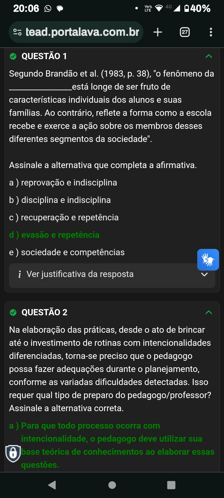 20:06 Vo 4G LTE 140% tead.portalava.com.br + 27 QUESTÃO 1 Segundo Brandão et al. (1983, p. 38), "o fenômeno da está longe de ser fruto de características individuais dos alunos e suas famílias. Ao contrário, reflete a forma como a escola recebe e exerce a ação sobre os membros desses diferentes segmentos da sociedade". Assinale a alternativa que completa a afirmativa. a) reprovação e indisciplina b) disciplina e indisciplina c) recuperação e repetência d) evasão e repetência e) sociedade e competências i Ver justificativa da resposta QUESTÃO 2 Na elaboração das práticas, desde o ato de brincar até investimento de rotinas com intencionalidades diferenciadas, torna-se preciso que O pedagogo possa fazer adequações durante planejamento, conforme as variadas dificuldades detectadas. Isso requer qual tipo de preparo do pedagogo/professor? Assinale a alternativa correta. a) Para que todo processo ocorra com intencionalidade, pedagogo deve utilizar sua base teórica de conhecimentos ao elaborar essas questões.