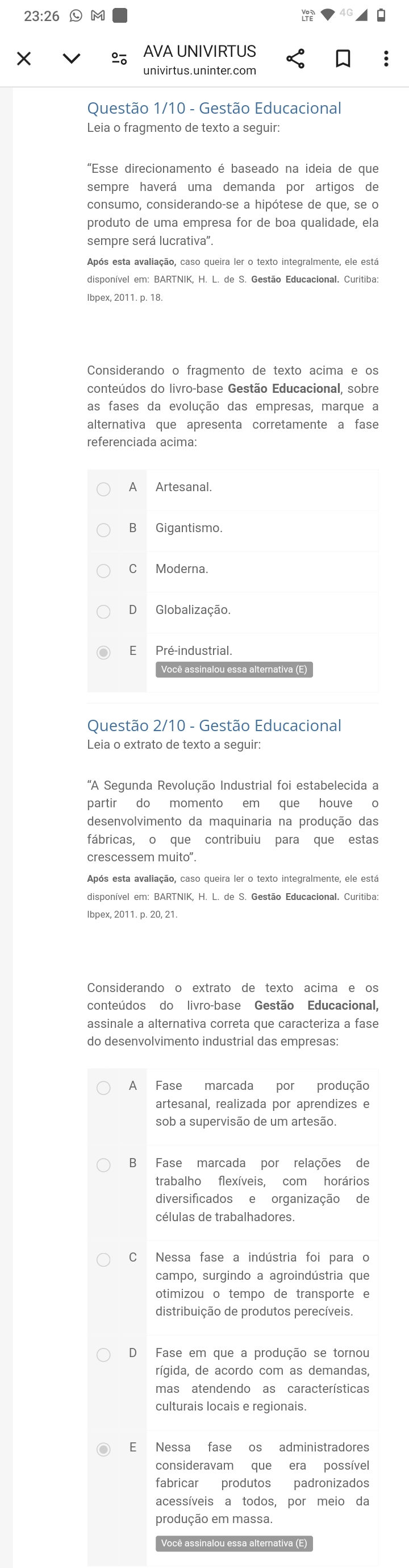 23:26 M 4G LTE AVA UNIVIRTUS X univirtus.uninter.com Questão 1/10 Gestão Educacional o fragmento de texto a seguir: "Esse direcionamento é baseado na ideia de que sempre haverá uma demanda por artigos de consumo, considerando-se a hipótese de que, se o produto de uma empresa for de boa qualidade, ela sempre será lucrativa". Após esta avaliação, caso queira texto integralmente, ele está disponível em: BARTNIK, H. L. de S. Gestão Curitiba: Ibpex, 2011. p. 18. Considerando o fragmento de texto acima e os conteúdos do livro-base Gestão Educacional, sobre as fases da evolução das empresas, marque a alternativa que apresenta corretamente a fase referenciada acima: A B Moderna. D Globalização. E Você assinalou essa alternativa (E) Questão 2/10 - Gestão Educacional Leia o extrato de texto a seguir: "A Segunda Revolução Industrial foi estabelecida a partir do momento em que houve o desenvolvimento da maquinaria na produção das fábricas, o que contribuiu para que estas crescessem muito". Após esta avaliação, caso queira ler o texto integralmente, ele está disponível em: H. L. de S. Gestão Educacional. Curitiba: Ibpex, 2011 p. 21. Considerando o extrato de texto acima e os conteúdos do livro-base Gestão Educacional, assinale a alternativa correta que caracteriza a fase do desenvolvimento industrial das empresas: A Fase marcada por produção artesanal, realizada por aprendizes e sob a supervisão de um artesão. B Fase marcada por relações de trabalho flexíveis, com horários diversificados e organização de células de trabalhadores. C Nessa fase a indústria foi para o campo, surgindo a agroindústria que otimizou o tempo de transporte e distribuição de produtos perecíveis. D Fase em que a produção se tornou rígida, de acordo com as demandas, mas atendendo as características culturais locais e regionais. E Nessa fase os administradores consideravam que era possível fabricar produtos padronizados acessíveis a todos, por meio da produção em massa. Você assinalou essa alternativa (E)