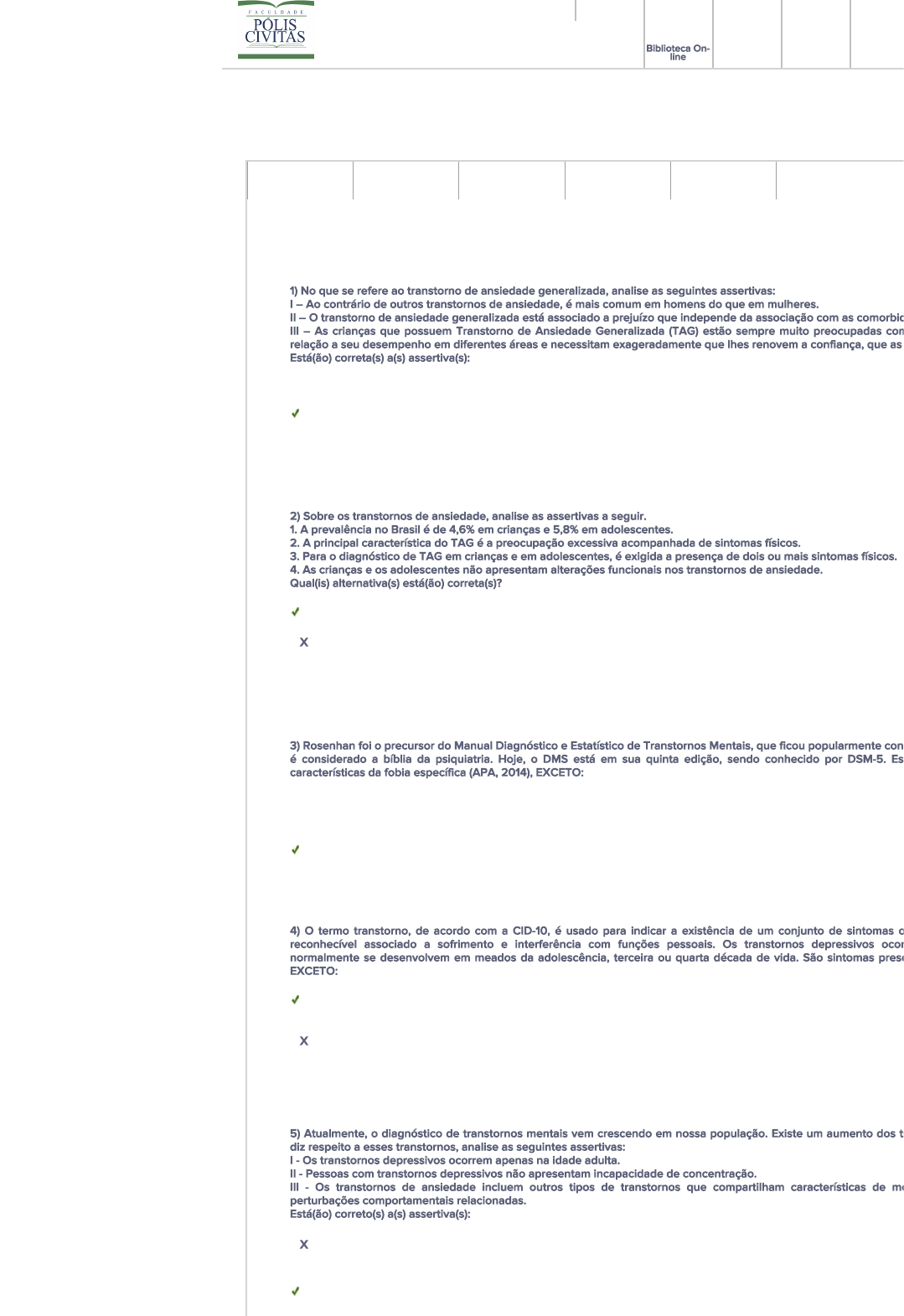 Biblioteca On- line TRANSTORNOS PSIQUIATRICOS NA INFANCIA E ADOLESCENCIA (TS23) Início 09/05/2023 - Término 31/12/2025 AVALIAÇÃO: AVALIAÇÃO FINAL - TRANSTORNOS PSIQUIÁTRICOS NA INFÂ 1) No que se refere ao transtorno de ansiedade generalizada, analise as seguintes assertivas: I – Ao contrário de outros transtornos de ansiedade, é mais comum em homens do que em mulheres. II – O transtorno de ansiedade generalizada está associado a prejuízo que independe da associação com as comorbid III – As crianças que possuem Transtorno de Ansiedade Generalizada (TAG) estão sempre muito preocupadas com relação a seu desempenho em diferentes áreas e necessitam exageradamente que lhes renovem a confiança, que as Está(ão) correta(s) a(s) assertiva(s): a) Apenas I e II. b) Apenas I e III. c) I, II, III. d) Apenas II e III. e) Apenas I. Resposta Correta Pontuação: 1,0 2) Sobre os transtornos de ansiedade, analise as assertivas a seguir. 1. A prevalência no Brasil é de 4,6% em crianças e 5,8% em adolescentes. 2. A principal característica do TAG é a preocupação excessiva acompanhada de sintomas físicos. 3. Para o diagnóstico de TAG em crianças e em adolescentes, é exigida a presença de dois ou mais sintomas físicos. 4. As crianças e os adolescentes não apresentam alterações funcionais nos transtornos de ansiedade. Qual(is) alternativa(s) está(ão) correta(s)? a) Apenas 1 e 2. b) Apenas 2 e 3. Xc) Apenas 1, 3 e 4. d) Apenas 2, 3 e 4. e) 1, 2, 3 e 4. Resposta Errada Pontuação: 0,0 3) Rosenhan foi o precursor do Manual Diagnóstico e Estatístico de Transtornos Mentais, que ficou popularmente con é considerado a bíblia da psiquiatria. Hoje, o DMS está em sua quinta edição, sendo conhecido por DSM-5. Es características da fobia específica (APA, 2014), EXCETO: a) Medo ou ansiedade acentuados acerca de um objeto ou de uma situação. b) O objeto ou situação fóbica quase invariavelmente provoca uma resposta imediata de medo ou de ansiedade. c) O objeto ou situação fóbica é ativamente evitado ou suportado com intensa ansiedade ou sofrimento. d) O medo ou ansiedade é desproporcional em relação ao perigo real. e) O medo, a ansiedade ou a esquiva é persistente, geralmente com duração mínima de três meses. Resposta Correta Pontuação: 1,0 4) O termo transtorno, de acordo com a CID-10, é usado para indicar a existência de um conjunto de sintomas o reconhecível associado a sofrimento e interferência com funções pessoais. Os transtornos depressivos ocor normalmente se desenvolvem em meados da adolescência, terceira ou quarta década de vida. São sintomas prese EXCETO: a) Humor deprimido na maior parte do dia, por pelo menos 3 dias da semana. b) Diminuição do interesse ou do prazer em todas ou quase todas as atividades. c) Fadiga ou perda de energia. Xd) Capacidade diminuída para pensar ou para se concentrar. e) Sentimentos de inferioridade e comportamento agressivo em crianças. Resposta Errada Pontuação: 0,0 5) Atualmente, o diagnóstico de transtornos mentais vem crescendo em nossa população. Existe um aumento dos t diz respeito a esses transtornos, analise as seguintes assertivas: I - Os transtornos depressivos ocorrem apenas na idade adulta. II - Pessoas com transtornos depressivos não apresentam incapacidade de concentração. III - Os transtornos de ansiedade incluem outros tipos de transtornos que compartilham características de me perturbações comportamentais relacionadas. Está(ão) correto(s) a(s) assertiva(s): Xa) I, II, III. b) Apenas a II e a III. c) Apenas a I e a III. d) Apenas a I. e) Apenas a III. Meus Cursos Dados Acadêmicos Comunicação Sala Virtual Biblioteca Sumário Bibliografia Fórum Tutoria Material de Apoio Sala de Aula Virtual 13/05/24, 23:22 Sistema Matheus Acadêmico https://avapolis.com.br/index_aluno.asp?id_matr=412435&curso=981&id_curso=424&id_aluno=35740&0.19757474532517172_1715652783676… 1/2 https://avapolis.com.br/Aluno/app.asp https://bibliogratuita.curatoriaeditora.com.br/biblioIntegracao.php?accesskey=zcetrsl8lo https://avapolis.com.br/Aluno/agenda_academico_nv.asp https://avapolis.com.br/Aluno/mensagens.asp https://avapolis.com.br/Aluno/relMeusCursos.asp Resposta Errada Pontuação: 0,0 6) Os seguintes sintomas foram relatados pelos pais de um adolescente de 13 anos na consulta psiquiátr comportamentais na escola, realizar pichações em muros na companhia de outros adolescentes, não seguir regras comportamento cruel com colegas na escola. Os sintomas condizem com qual diagnóstico? Xa) TDAH. b) Transtorno opositor-desafiador. c) Transtorno de personalidade antissocial. d) TDAH e transtorno opositor-desafiador. e) Transtorno de conduta. Resposta Errada Pontuação: 0,0 7) Na clínica infantil, o quadro clínico de alguns pacientes diagnosticados com transtorno de oposição desafiante (TO de conduta. O DSM traz uma nova caracterização do comportamento dos pacientes com transtorno da conduta. Ess em: a) Responsabilização dos outros pelos próprios erros. b) Sentimento de raiva, ressentimento e vingança em grande parte do tempo. Xc) Ações deliberadamente incomodativas. d) Desobediência às regras dos adultos. e) Crueldade física com pessoas e com animais. Resposta Errada Pontuação: 0,0 8) Com relação ao transtorno de conduta, assinale V nas assertivas verdadeiras e F nas falsas. ( ) As crianças e os adolescentes com o transtorno não assumem provocações, ameaças ou comportamento intimidad ( ) O início do transtorno se dá entre 14 e 16 anos. ( ) Os primeiros sintomas tendem a ser menos graves, ao passo que os problemas de conduta que surgem posteriorm A ordem correta de preenchimento corresponde a: a) V – F – F. b) V – V- V. c) F – F- F. d) F – V - V. e) F – F – V. Resposta Correta Pontuação: 1,0 9) Padrões agressivos de comportamento estão entre os motivos mais frequentes de crianças e adolescentes ser psiquiátrica, e costumam estar ligados a diversos f