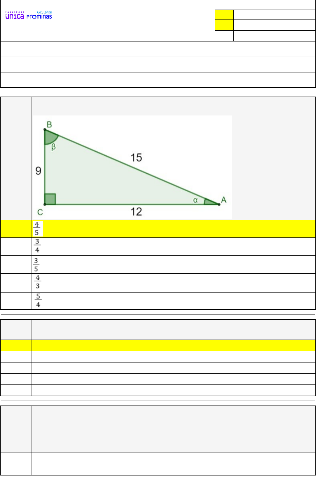 Pincel Atômico - 09/05/2024 14:55:04 1/3 ELVIS DOS SANTOS RODRIGUES CAMINHO DO CONHECIMENTO Atividade finalizada em 09/05/2024 14:54:59 (tentativa: 2) LEGENDA Resposta correta na questão # Resposta correta - Questão Anulada X Resposta selecionada pelo Aluno Disciplina: FUNDAMENTOS DA MATEMÁTICA [capítulos - 1] - Avaliação com questões, com o peso total de 1,67 pontos Turma: Segunda Graduação: Segunda Graduação 6 meses - Licenciatura em Matemática - Grupo: FPD-JANEIRO/2024 - SGegu0A050224 [114389] Aluno(a): 91341478 - ELVIS DOS SANTOS RODRIGUES - Respondeu 7 questões corretas, obtendo um total de 1,46 pontos como nota Questão 001 Analisando o triângulo retângulo, com suas medidas dadas em centímetros, podemos afirmar que o valor do seno do ângulo β é igual a: X A) B) C) D) E) Questão 002 Qual é a medida do lado oposto ao ângulo de 30°, em um triângulo, sabendo que os outros dois lados medem 2 e √3? X A) 1. B) 2,5. C) 1,5. D) 2. E) 3. Questão 003 Um engenheiro foi contratado para calcular a altura de um prédio sem subir nele. A uma distância de 40 metros, constatou-se que era possível construir o seguinte triângulo retângulo. Podemos afirmar que a altura do prédio é de, aproximadamente: (Dados: use √3 = 1,7) A) 20 m. B) 23,8 m. Pincel Atômico - 09/05/2024 14:55:04 2/3 C) 23 m. D) 21,5 m. X E) 22,7 m. Questão 004 No triângulo a seguir temos dois ângulos, um medindo 45°, outro medindo 105°, é um dos lados medindo 90 metros. Com base nesses valores determine a medida de x. A) 200√2 B) 90√2 C) 100 X D) 100√2 E) 25 Questão 005 (EEAR- 2019) Analisando a figura, pode-se afirmar corretamente que o valor de x é: A) 6√2-4 B) 6(2-√2) C) 12-2√2 D) 16-√2 X E) Questão 006 Um terreno retangular será dividido ao meio, pela sua diagonal, formando dois triângulos retângulos. A metade desse terreno será cercada com 4 fios de arame farpado. Sabendo que as dimensões desse terreno são de 20 metros de largura e 21 metros de comprimento, qual será a metragem mínima gasta de arame? A) 70 metros. B) 300 metros. C) 140 metros. X D) 280 metros. E) 29 metros. Pincel Atômico - 09/05/2024 14:55:04 3/3 Questão 007 Um avião voa em velocidade e altitude constantes, segundo uma reta que o levará a passar diretamente sobre uma estação de radar no solo. No instante em que o avião está a 18.000 metros acima dela, um observador nela postado, com auxílio de aparelhos, percebe que o ângulo de elevação do avião é de 30° e que está aumentado a razão de 0,5° por segundo. Qual será o deslocamento horizontal desse avião, passado meio minuto. Considere √3 ≅1,71. A) 6588 B) 36.000 m X C) 13.140 D) 31.177 m E) 25.456 m Questão 008 A área do triângulo retângulo que possui base medindo 5 cm e hipotenusa medindo 13 cm é igual a: A) 12 cm² B) 16 cm² C) 24 cm² X D) 30 cm² E) 60 cm²