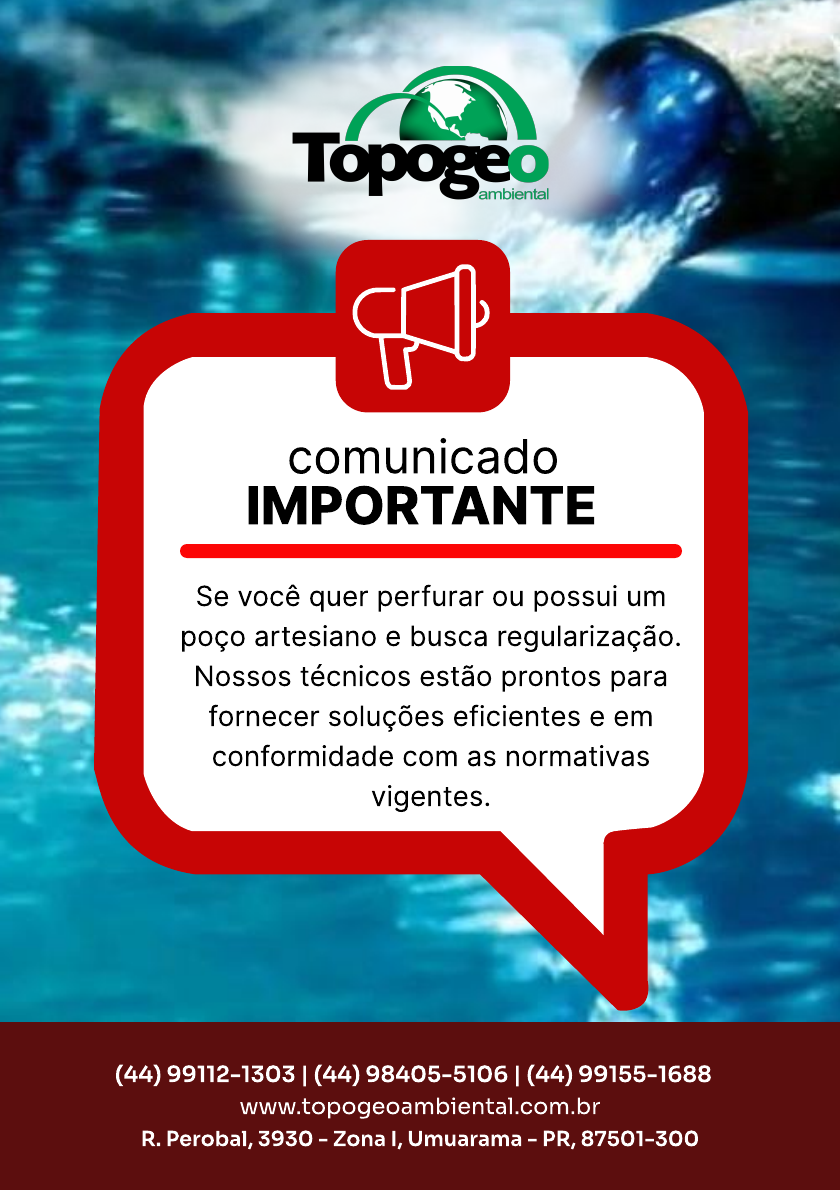 (44) 99112-1303 | (44) 98405-5106 | (44) 99155-1688 www.topogeoambiental.com.br R. Perobal, 3930 - Zona I, Umuarama - PR, 87501-300 comunicado Se você quer perfurar ou possui um poço artesiano e busca regularização. Nossos técnicos estão prontos para fornecer soluções eficientes e em conformidade com as normativas vigentes. IMPORTANTE SERVIÇOS – Licenciamento Ambiental – Adequação de Propriedade Rural – Geoprocessamento Ambiental – Georreferenciamento – Outorga de Uso D’água – Direito Ambiental – Gerenciamento de Resíduos – Regularização de Reserva Florestal Legal – Recuperação de Áreas Degradadas – Plano de Gerenciamento de Resíduos Sólidos – Ratificação de Títulos em Faixa de Fronteira – Projetos de Saneamento – Cadastro Ambiental Rural: CAR – Cadastro Técnico Federal: IBAMA – Cumprimento de TCRA: Termo de Compromisso de Recuperação Ambiental – CADRI: Certificado de Movimentação de Resíduos de Interesse Ambiental (44) 99112-1303 | (44) 98405-5106 | (44) 99155-1688 www.topogeoambiental.com.br R. Perobal, 3930 - Zona I, Umuarama - PR, 87501-300